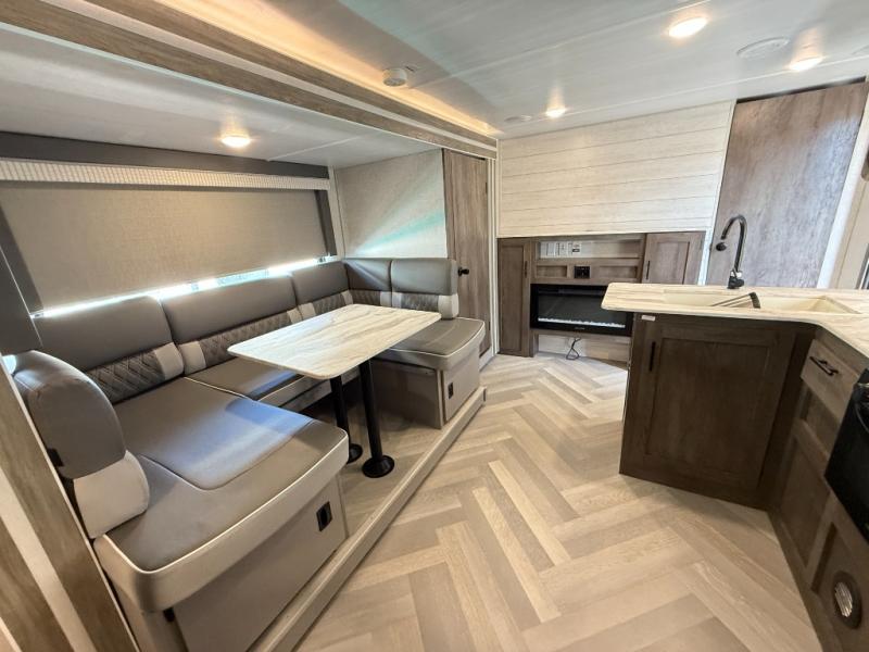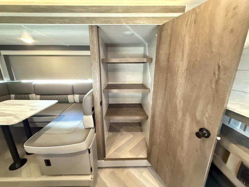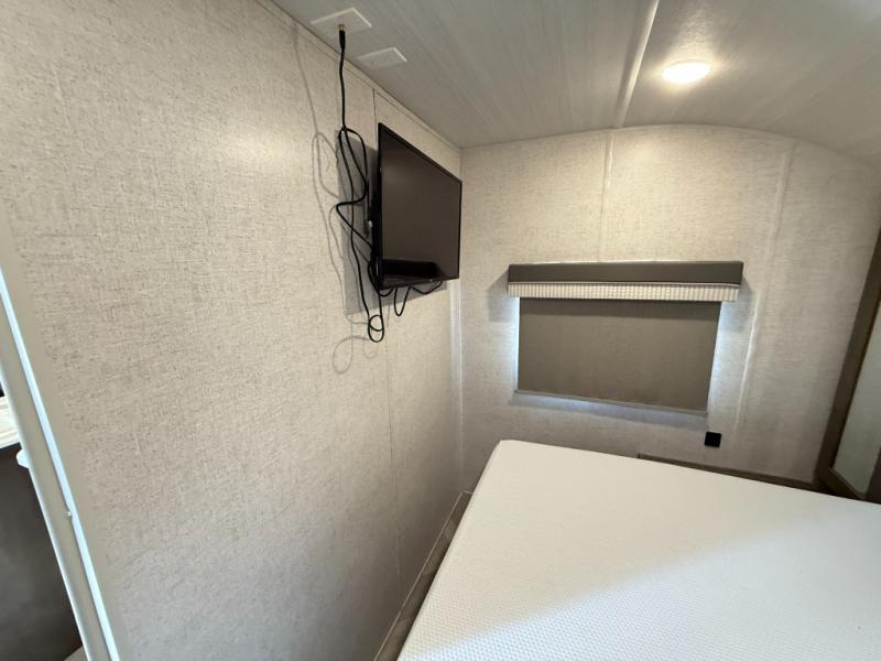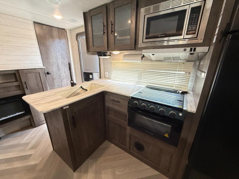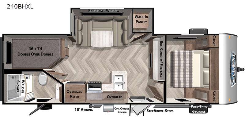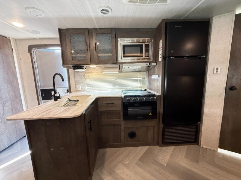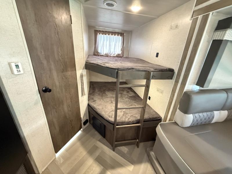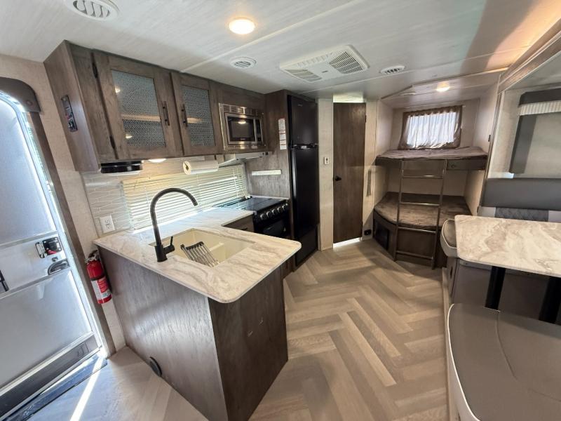 This travel trailer is big enough for the whole family to join in on the fun and weighs in at less than 6,000 lbs! The kiddos can sleep on the corner 46" 74" double-over-double bunk beds, and you can sleep on the queen bed inside the front private bedroom, plus the U-shaped dinette can transform into an extra sleeping space. It also has a panoramic window for you to look out at your beautiful scenery while you eat. The rear corner bathroom has everything you will need to get squeaky clean each morning, as well as an exit/entrance door to the unit. The oversized 11 cu. ft. refrigerator will keep your perishables fresh and the three burner cooktop is just waiting for you to create a delicious meal, plus the walk-in pantry is big enough to store everyone's favorite snacks!