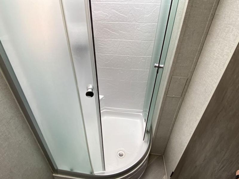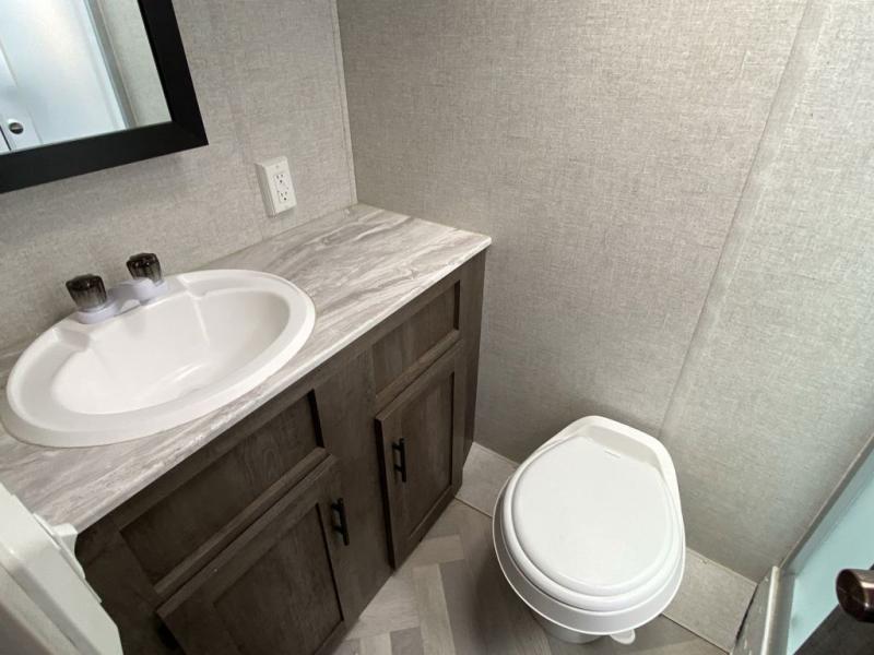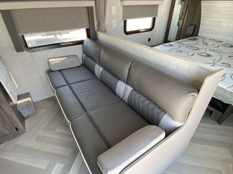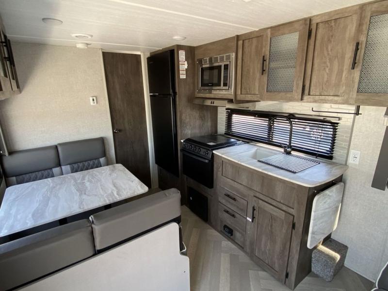 Do you need a spacious rear bathroom and a front queen bed? Well then, check out this travel trailer! There are closets on either side of the queen bed and a privacy curtain that can be drawn at night. Grab some eggs and bacon from the oversized 11 cu. ft. refrigerator and fry them up on the three burner cooktop then head to the booth dinette to enjoy eating them there comfortably. The sofa is a great place to wind down your nights, especially after showering in the walk-in shower!