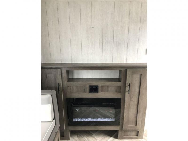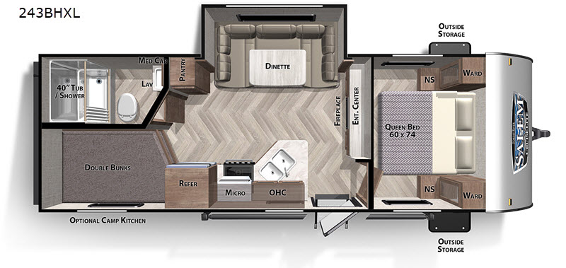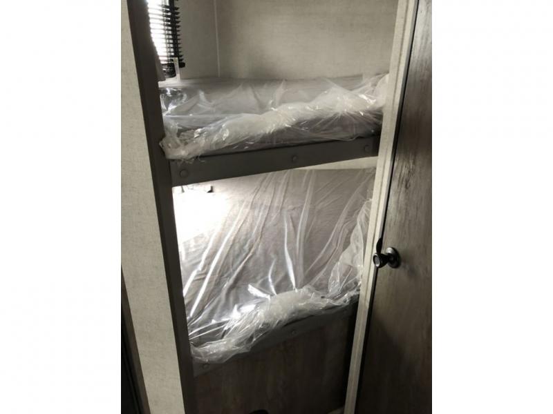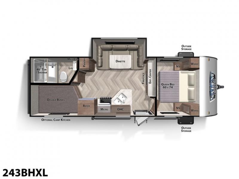 Grab your favorite camping chair and load it up into the front exterior storage area of this travel trailer! There are plenty of comfortable sleeping spaces between the rear corner double bunk beds and the RV queen bed inside the front private bedroom. The bedroom also has wardrobes and nightstands on either side of the bed too. When you're not using the U-shaped dinette slide to enjoy a meal or watching a movie with the entertainment center, you can transform it into an extra sleeping space. The rear corner bathroom has a 40" tub/shower for you to rinse all the sand out of your hair from your beach day. You can also choose to add the optional camp kitchen to enjoy breakfast outdoors!