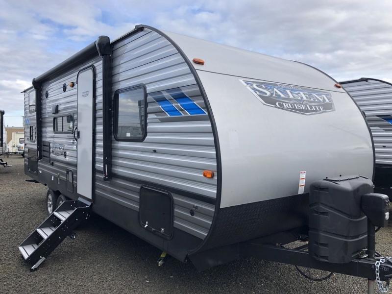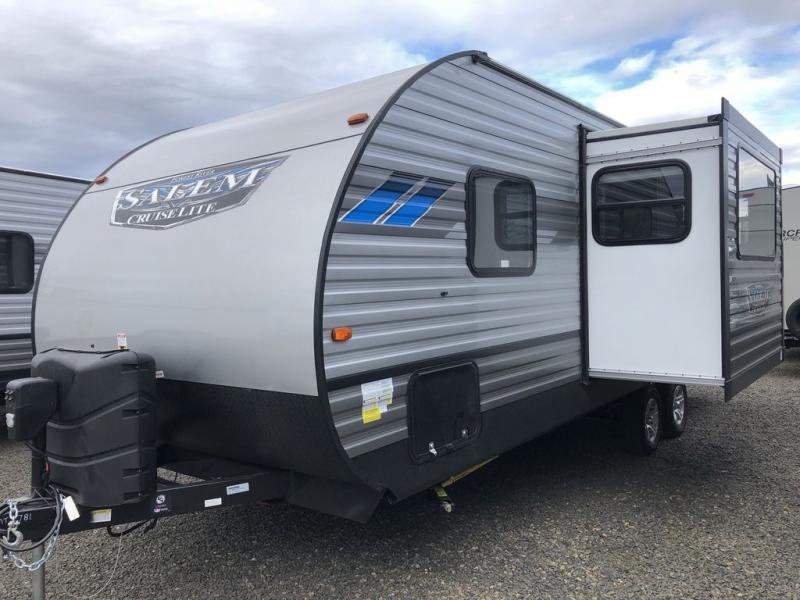 Each one of these Forest River Salem Cruise Lite travel trailers offer quality and value with a list of great features! Each model comes with the Best in Class Value package which includes an upgraded appliance package, true stabilizer jacks with JT StrongArms, USB port package, and Stow N Go storage below the bed and dinette. The modern cloth roller shades come with AutoStop, and the SolidStep double step ensures you will safely enter the unit. You will enjoy looking out at your beautiful scenery each morning through the extra large panoramic window on the main slide. Check out a model in person today!