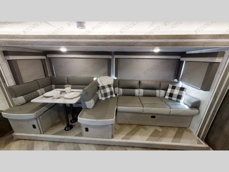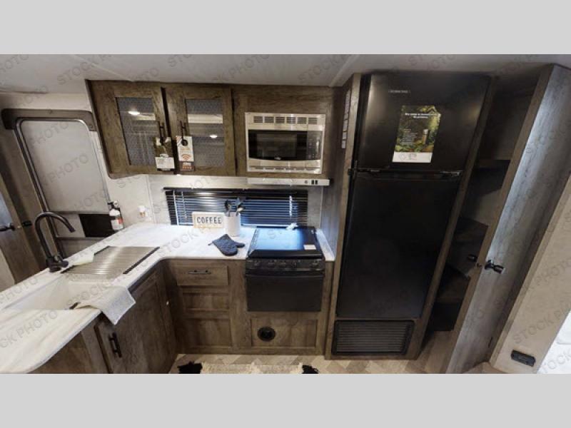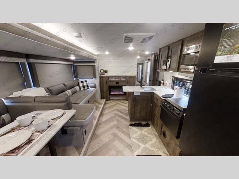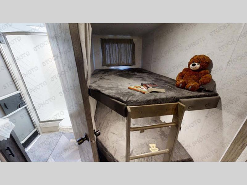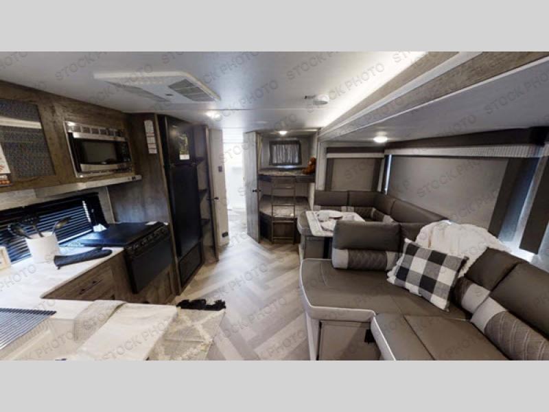 If you're looking for a travel trailer that will meet your family's needs then this one is for you! The kiddos will enjoy a good night's rest on the rear corner double bunk beds and you will enjoy a good night's rest on the queen bed inside the front private bedroom. You can also transform the U-shaped dinette and Versa-lounge into extra sleeping spaces. One of the dual entrances leads directly into the rear corner bathroom which has a walk-in shower for you to get squeaky clean each morning. The walk-in pantry is big enough to store your favorite snacks and the oversized 11 cu. ft. refrigerator will keep your beverages nice and cold. You can also choose to add the optional exterior camp kitchen to enjoy breakfast outdoors!