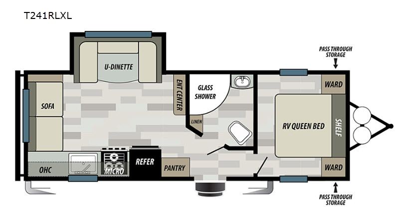 Load up your camping chairs, outdoor games and even the fishing poles in the exterior pass through storage before heading out for a weekend of outside fun! You will find lots of storage inside as well in the overhead cabinets, the wardrobes, and in the pantry. You will soon find out that the rear living area, and the U-shaped dinette slide out provide you with more interior space as well as additional sleeping space. In the kitchen there is a cooktoop, a stainless steel microwave plus a refrigerator so you can make whatever meal you like. And the front private bedroom includes an RV queen bed that will provide a comfortable night's rest after playing all day.