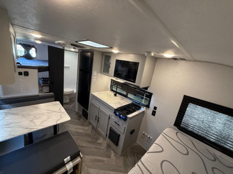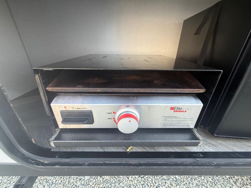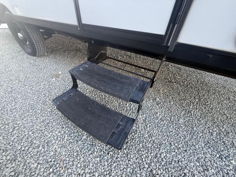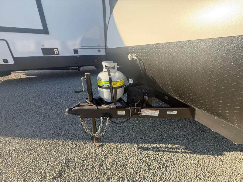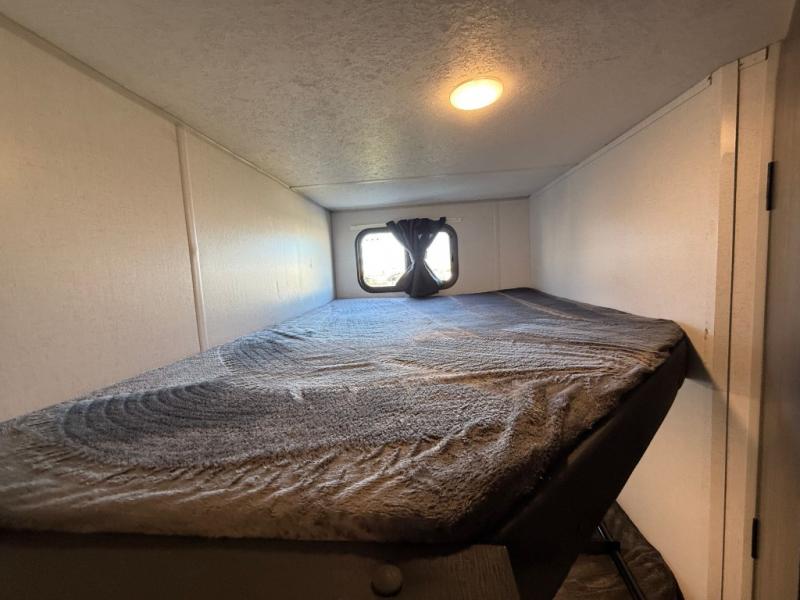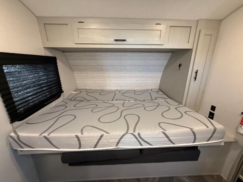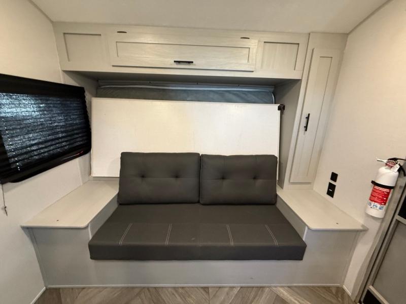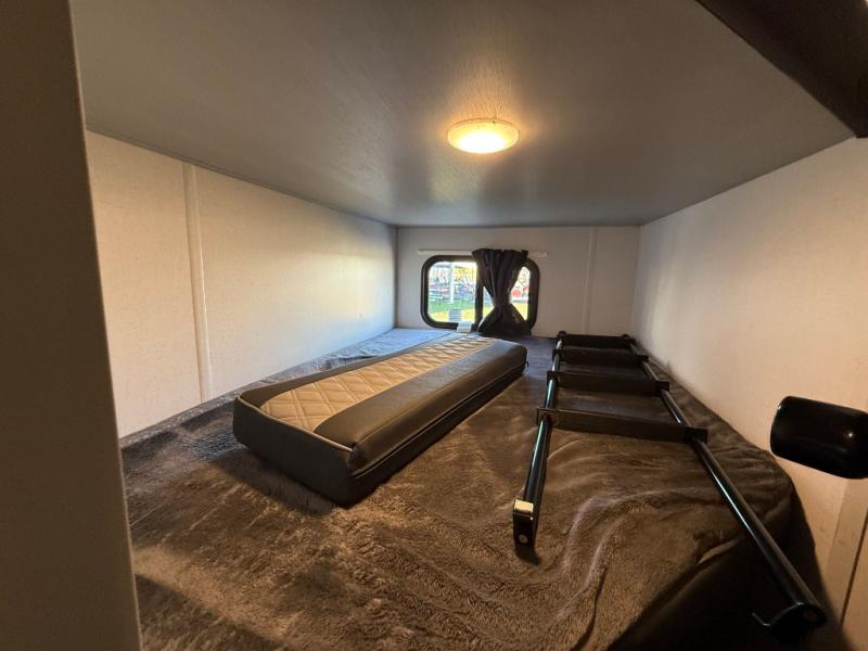 How would having an outdoor 1.6-cu. ft. refrigerator with an optional LP griddle and a 14' power awning with adjustable legs sound with your next trailer? You will also find full pass-through storage for your fishing poles, charcoal, and camping chairs. Inside, you can sleep on your own RV queen Murphy bed at night, and relax on the booth dinette during the day. The double-size bunks with storage will be perfect for extra travelers, and the full bathroom will keep everyone refreshed for the next activity. And don't forget about the USB charging outlets, the upgraded appliance package, and the panoramic window.