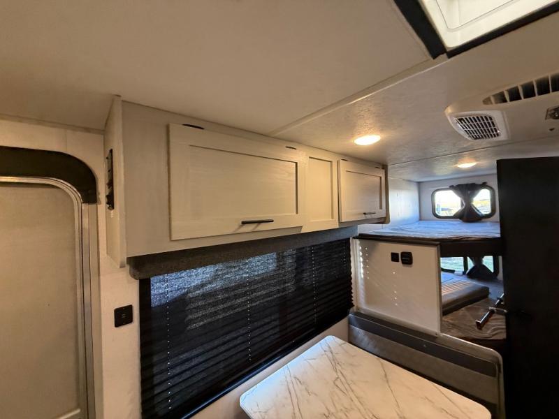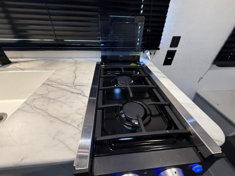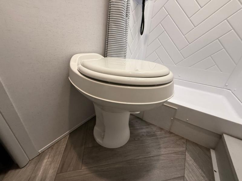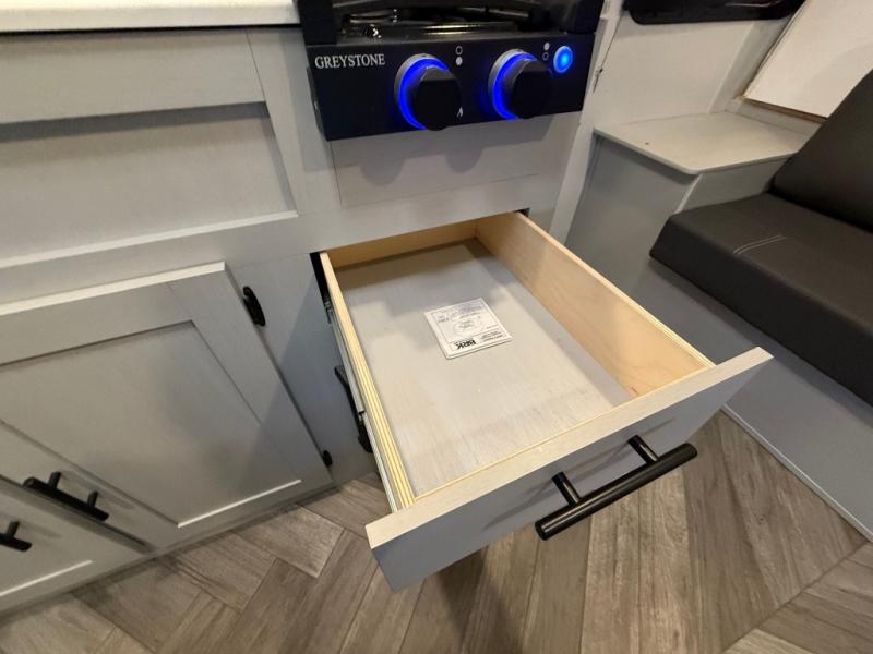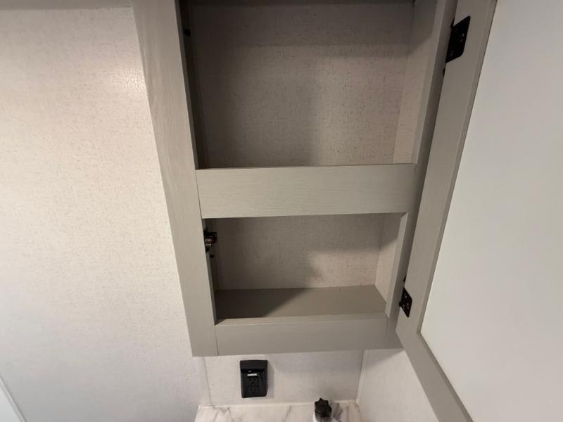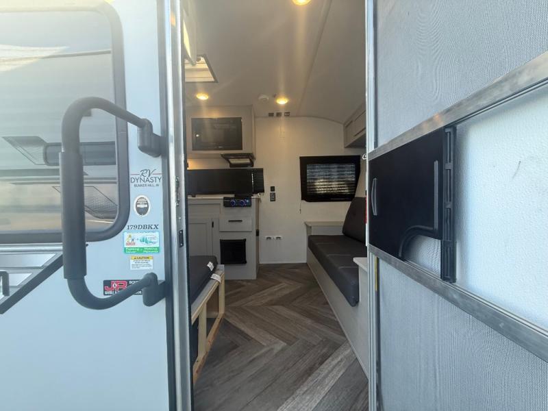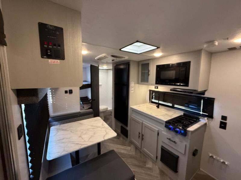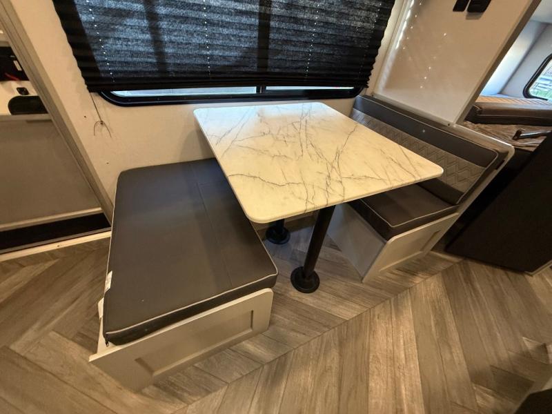 How would having an outdoor 1.6-cu. ft. refrigerator with an optional LP griddle and a 14' power awning with adjustable legs sound with your next trailer? You will also find full pass-through storage for your fishing poles, charcoal, and camping chairs. Inside, you can sleep on your own RV queen Murphy bed at night, and relax on the booth dinette during the day. The double-size bunks with storage will be perfect for extra travelers, and the full bathroom will keep everyone refreshed for the next activity. And don't forget about the USB charging outlets, the upgraded appliance package, and the panoramic window.