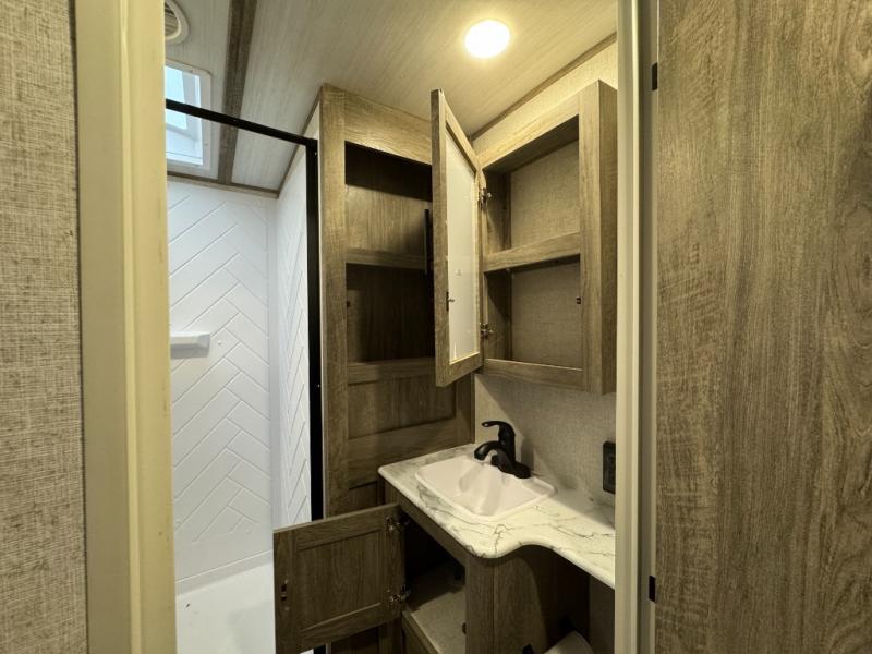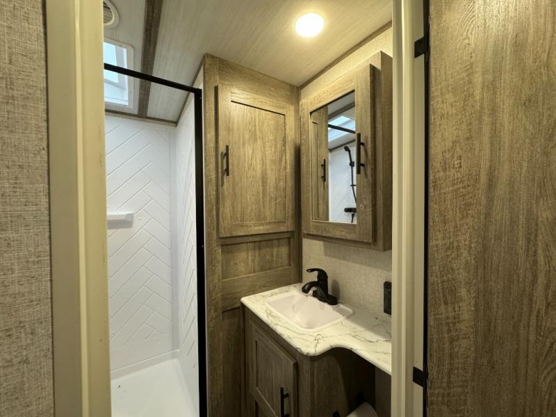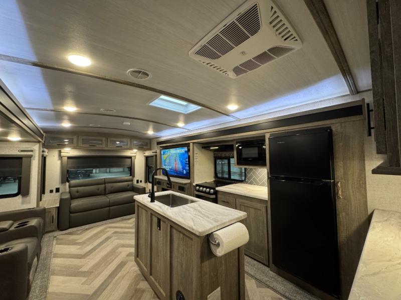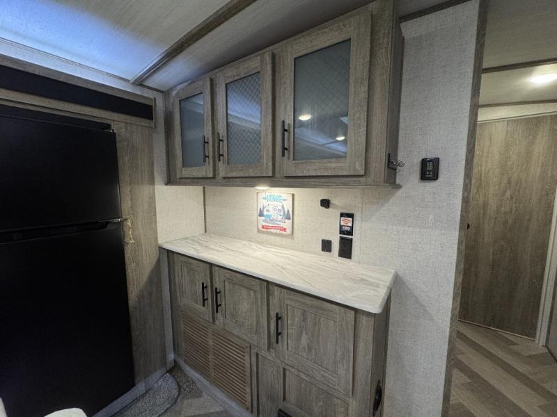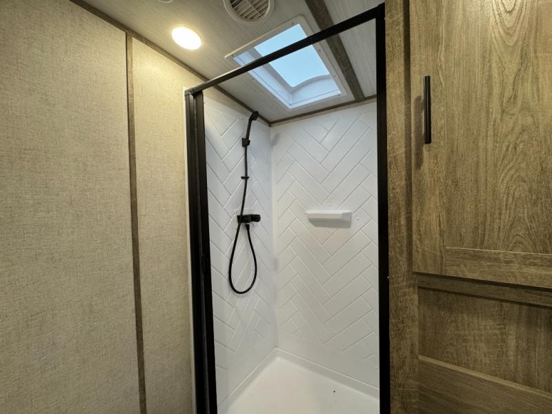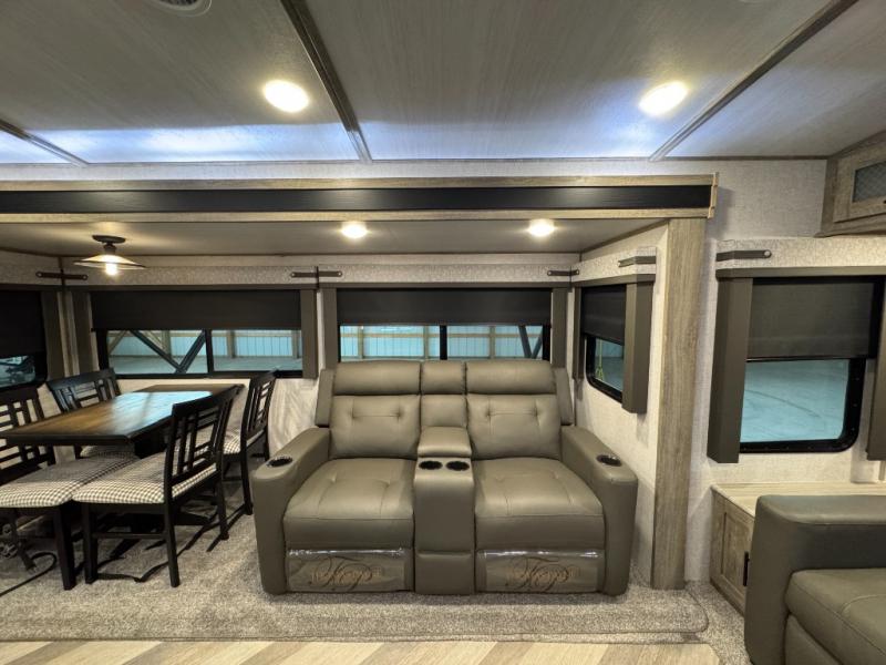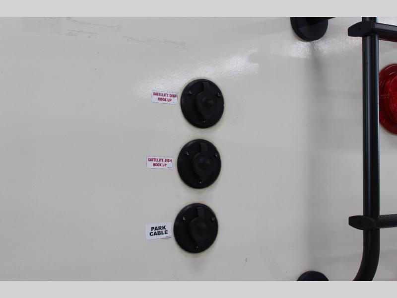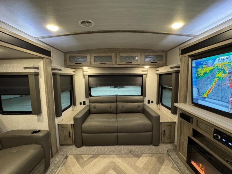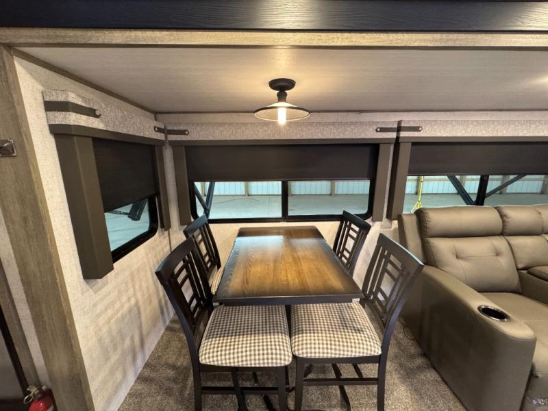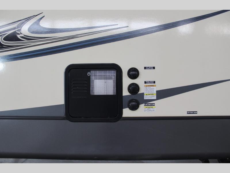 Step inside this luxurious travel trailer and see all that it has to offer! You will enjoy a good night's rest each night on the queen bed with wardrobes on either side to keep your hanging clothes wrinkle free, and if you have a couple of guests then you can convert the rear tri-fold sofa or the booth dinette into a sleeping space. The 30" x 36" walk-in shower with a skylight above invites you to take a hot, steamy shower after a fun-filled day outdoors. Once you're cleaned up, you can grab some leftovers from the 10.7 cu. ft. residential refrigerator and warm it up in the microwave then head to the theatre seating and watch your favorite movie on the 50" LED TV with a 32" glass front electric fireplace below!
