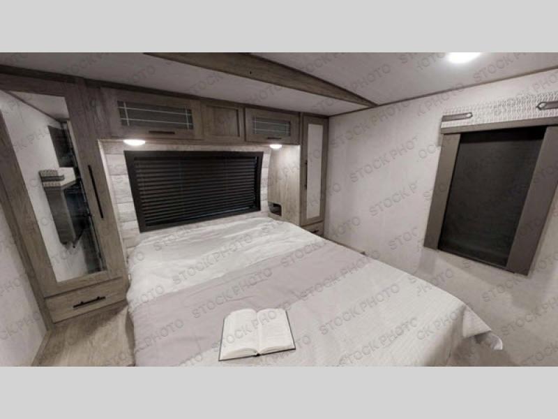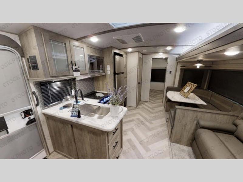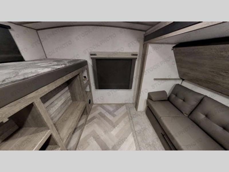 You won't believe all of the luxury features this travel trailer has from the double entry doors, the U-shaped dinette, and the panoramic windows in the slide out to the bath and a half! The chef of your group will love cooking indoors with full amenities, and outdoors with the outside kitchen/bar so they can breathe in some fresh air while they sip on their favorite drink. The kids or your friends will love having their own private bunkhouse with a bunk above an entertainment center with storage below, and another bunk above a Versa queen convertible bed/sofa, and you will love resting on the queen bed in the front private bedroom. And the Texas-sized pass-through storage area is sure to be big enough for your camping gear too!