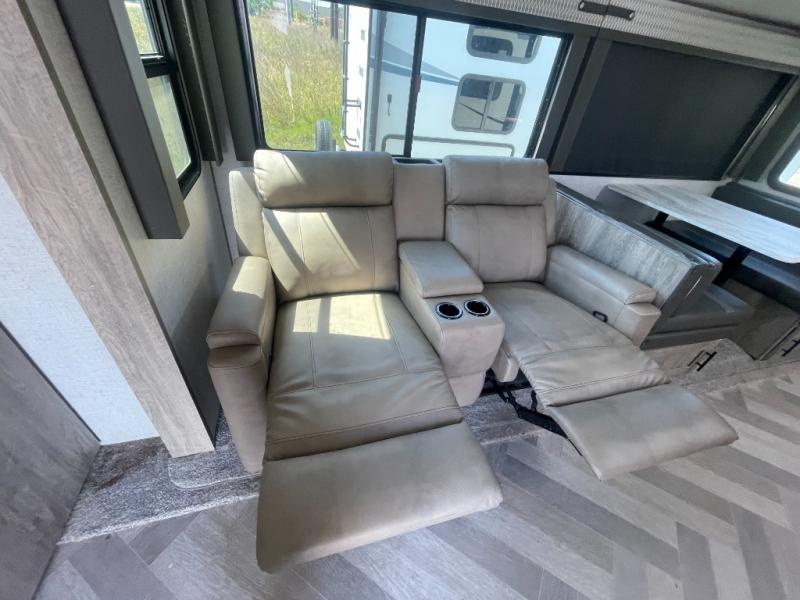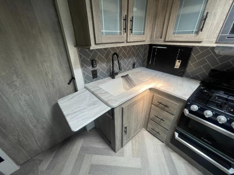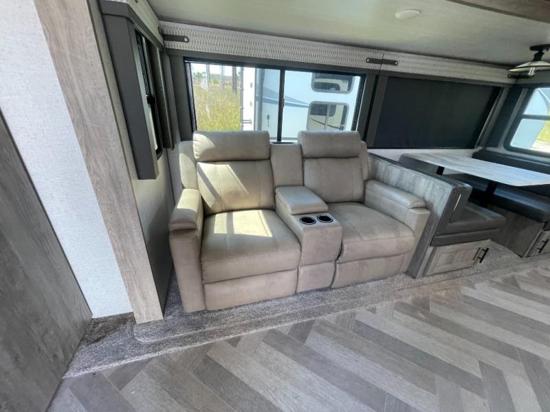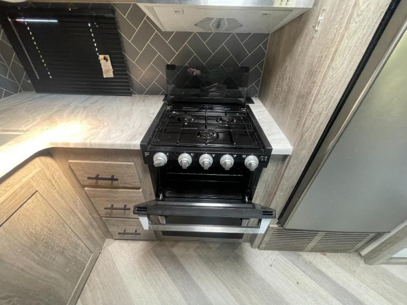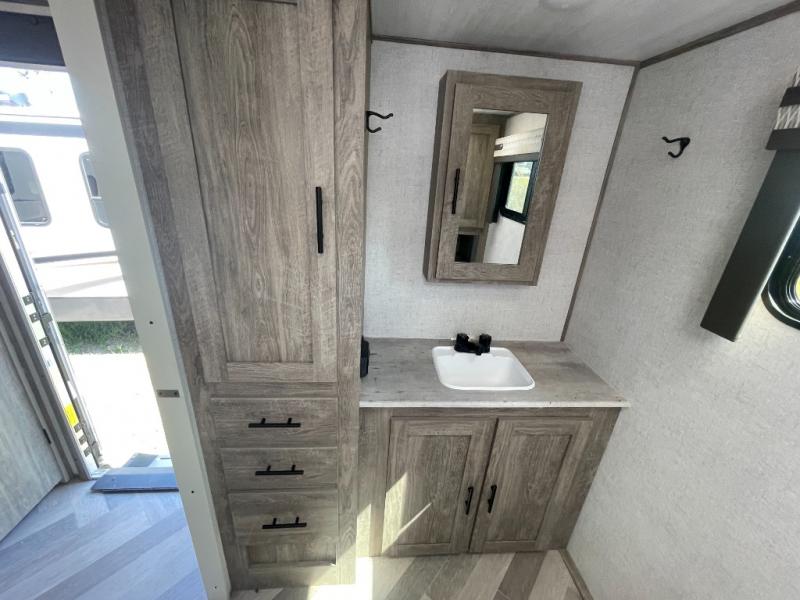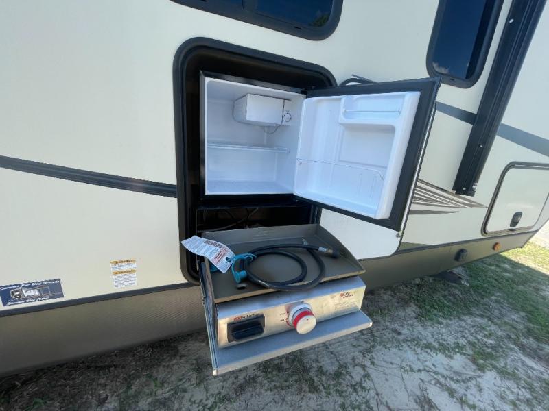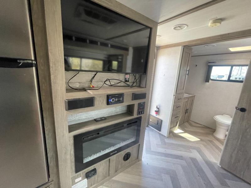 Once you step inside this spacious Salem Hemisphere Hyper-Lyte travel trailer, you'll want to take it out every other weekend for fun with your friends or family! The large slide out opens up the living and kitchen area and allows everyone to move around freely. The chef of the family can prepare dinner on the three-burner range, and they'll love having a walk-in pantry to store all the canned goods. After a day at the lake, get cleaned up in the full rear bath before heading to the living area to relax on the theater seating while you watch a show by the fireplace. This trailer includes a front private bedroom with an RV queen bed and space to walk around the bed. You can easily store all your hiking gear in the Texas sized pass-through storage, and cold drinks can go in the outdoor fridge!