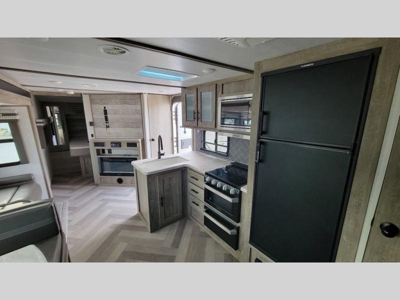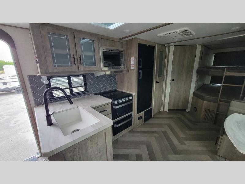 This Salem Hemisphere Hyper-Lyte travel trailer has it all: two entry doors, a private bedroom for you, double-size bunks for the kids or your friends, plus a large slide out for more interior space! After you've explored for the day, come back to this trailer to prepare dinner on the three-burner range or in the microwave. The rear corner bath includes a walk-in shower with skylight and it's own exterior entry door, so you can easily use the restroom and get back outside without going through the whole trailer. And the exterior offers a Texas-size pass-through storage, a 16' awning, and an outside kitchen/bar to enjoy outdoors.