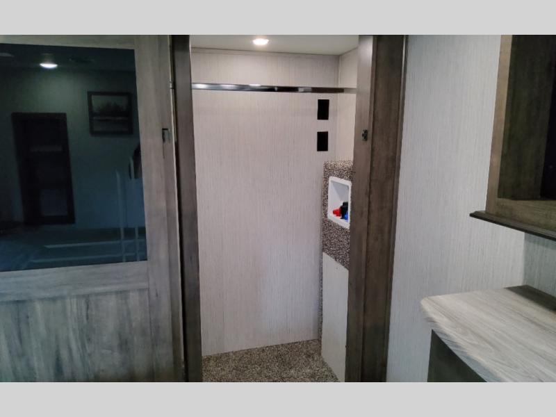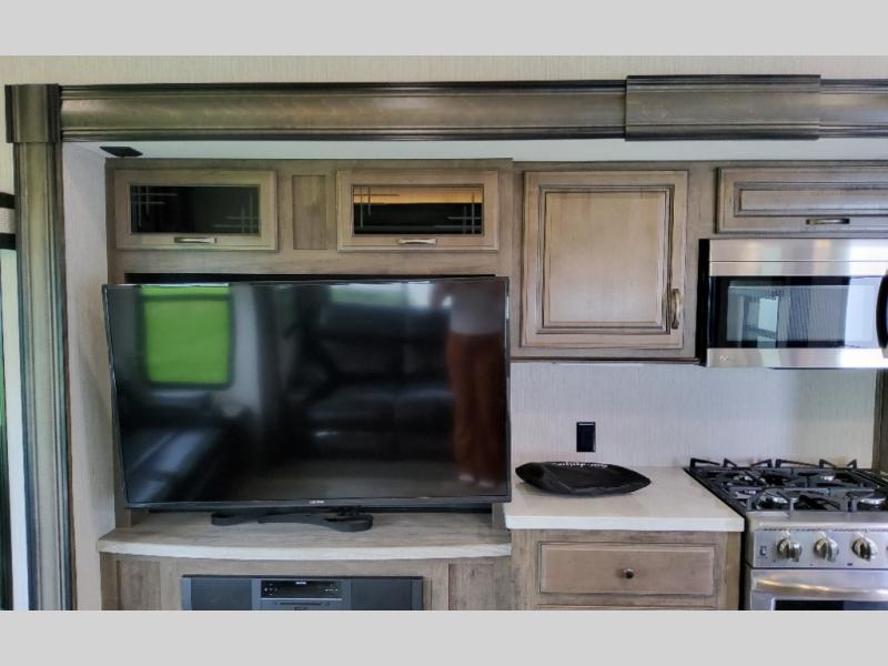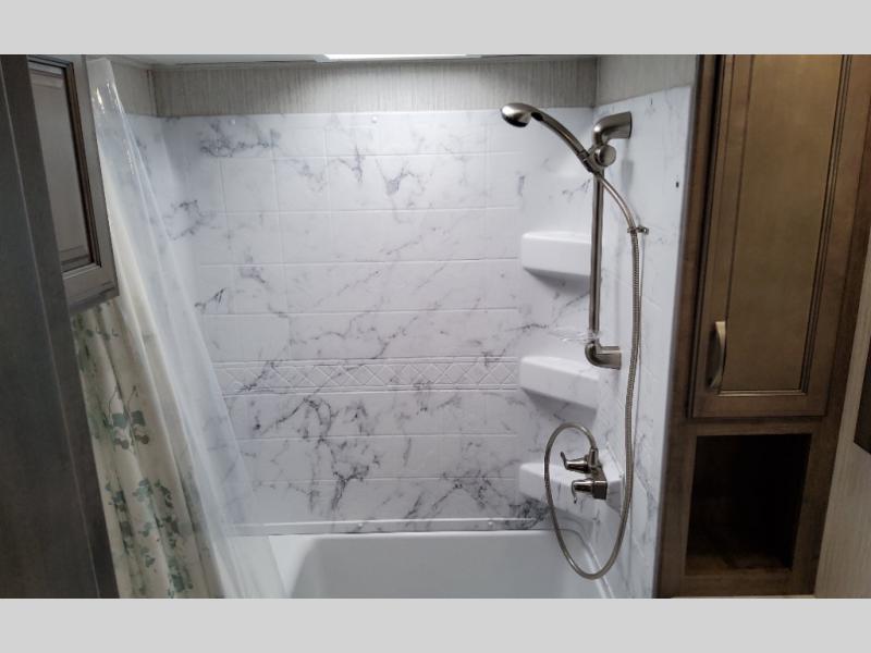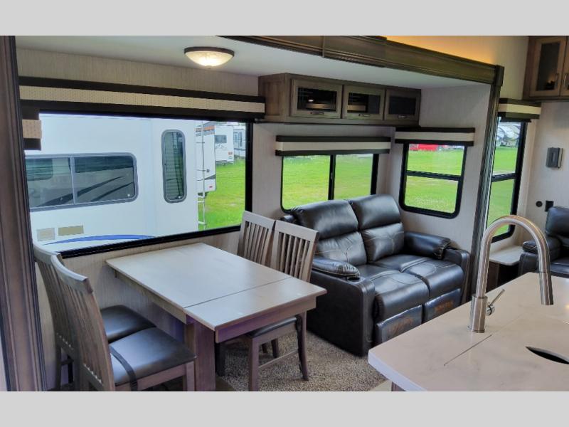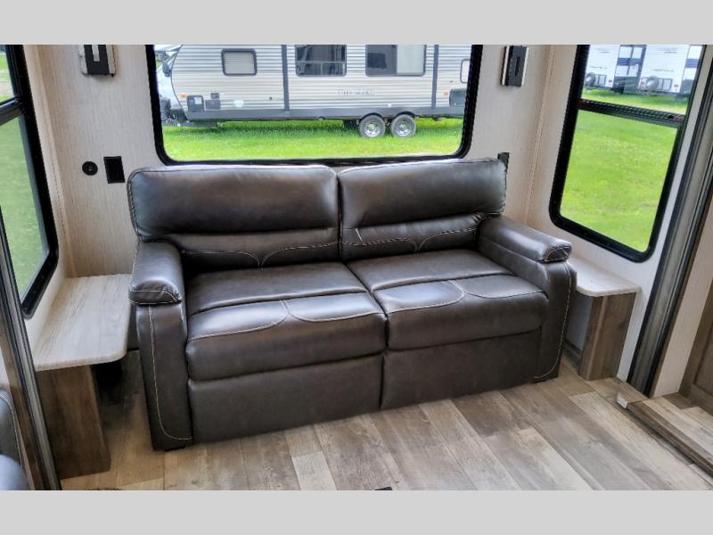 You won't want to pass up your chance to camp in this luxurious Sandpiper fifth wheel! With a rear living area featuring a tri-fold hide-a-bed sofa with end tables, theater seating with cupholders, and an entertainment center with a fireplace, you can enjoy relaxing in true comfort each evening. Inside the full bathroom there is a walk-in shower with a seat, a vanity sink, and a linen closet so that you can start each morning off clean and fresh. Once you're ready for the day, head to the coffee bar area to brew up your favorite cup of coffee then head outdoors and enjoy a relaxing morning while you sit under the 16' electric awning with LED lights!