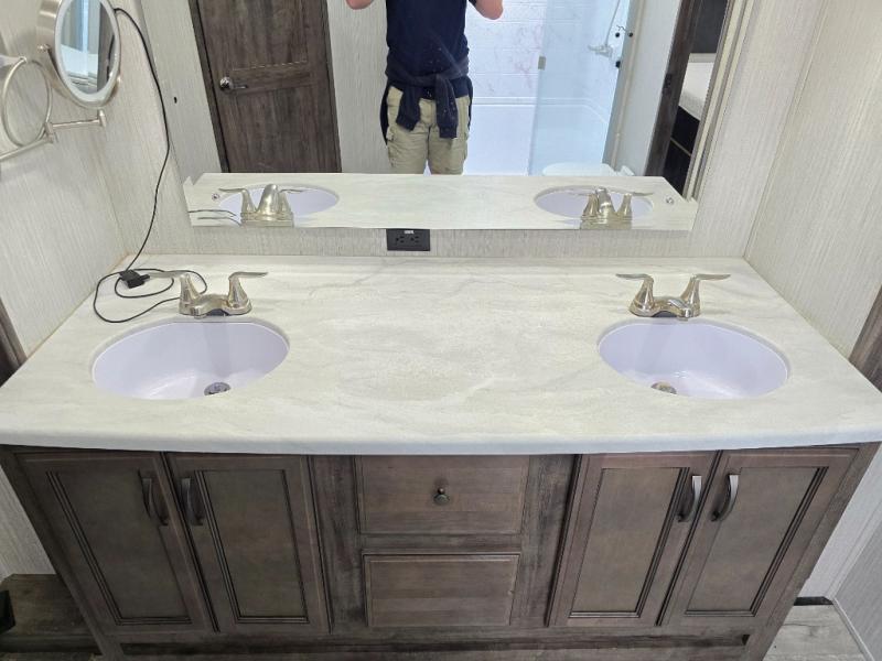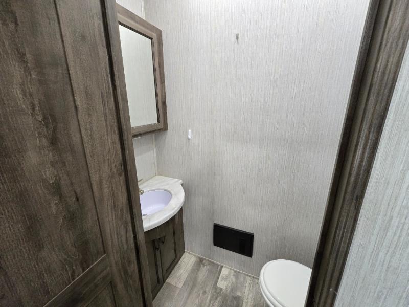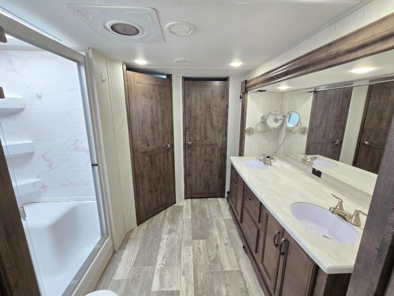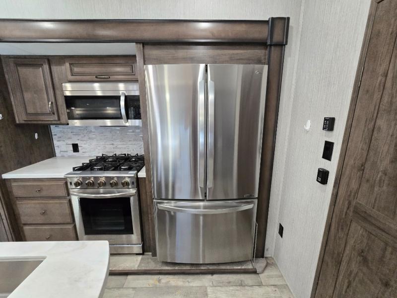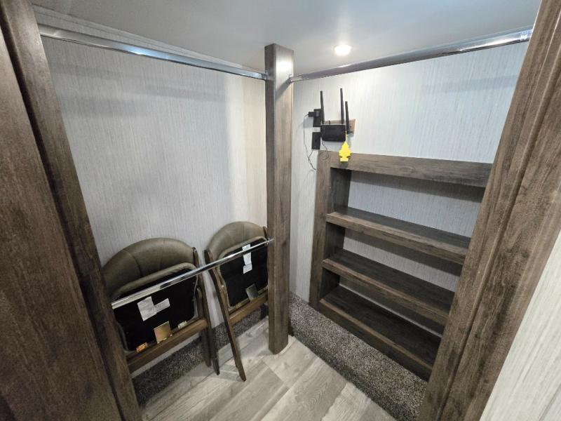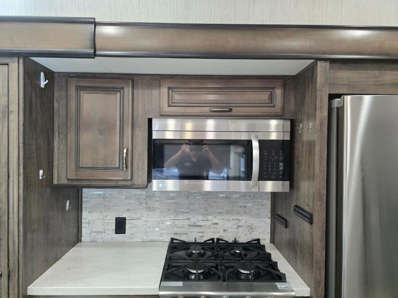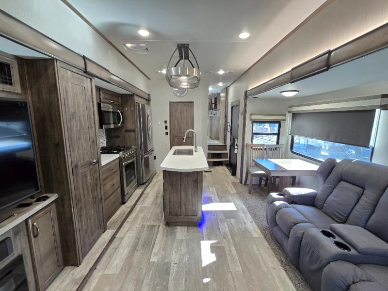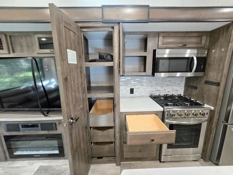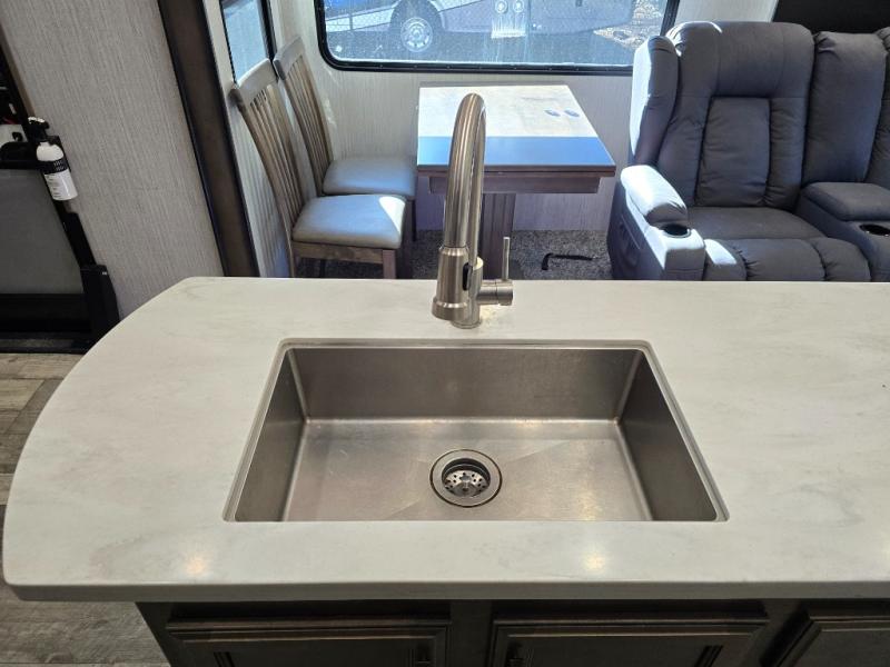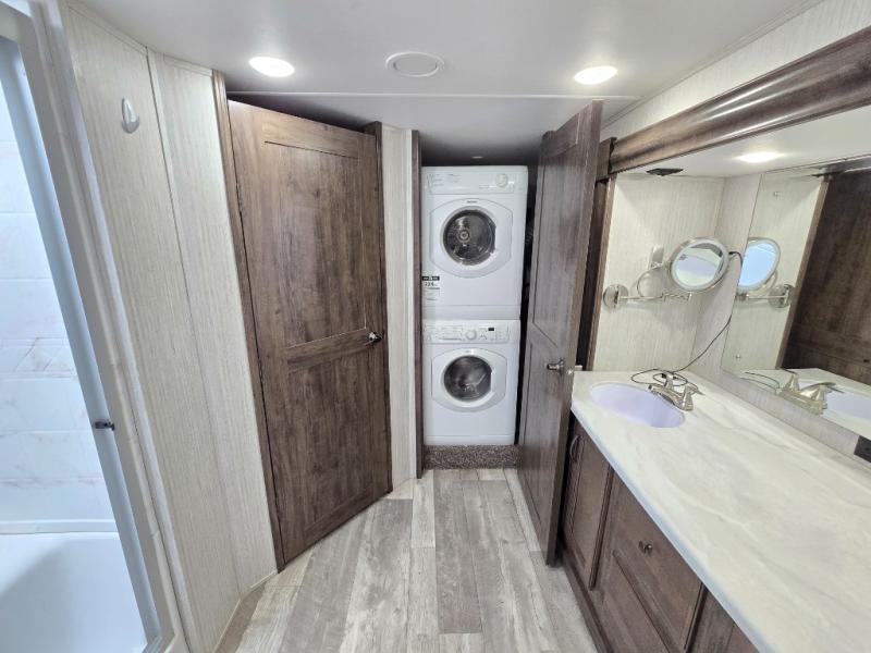 Space, luxury, and high-class furnishings are what you will find in this Sandpiper fifth wheel! With its four slides, the interior feels open and inviting no matter where you are inside, and with the exceptional features included in the master suite, you have everything you need to escape the mundane travel experiences of times past, like a huge wardrobe and your own large bathroom with a dual-sink vanity. You will also be impressed by the fabulous living area because it contains its own half bath so that your guests feel comfortable when they visit, a cozy fireplace for cooler evenings, and theater seating with heat and massage. If you're not needing the half bath, you can choose to add the optional walk-in pantry in place of the bath for more storage space. This model also includes a bumper mount swivel gas grill so you can whip up some burgers in no-time!