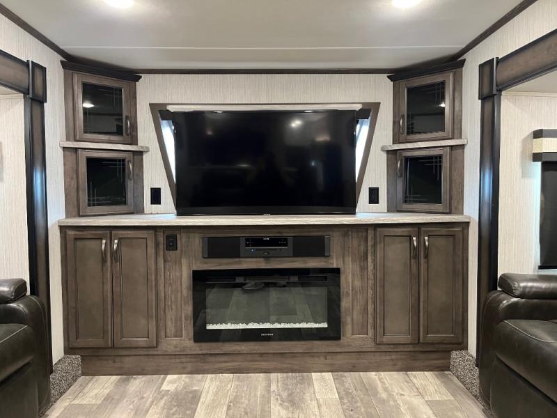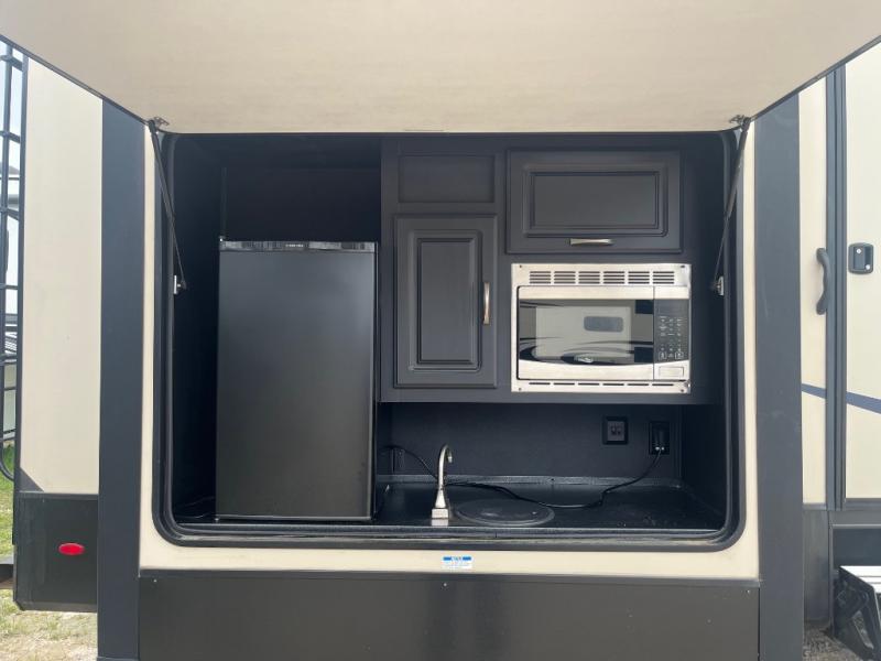 Get ready to camp in comfort when you choose to camp in this Sandpiper fifth wheel by Forest River. This model features sleeping space for up to six people with a rear queen bed and two tri-fold hide-a-bed sofas in the front living area. Along the front of this unit there is an entertainment center where you can watch a movie on rainy afternoons with the 50" LED pop-up TV as you snuggle up next to the fireplace. With two entry doors, you can easily enter this unit and be in the kitchen area, or you can enter through the rear door and have easy access to the bathroom. The exterior kitchen is ideal for storing drinks or snacks and there is a bumper mount swivel gas grill for hot dogs!