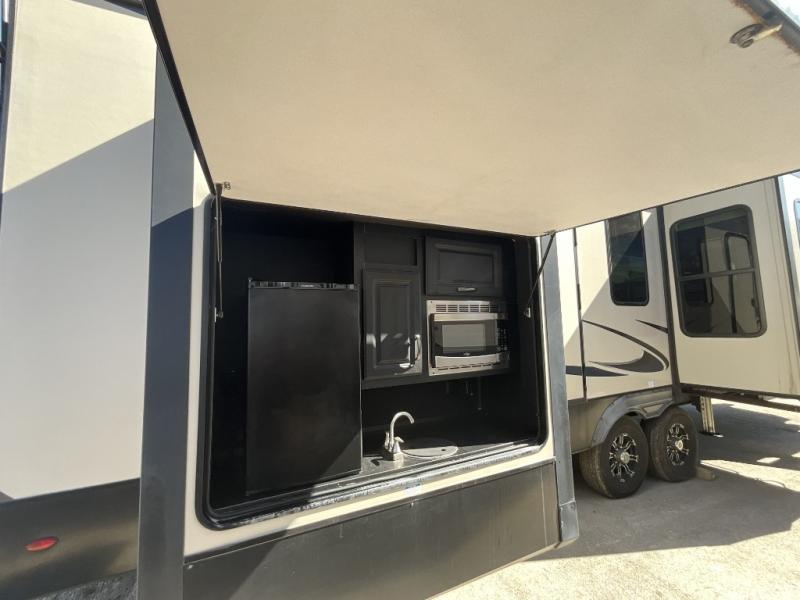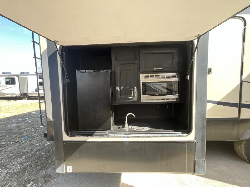 Get ready to camp in comfort when you choose to camp in this Sandpiper fifth wheel by Forest River. This model features sleeping space for up to six people with a rear queen bed and two tri-fold hide-a-bed sofas in the front living area. Along the front of this unit there is an entertainment center where you can watch a movie on rainy afternoons with the 50" LED pop-up TV as you snuggle up next to the fireplace. With two entry doors, you can easily enter this unit and be in the kitchen area, or you can enter through the rear door and have easy access to the bathroom. The exterior kitchen is ideal for storing drinks or snacks and there is a bumper mount swivel gas grill for hot dogs!