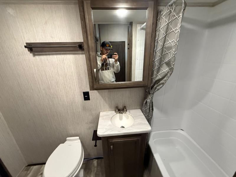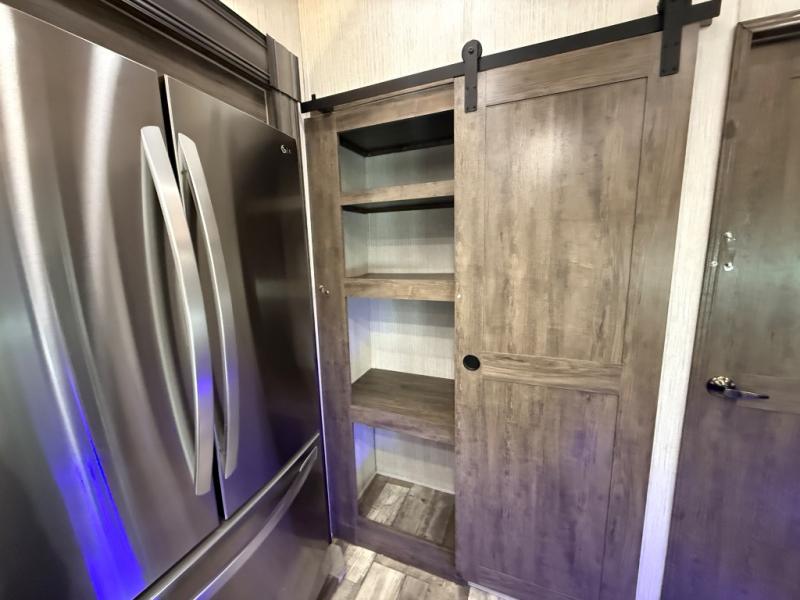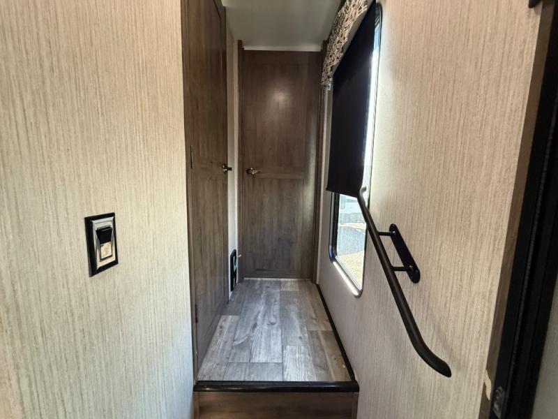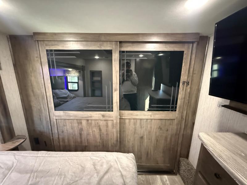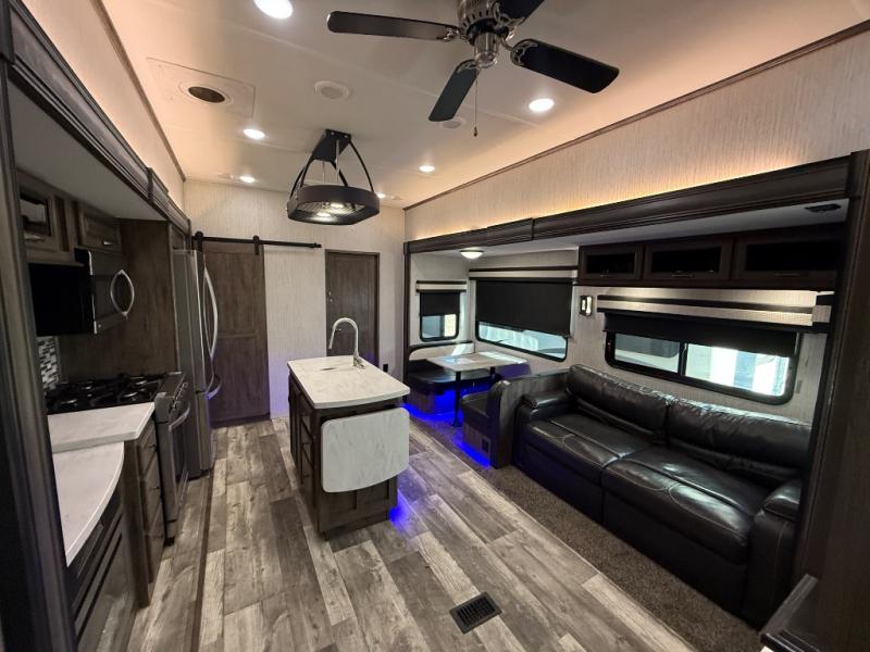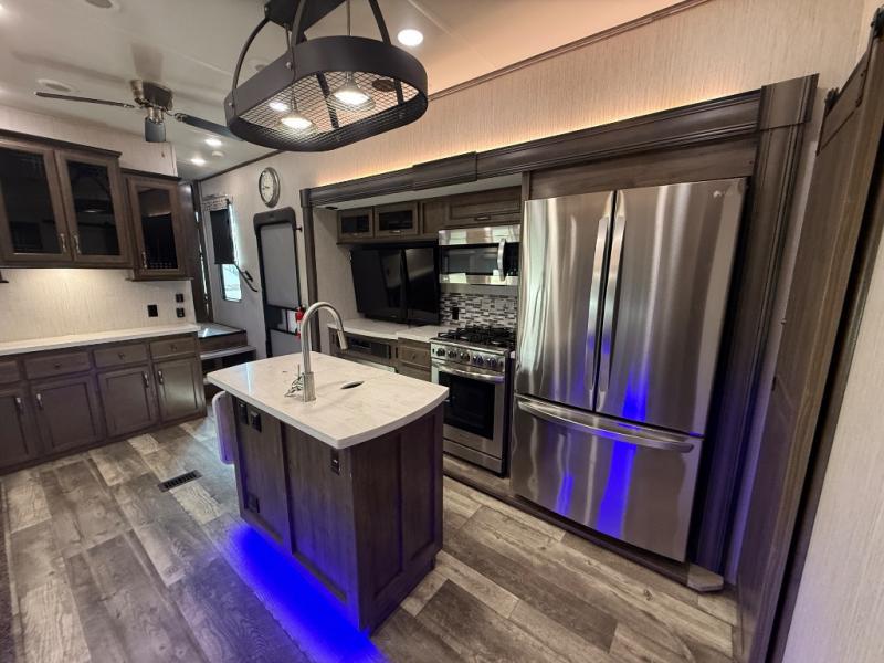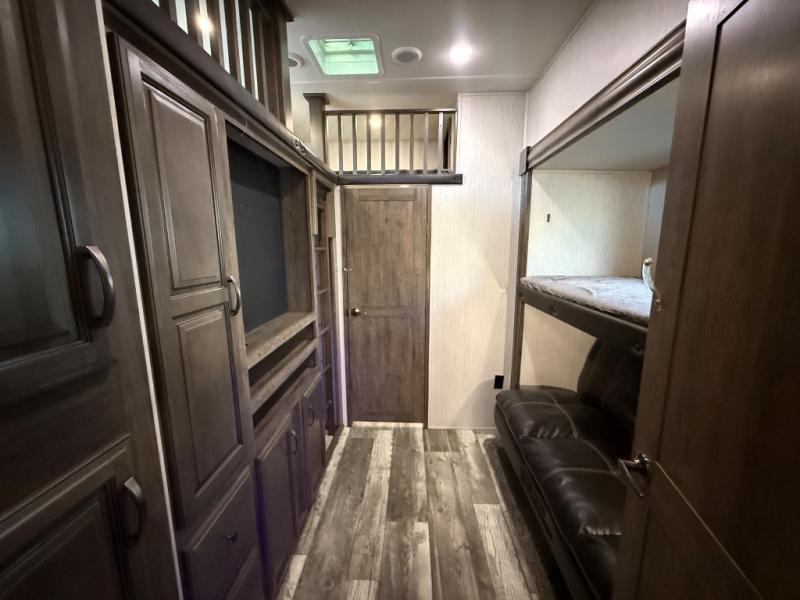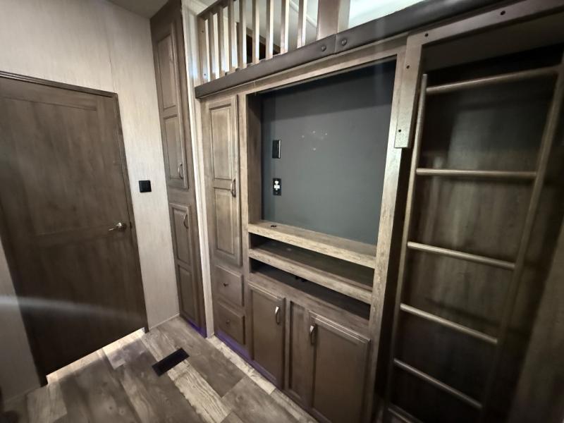 For the ultimate family-friendly fifth wheel, you will want this four-slide Sandpiper fifth wheel. With two entry doors, you can easily access the inside of this model from the rear or the front. Your kids will enjoy their own space with the bunkhouse suite that has its very own full bathroom, as well as a loft above. Outside you can enjoy the shade from the 15' electric awning with LED lights and the convenience of the exterior kitchen with a bumper-mount swivel gas grill.