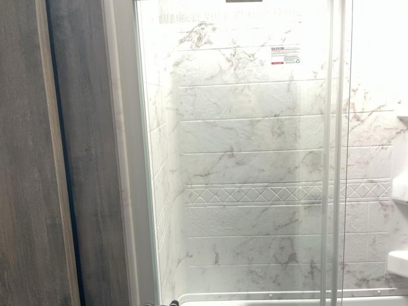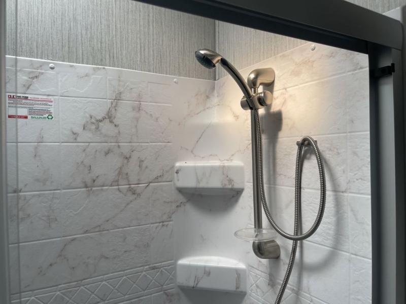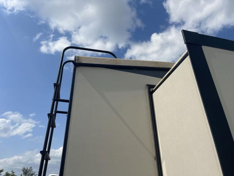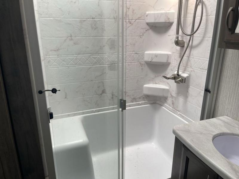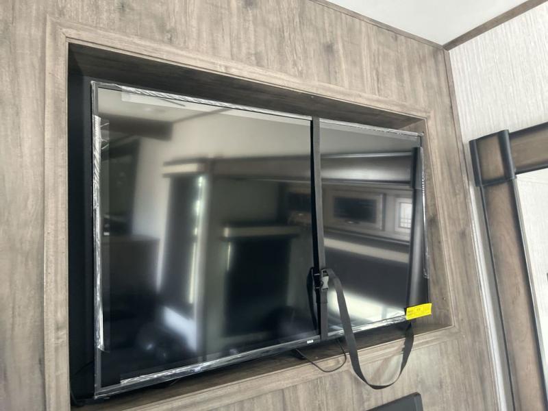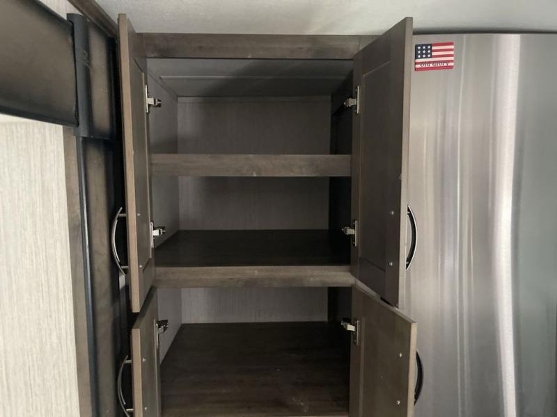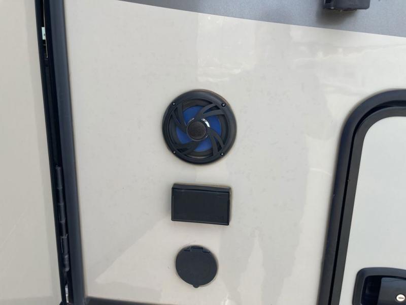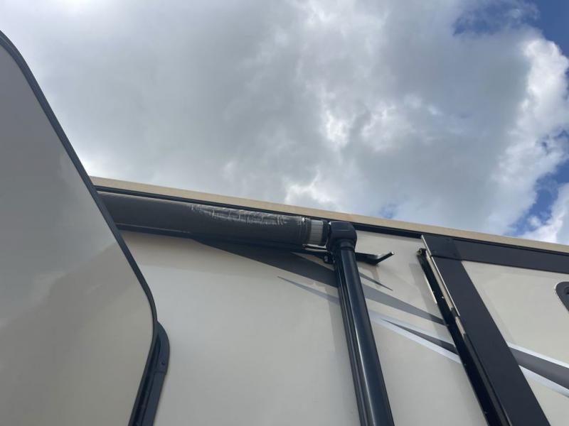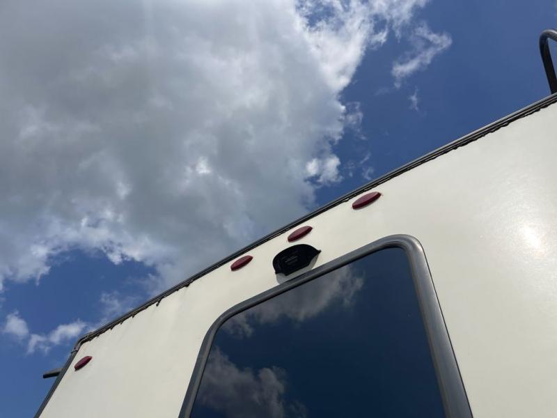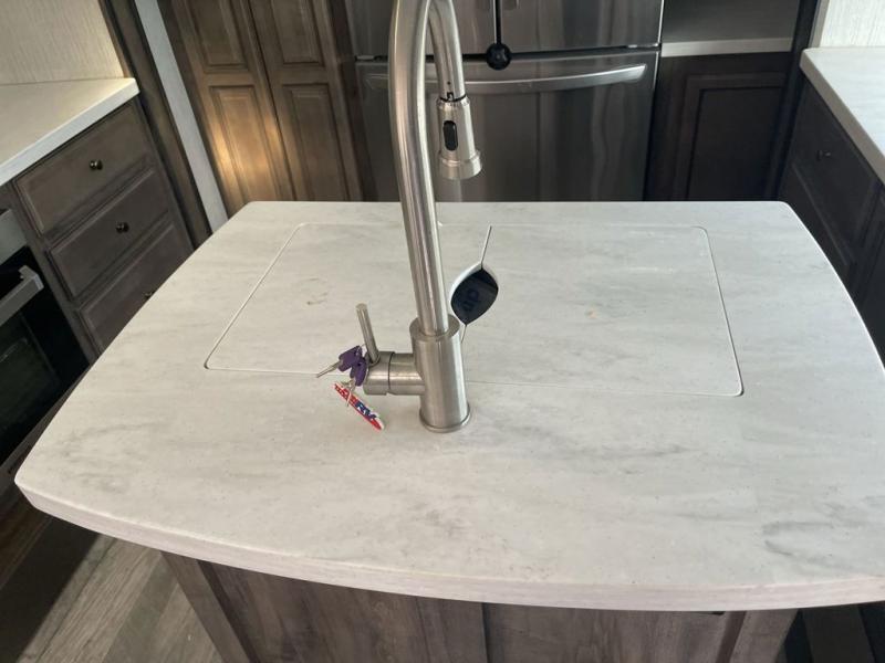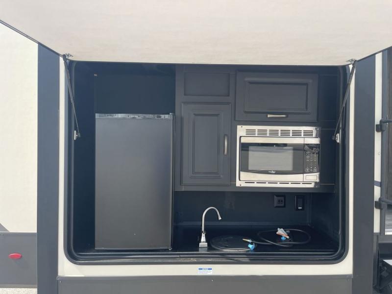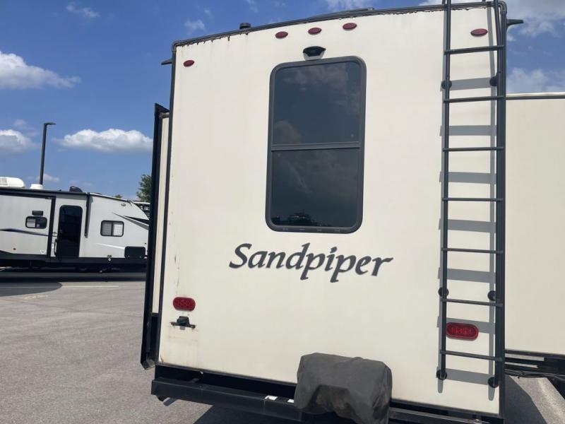 Get ready for more family time and new experiences when you choose to camp with this six slide Sandpiper fifth wheel. The exterior kitchen allows more time outdoors with your family and features a refrigerator and microwave. The unique front kitchen is spacious and accommodating with opposing slides, an island, and a dinette with two chairs. In the spacious bathroom is a large walk-in shower with a seat, plus a closet that has been prepped for an optional washer and dryer. With two entry doors into this model, you can easily slip out the rear door and head out for an early morning fishing trip!