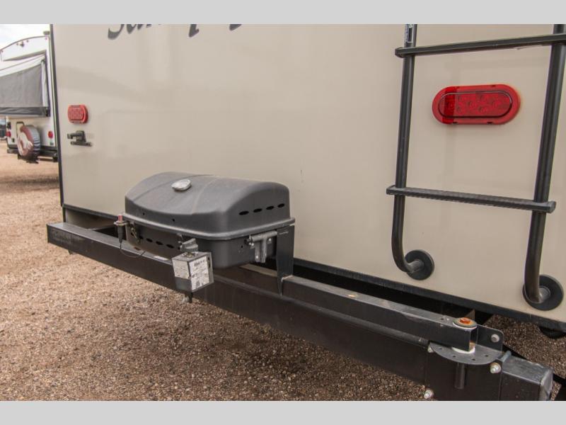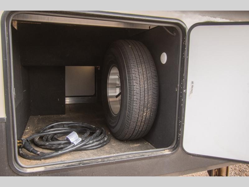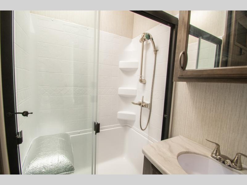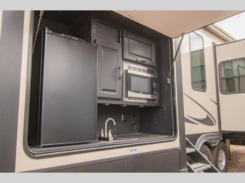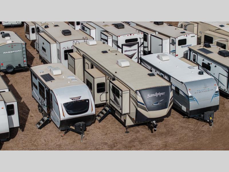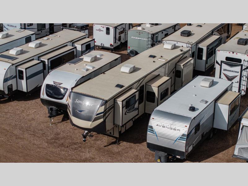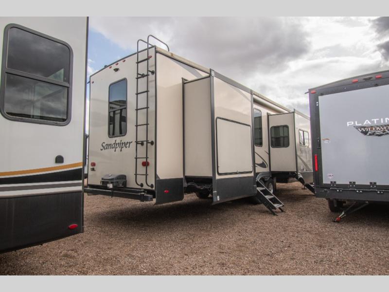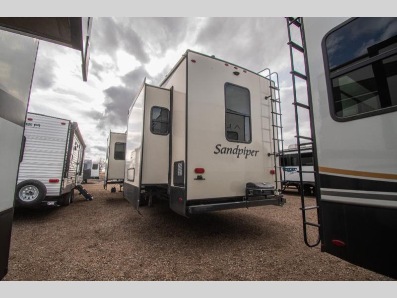 Get ready for more family time and new experiences when you choose to camp with this six slide Sandpiper fifth wheel. The exterior kitchen allows more time outdoors with your family and features a refrigerator and microwave. The unique front kitchen is spacious and accommodating with opposing slides, an island, and a dinette with two chairs. In the spacious bathroom is a large walk-in shower with a seat, plus a closet that has been prepped for an optional washer and dryer. With two entry doors into this model, you can easily slip out the rear door and head out for an early morning fishing trip!
