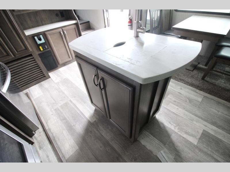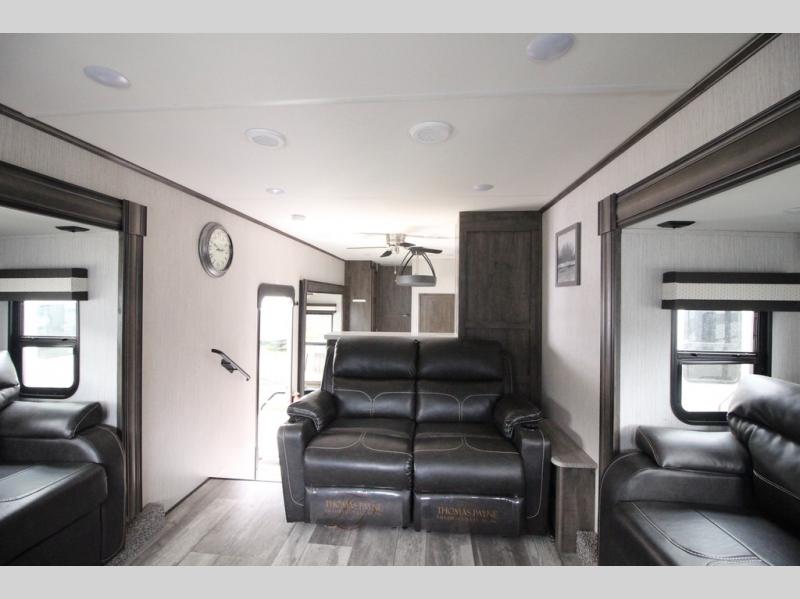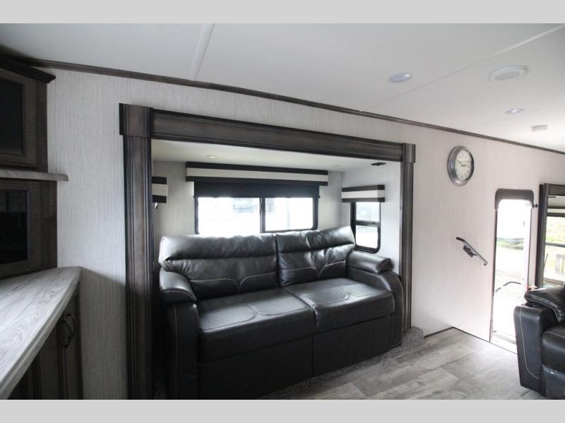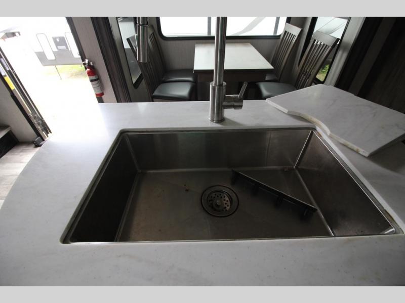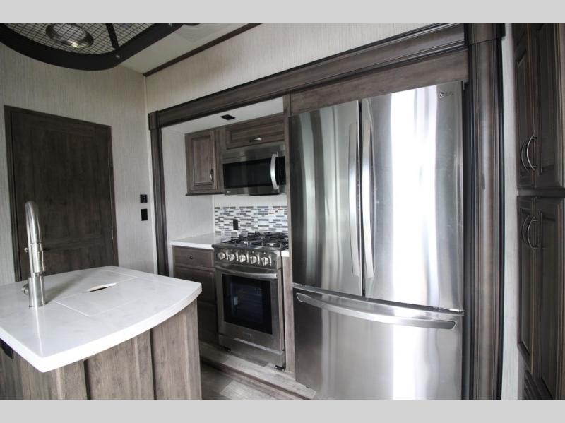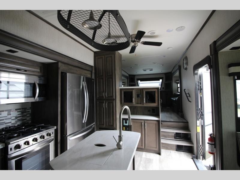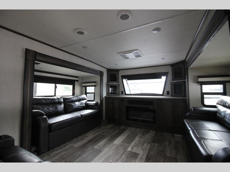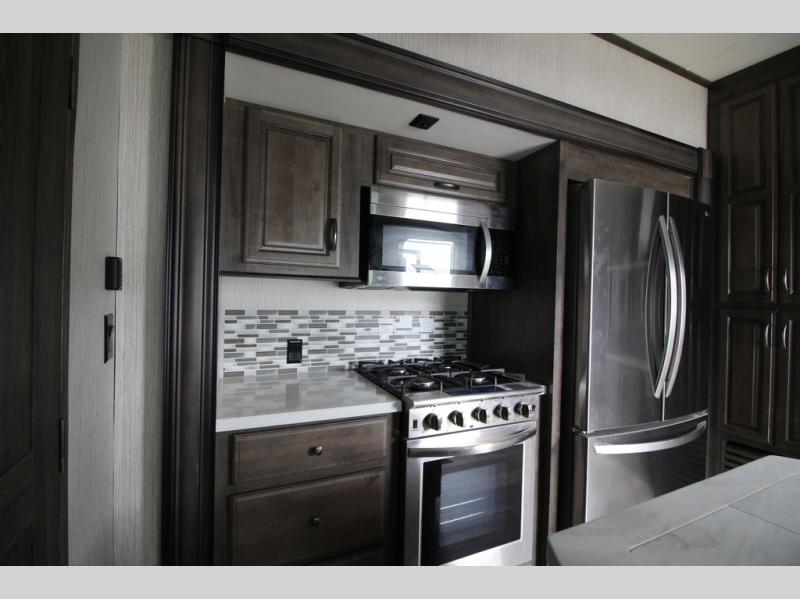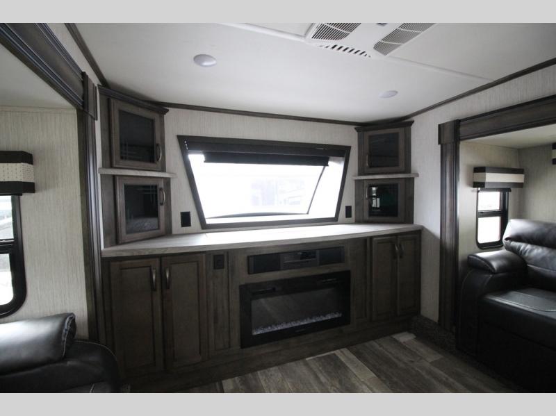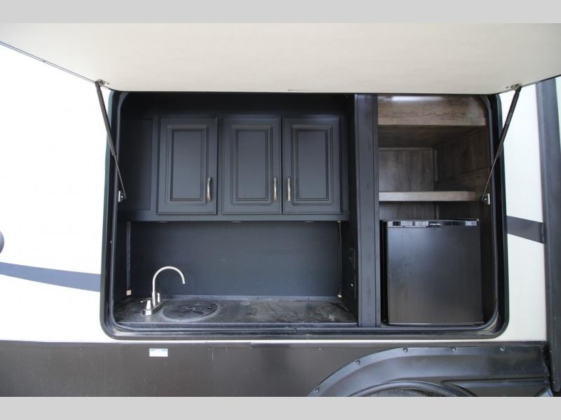 Your ultimate dream vacations will come true in this feature-packed fifth wheel. The front living area includes front entertainment with a pop-up TV and a fireplace below for comfort. You and your spouse will love to relax on the theater seating, and the grandkids can make this their bedroom at night with the two tri-fold hide-a-bed sofas. The middle kitchen has dual opposing slides for more space, plus there is a kitchen island with pendant lights to see better when prepping food. If the weather is nice, you may just choose to cook on the outside kitchen under the 20' power awning with LED lights. Head to the master suite to relax on the slide out king bed, or freshen up in the walk-in shower with a seat. You will also enjoy dual bath sinks for you and your spouse, and a closet that has been prepped to add an optional washer and dryer for your convenience!