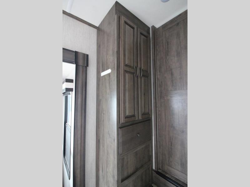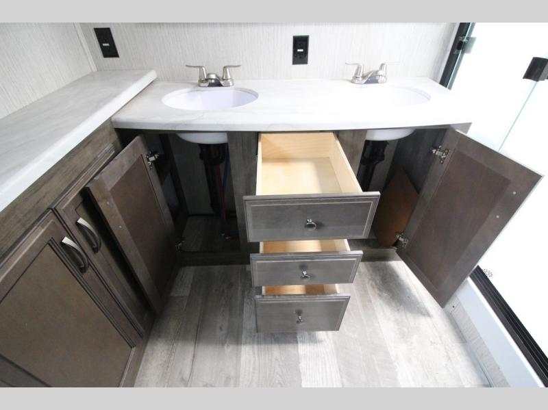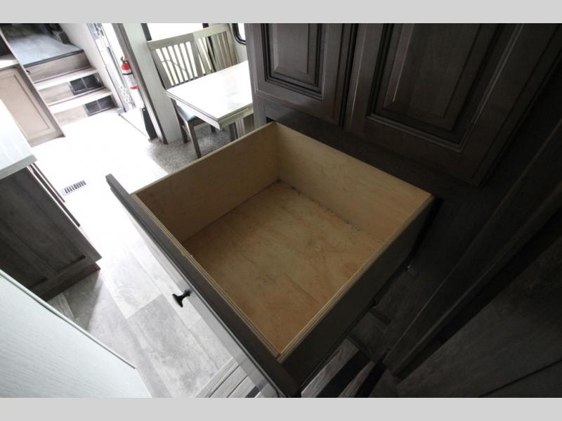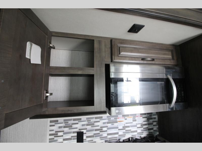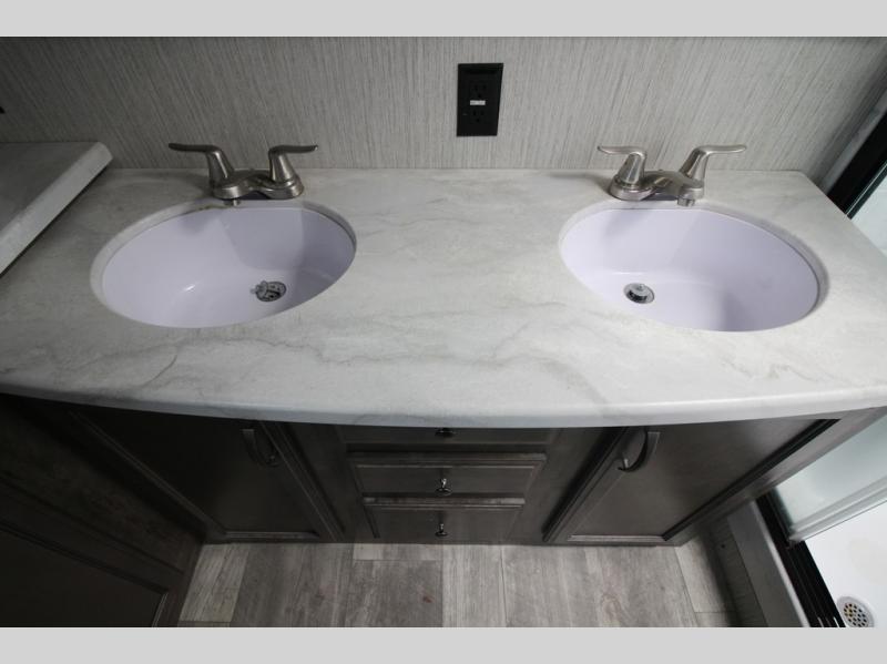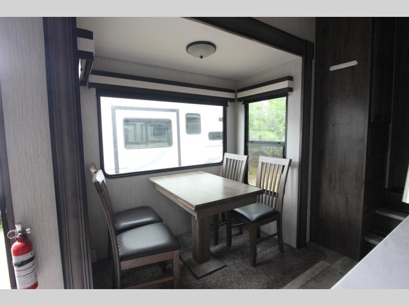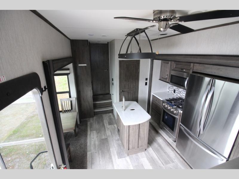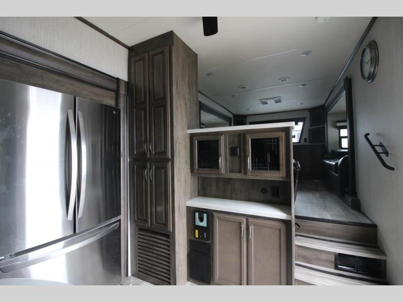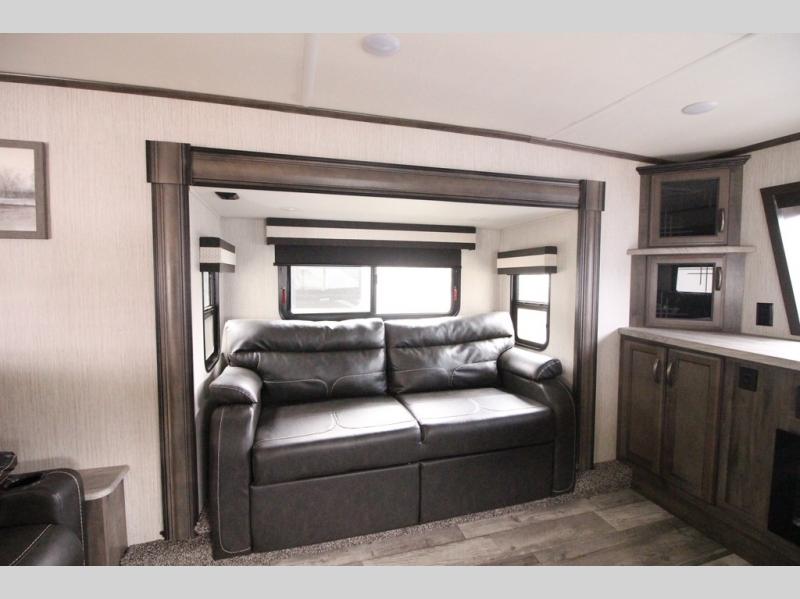 Your ultimate dream vacations will come true in this feature-packed fifth wheel. The front living area includes front entertainment with a pop-up TV and a fireplace below for comfort. You and your spouse will love to relax on the theater seating, and the grandkids can make this their bedroom at night with the two tri-fold hide-a-bed sofas. The middle kitchen has dual opposing slides for more space, plus there is a kitchen island with pendant lights to see better when prepping food. If the weather is nice, you may just choose to cook on the outside kitchen under the 20' power awning with LED lights. Head to the master suite to relax on the slide out king bed, or freshen up in the walk-in shower with a seat. You will also enjoy dual bath sinks for you and your spouse, and a closet that has been prepped to add an optional washer and dryer for your convenience!