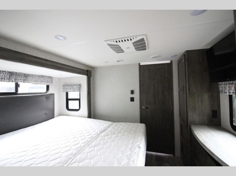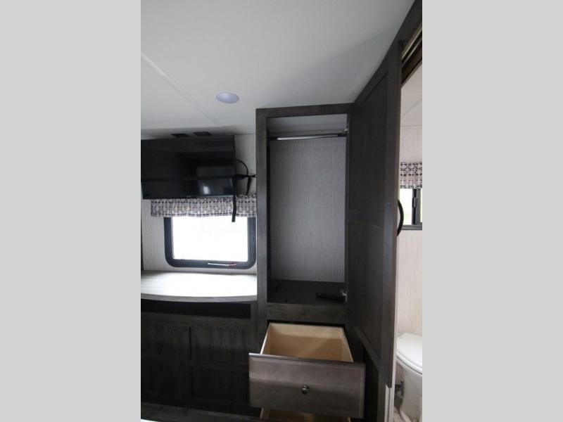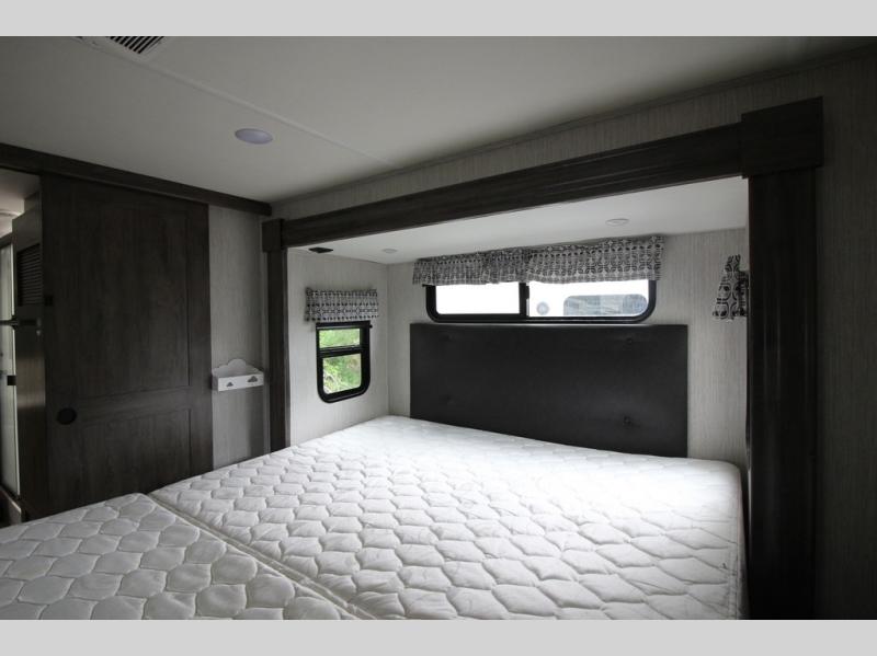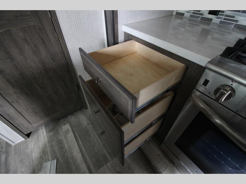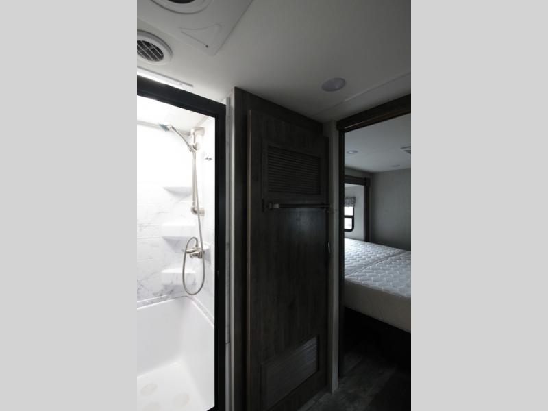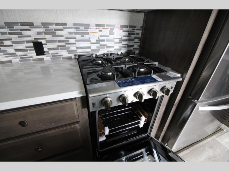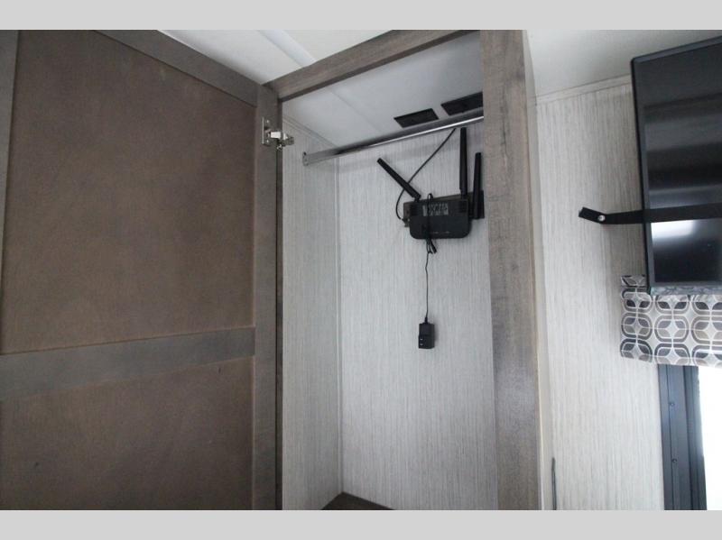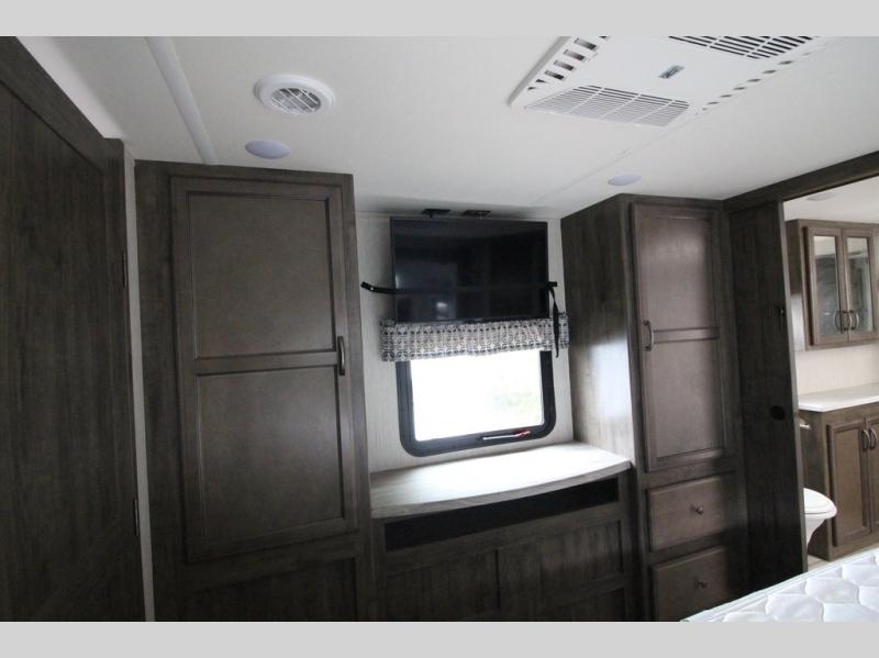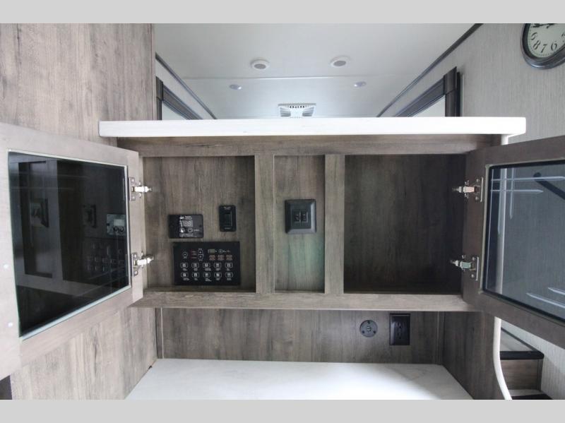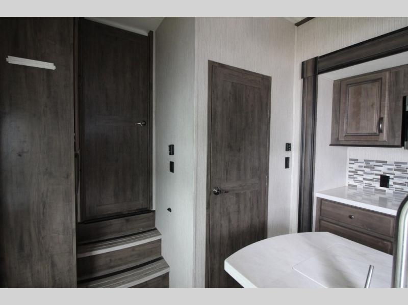 Your ultimate dream vacations will come true in this feature-packed fifth wheel. The front living area includes front entertainment with a pop-up TV and a fireplace below for comfort. You and your spouse will love to relax on the theater seating, and the grandkids can make this their bedroom at night with the two tri-fold hide-a-bed sofas. The middle kitchen has dual opposing slides for more space, plus there is a kitchen island with pendant lights to see better when prepping food. If the weather is nice, you may just choose to cook on the outside kitchen under the 20' power awning with LED lights. Head to the master suite to relax on the slide out king bed, or freshen up in the walk-in shower with a seat. You will also enjoy dual bath sinks for you and your spouse, and a closet that has been prepped to add an optional washer and dryer for your convenience!