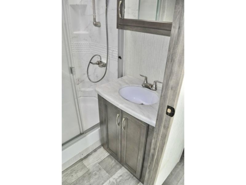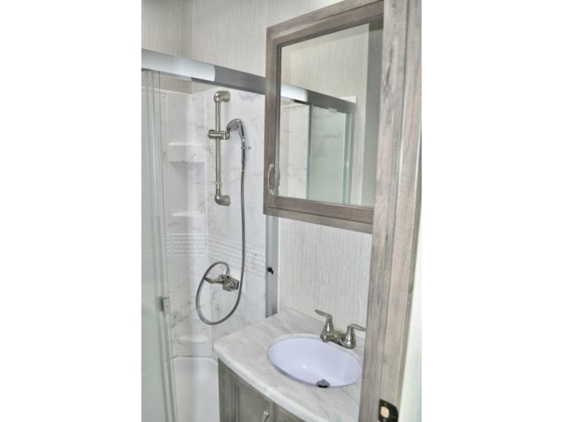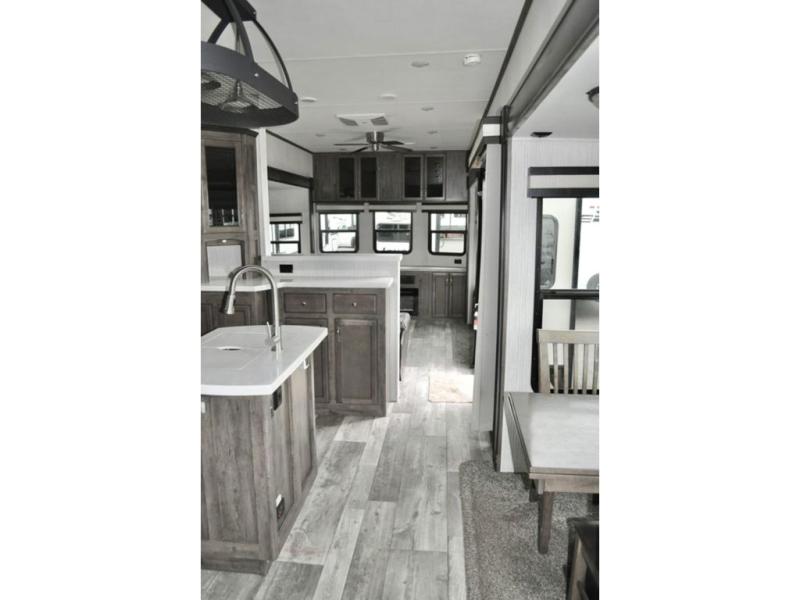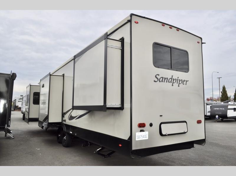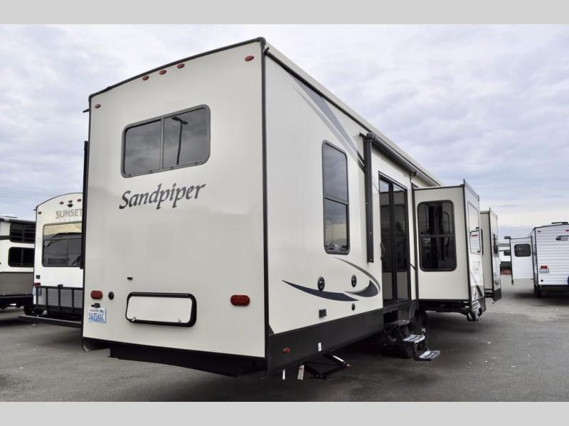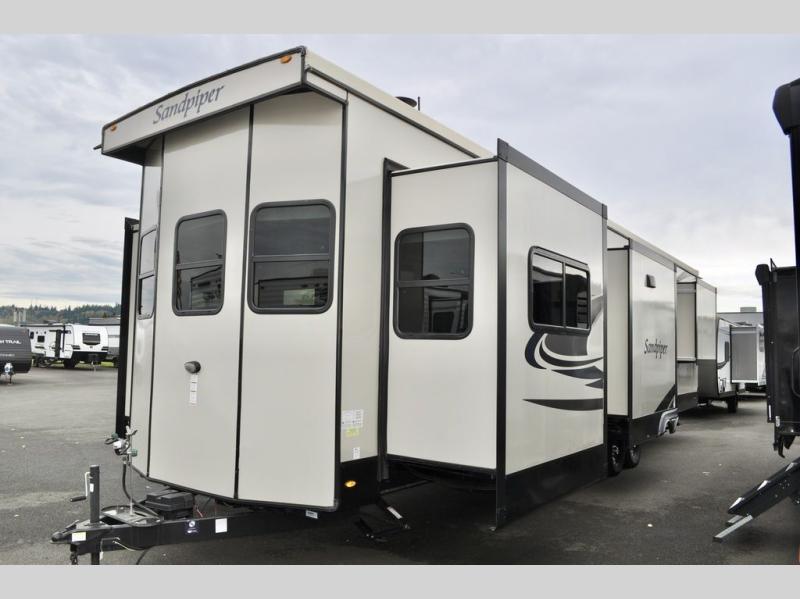 The Sandpiper Destination Trailers by Forest River are constructed to last through years of use and memories. There is a cambered powder coated frame with rust prohibitor, R-10 sidewall construction, and Underbelly Armor that will allow you to camp year around. There is also a Dometic "One-Touch" electric awning with adjustable arms and LED lights, two exterior speakers, and a 60" dual pane patio door. The interior is packed with comforts, such as residential carpet, recessed LED lighting, handmade cabinetry, and crown molding over the kitchen cabinets to name a few. You will love the look of the stainless steel kitchen package, the designer window treatments, and the rustic plank pattern linoleum. These destination trailers also feature extra large picture windows throughout for open views, a full coach water filtration system, a ducted 15K A/C system, plus many more conveniences to make each destination memorable.