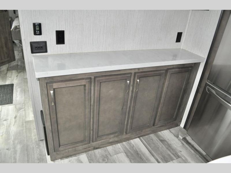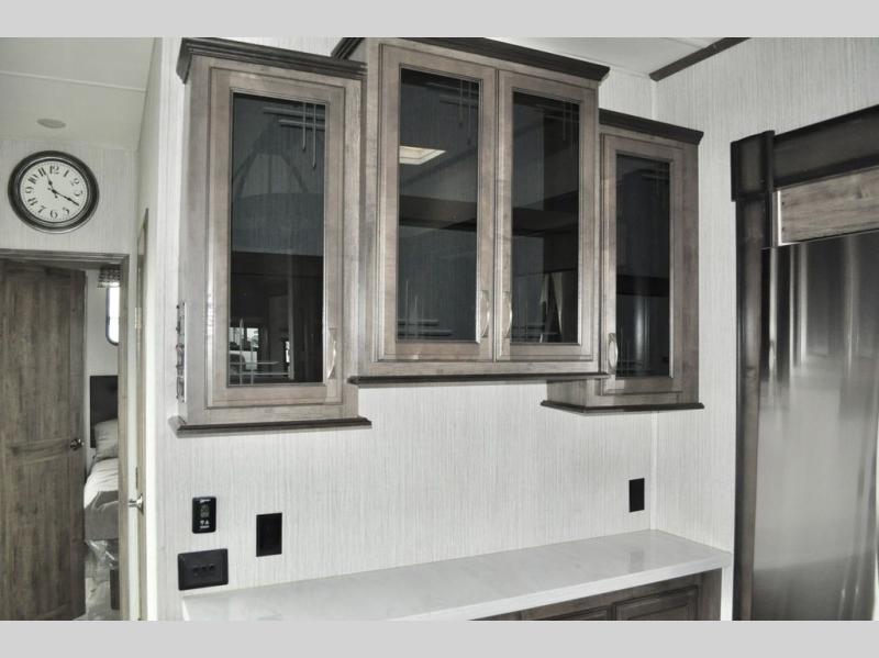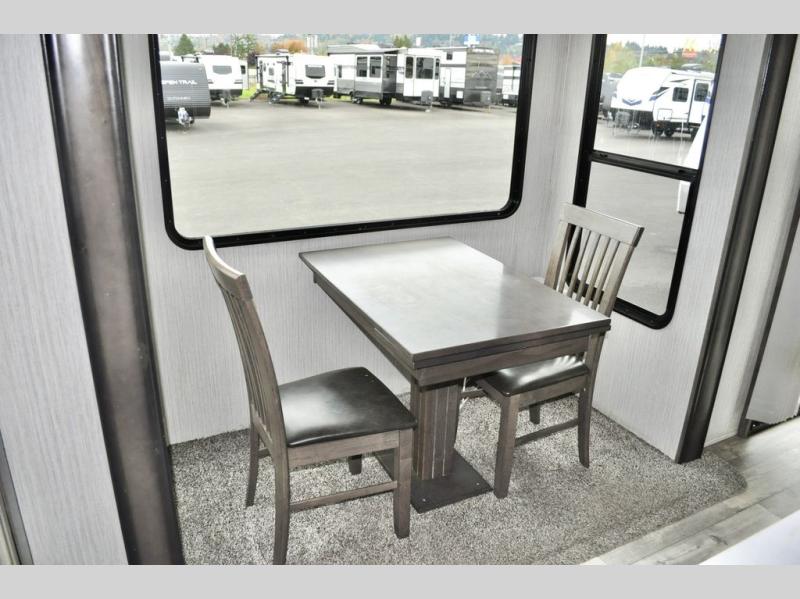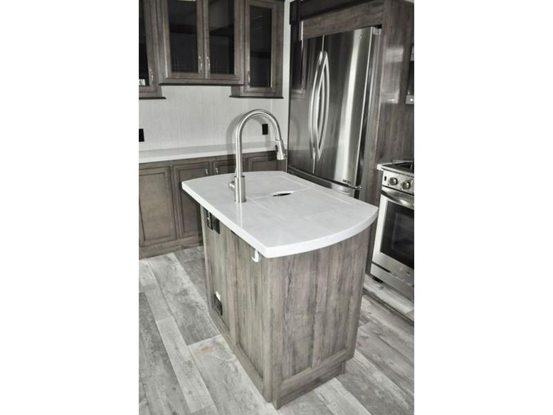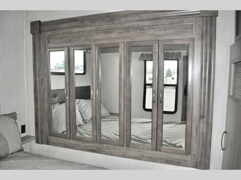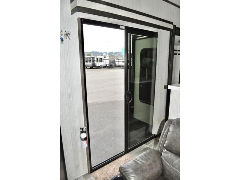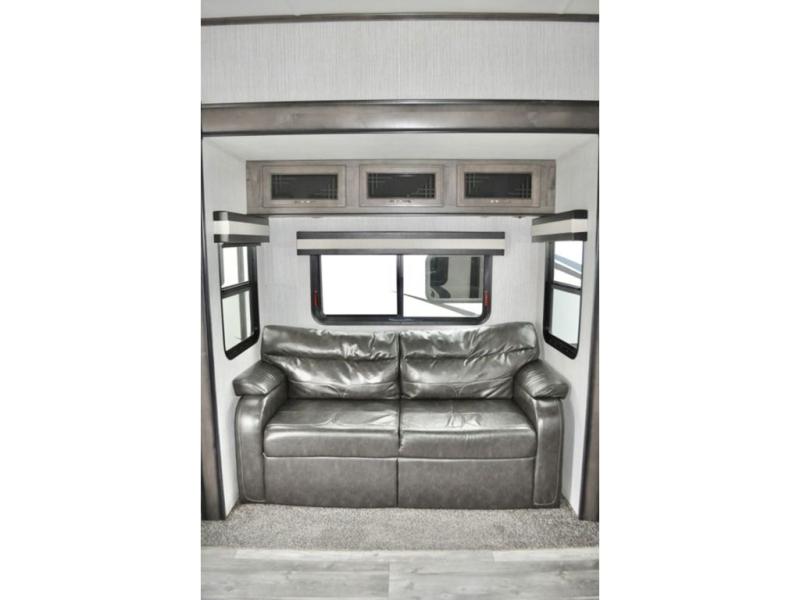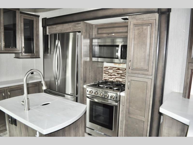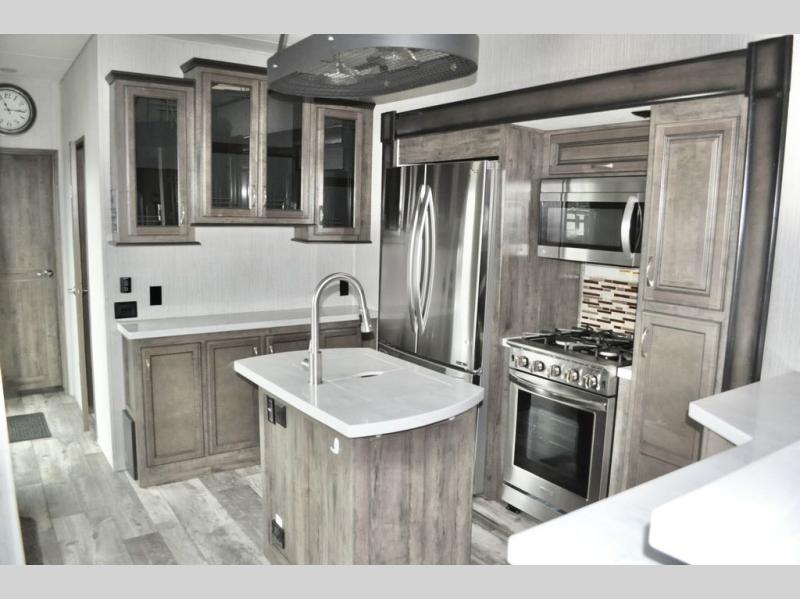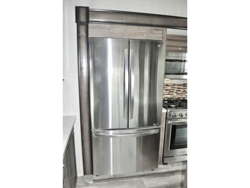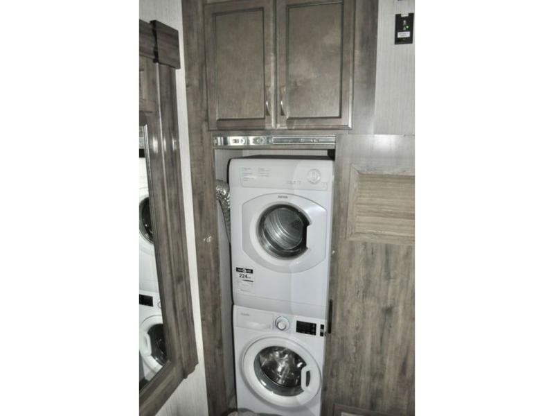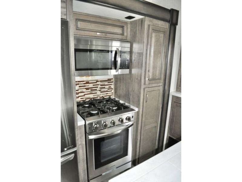 Enjoy extended stays in this five slide out destination trailer. You will feel right at home in the rear bedroom with its queen bed, dual nightstands, plus a closet with washer/dryer prep if you choose that option. The kitchen island will be perfect for cleaning up after a big meal, and the table with four chairs allows you to dine just like you would at home. There is also a large pantry and a 22 cu. ft. stainless steel refrigerator to store plenty of food. Everyone will love to gather in the front living area that includes a front entertainment center with a fireplace, theater seating, and two hide-a-bed sofas that will be perfect for overnight guests.