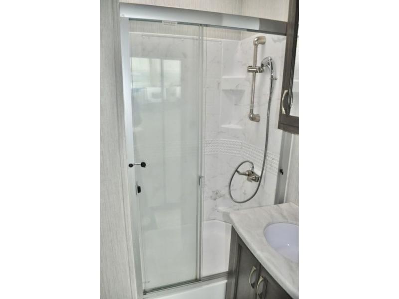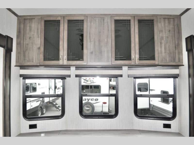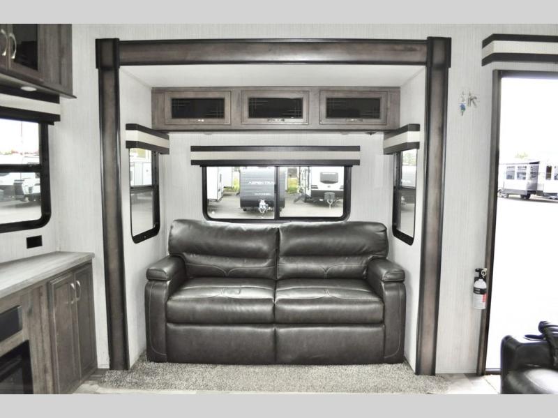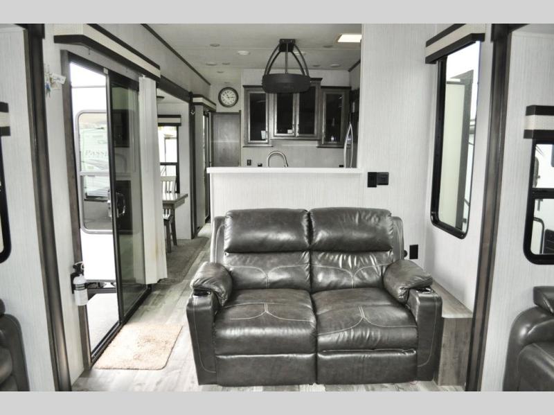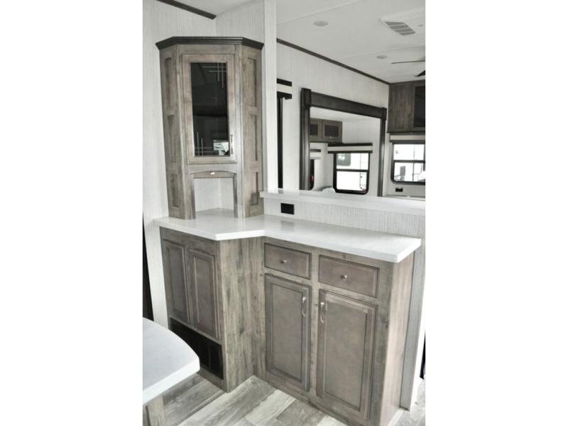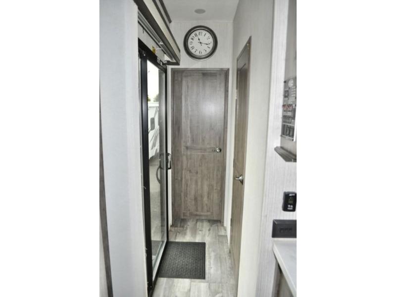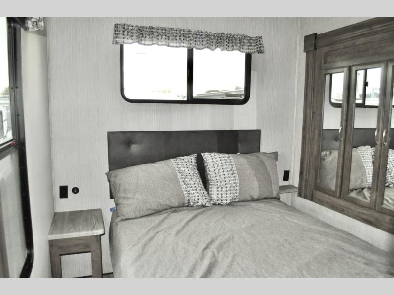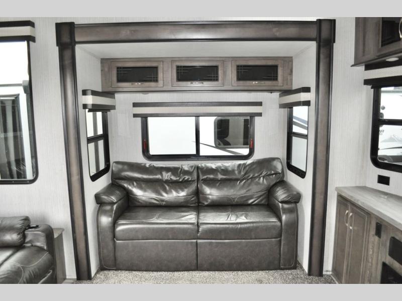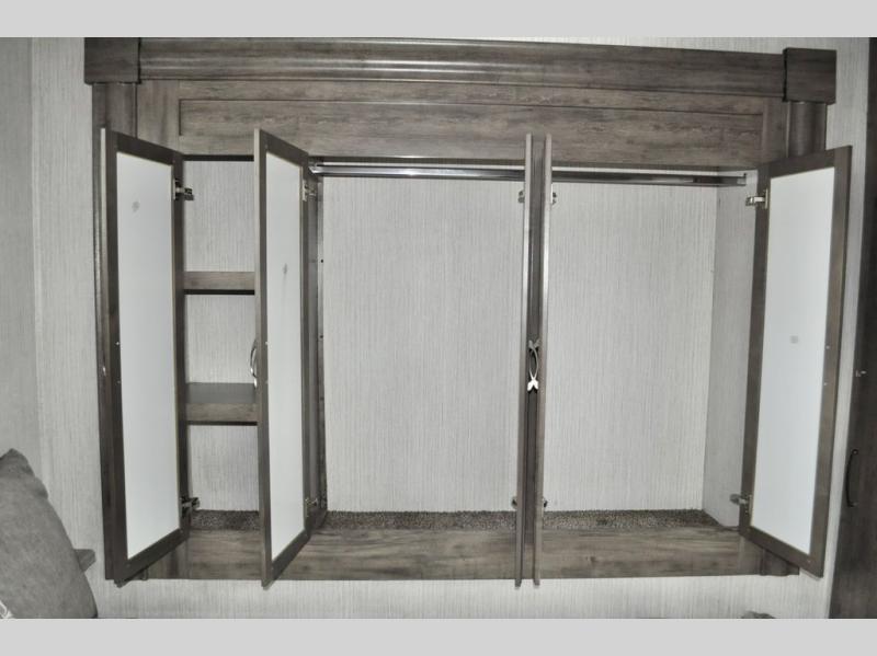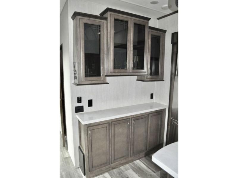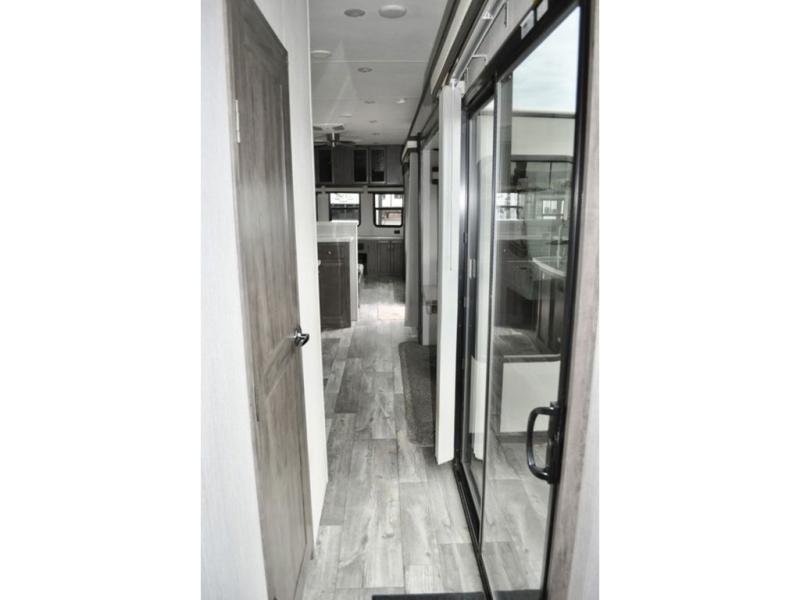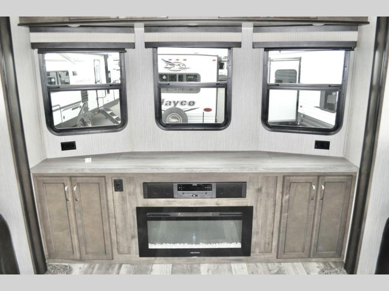 Enjoy extended stays in this five slide out destination trailer. You will feel right at home in the rear bedroom with its queen bed, dual nightstands, plus a closet with washer/dryer prep if you choose that option. The kitchen island will be perfect for cleaning up after a big meal, and the table with four chairs allows you to dine just like you would at home. There is also a large pantry and a 22 cu. ft. stainless steel refrigerator to store plenty of food. Everyone will love to gather in the front living area that includes a front entertainment center with a fireplace, theater seating, and two hide-a-bed sofas that will be perfect for overnight guests.