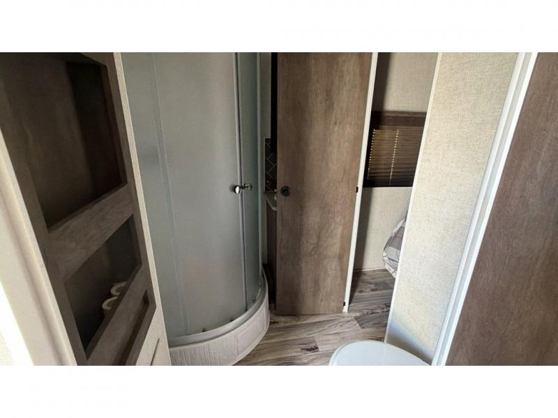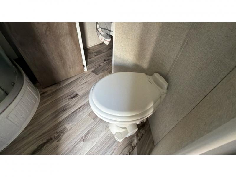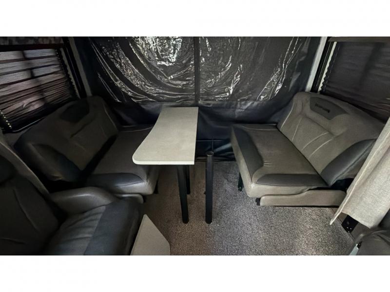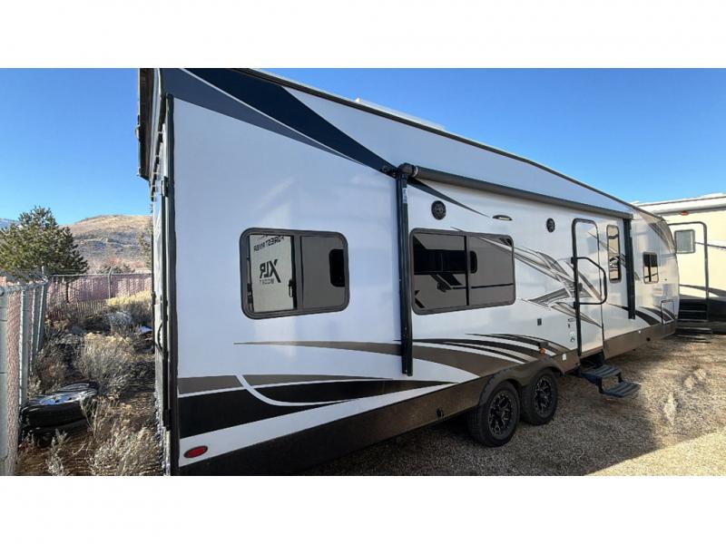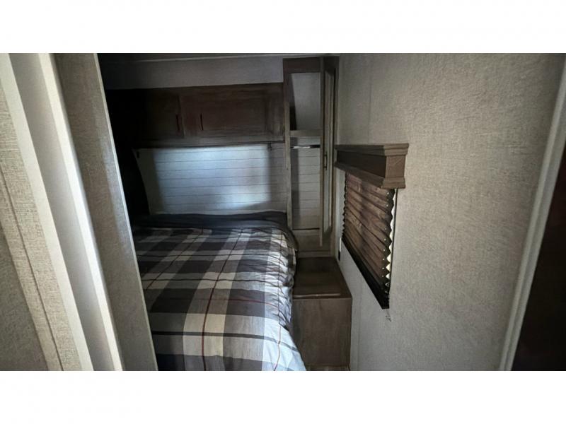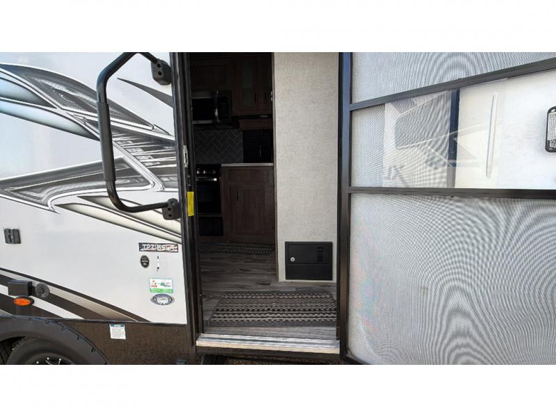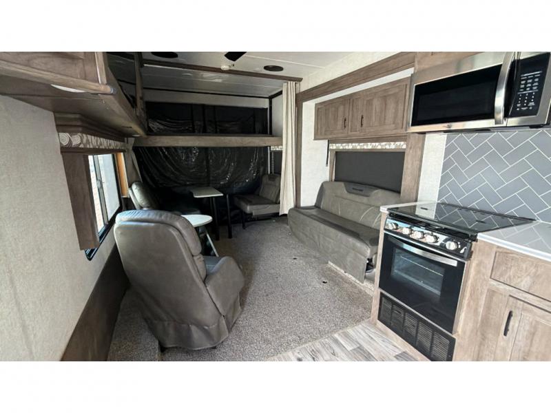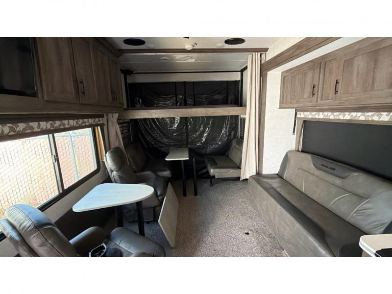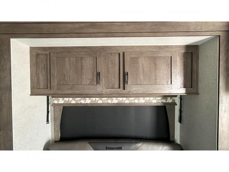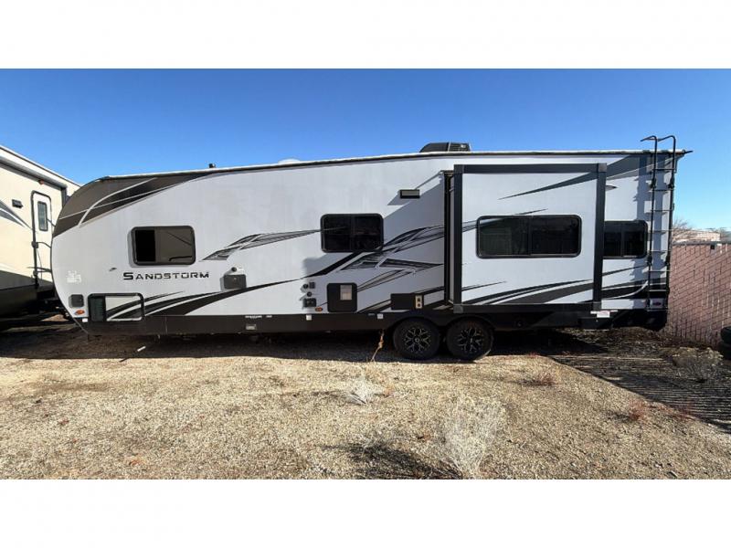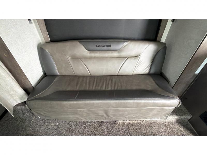 If you're looking for a good time on the trails, then this Sandstorm toy hauler is for you! It features a front master suite with a queen-size bed for you to rest up after a long adventurous day and a dual-entry bath for you to rinse the mud out of your hair. What better way to wind down your nights than to sit back on one of the two lounge chairs with a table in between or on the sofa slide. There is also a rear electric bunk with an electric pass-through dinette below for you to bring along a few friends!
