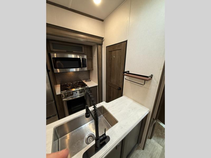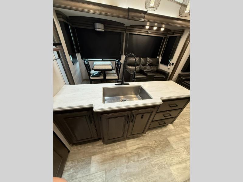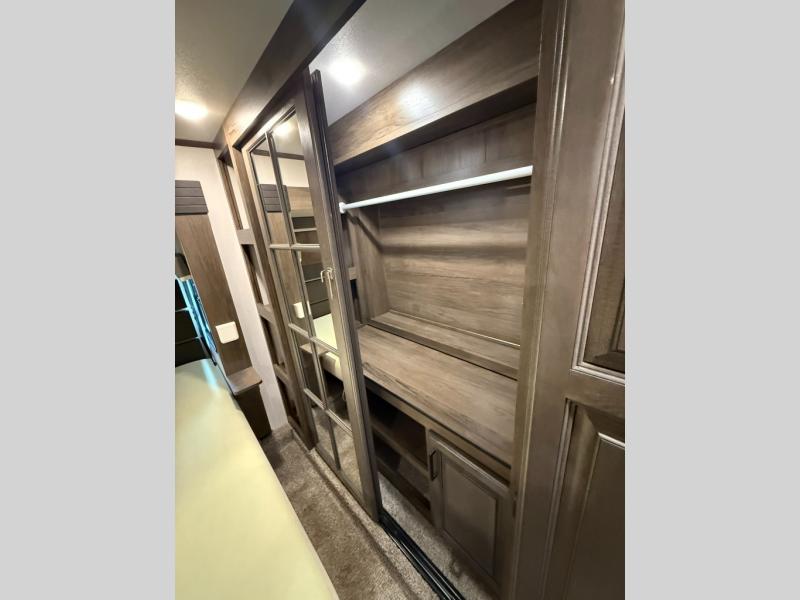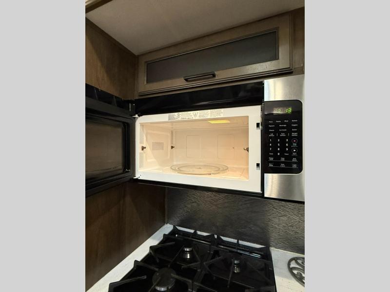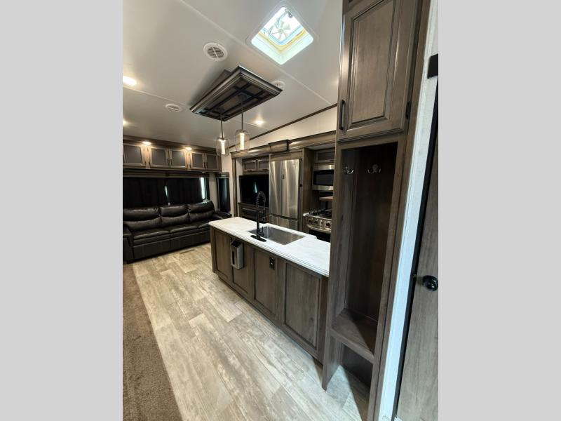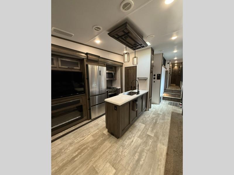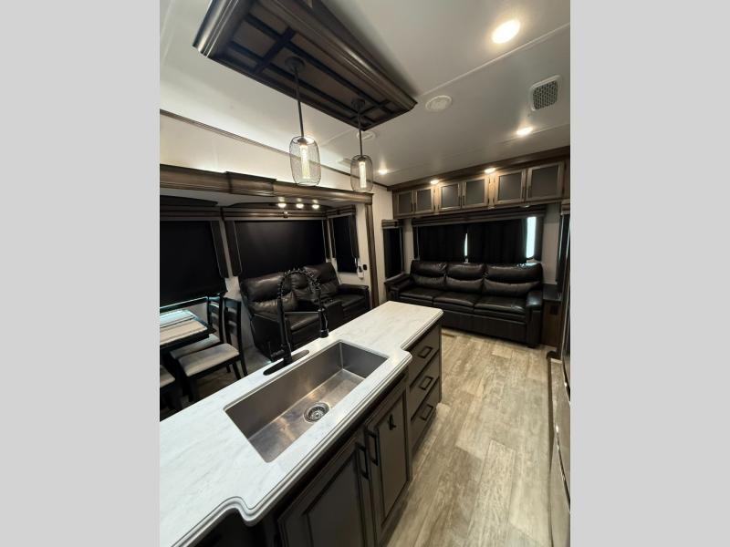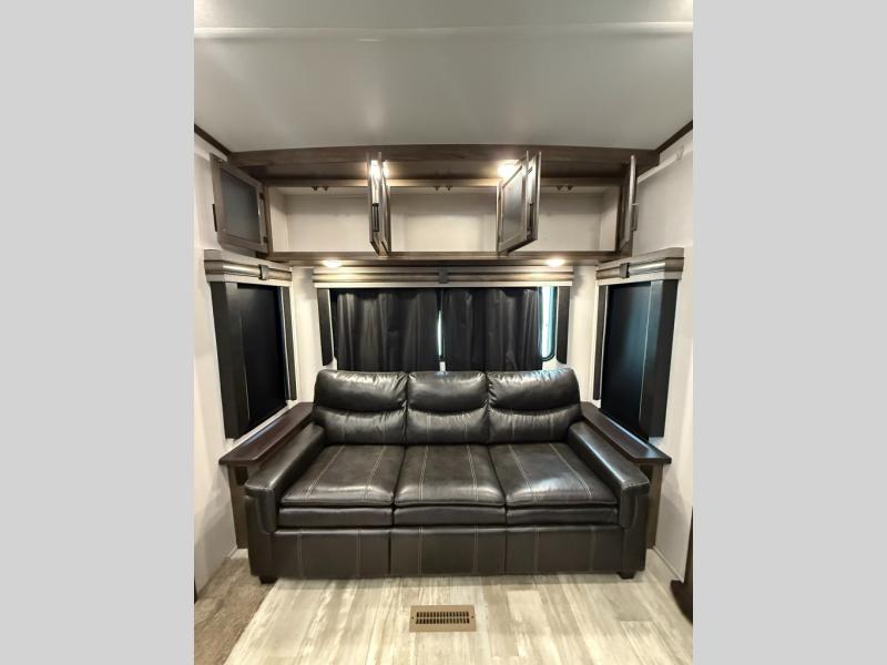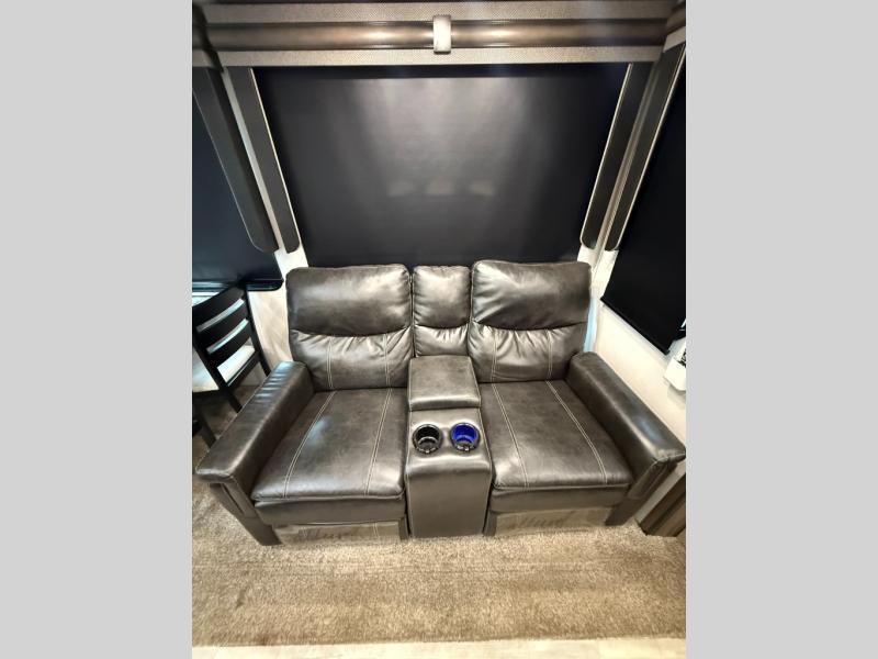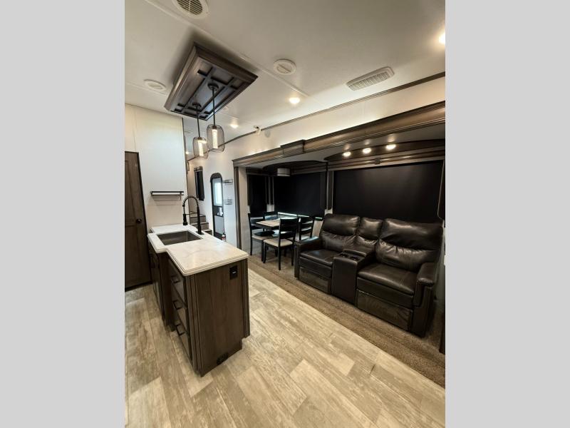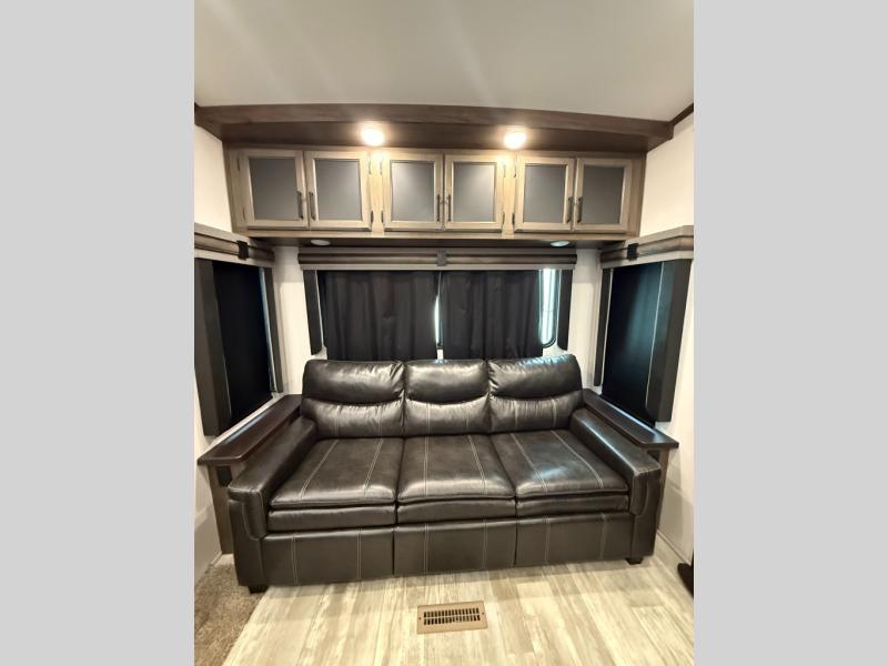 If you've been looking for the perfect fifth wheel for your family, choose this unit that can sleep eight people each night. Your guests will have the mid-bunk room all to themselves with a jackknife sofa and a flip-up bunk above, a dresser for their clothes, and a convenient half bath! The loft is sure to be a fun addition for the kids, and you and your spouse will enjoy the front private bedroom with a slide out king bed for your comfort. Everyone can meet in the rear living area that includes a hide-a-bed sofa, theater seats, and a free-standing dinette for game night. The chef of the family will have plenty of counter space for prepping meals on the island peninsula, and the Furrion oven and cooktop can heat up any casseroles they have prepared. If the weather is nice, you may just want to head outdoors to cook dinner on the outside kitchen, and the smart arm electric awning with LED lights will provide protection from the sun rays!