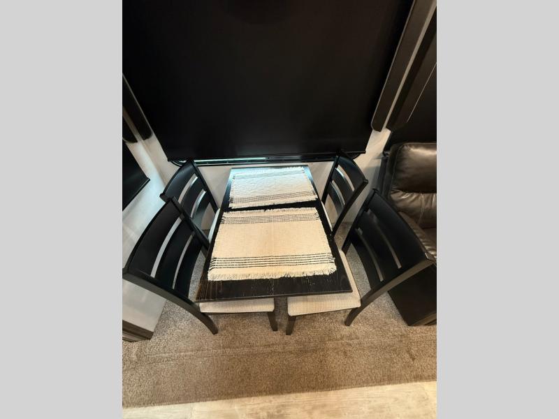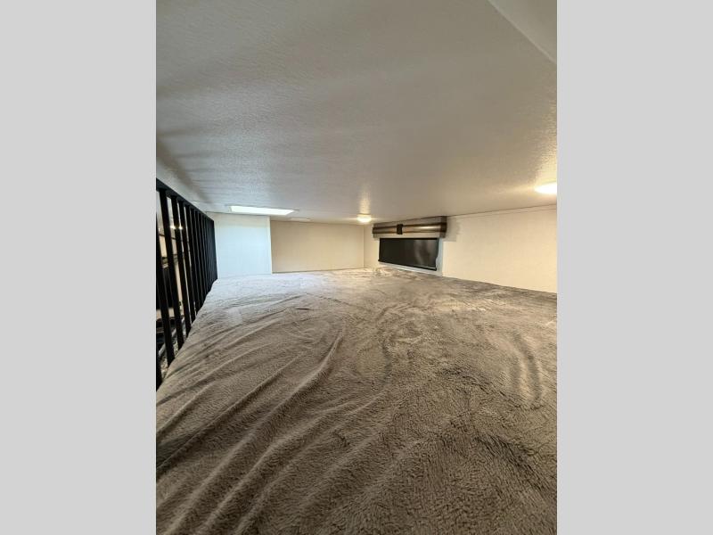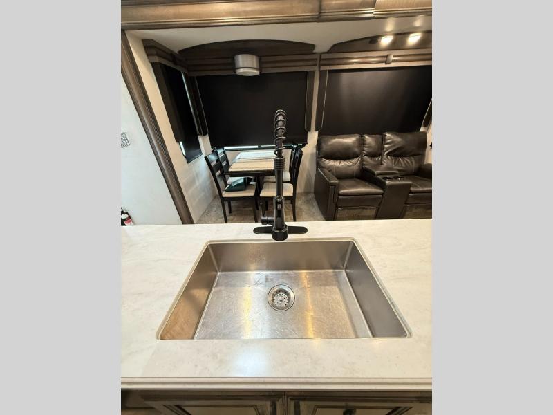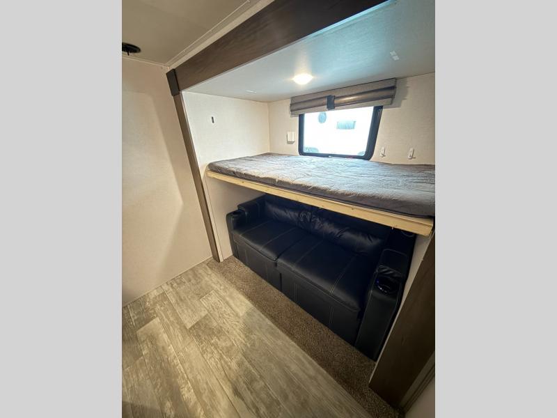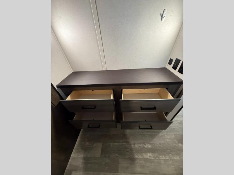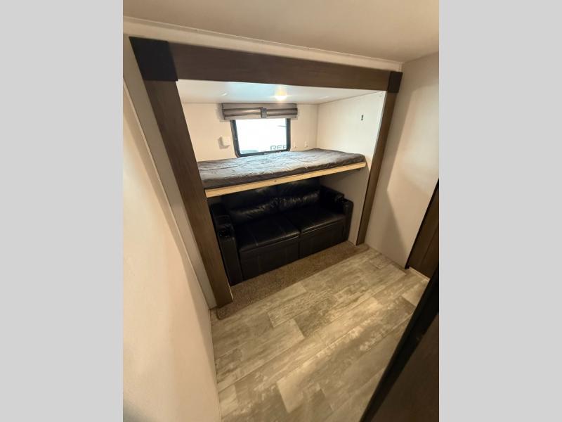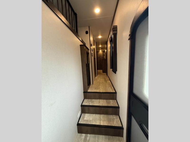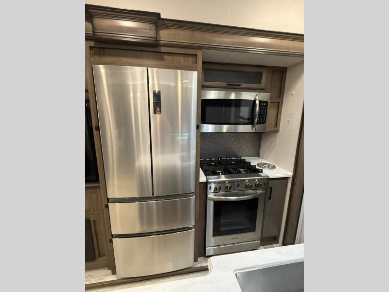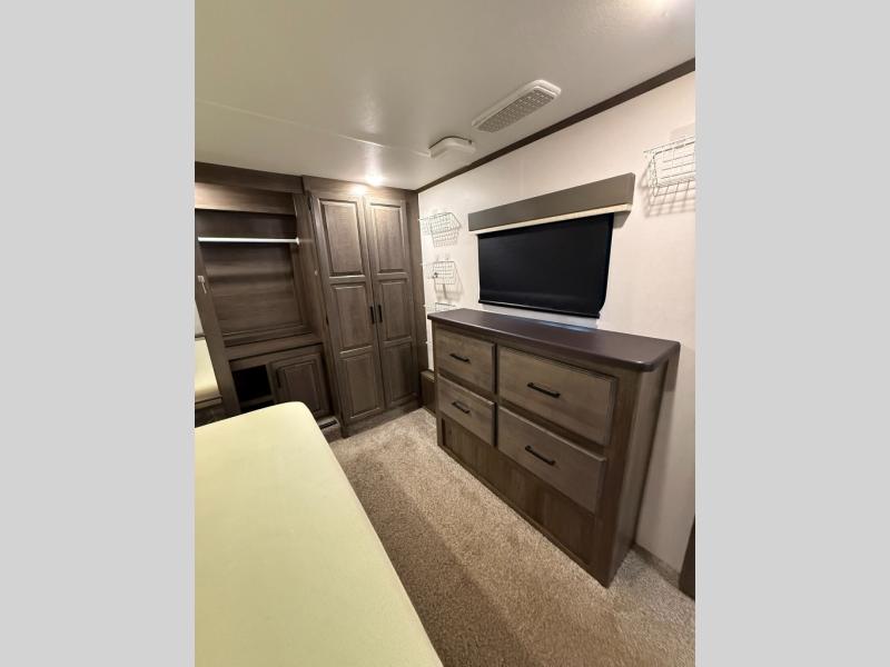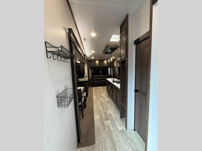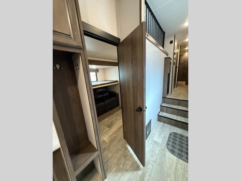 If you've been looking for the perfect fifth wheel for your family, choose this unit that can sleep eight people each night. Your guests will have the mid-bunk room all to themselves with a jackknife sofa and a flip-up bunk above, a dresser for their clothes, and a convenient half bath! The loft is sure to be a fun addition for the kids, and you and your spouse will enjoy the front private bedroom with a slide out king bed for your comfort. Everyone can meet in the rear living area that includes a hide-a-bed sofa, theater seats, and a free-standing dinette for game night. The chef of the family will have plenty of counter space for prepping meals on the island peninsula, and the Furrion oven and cooktop can heat up any casseroles they have prepared. If the weather is nice, you may just want to head outdoors to cook dinner on the outside kitchen, and the smart arm electric awning with LED lights will provide protection from the sun rays!