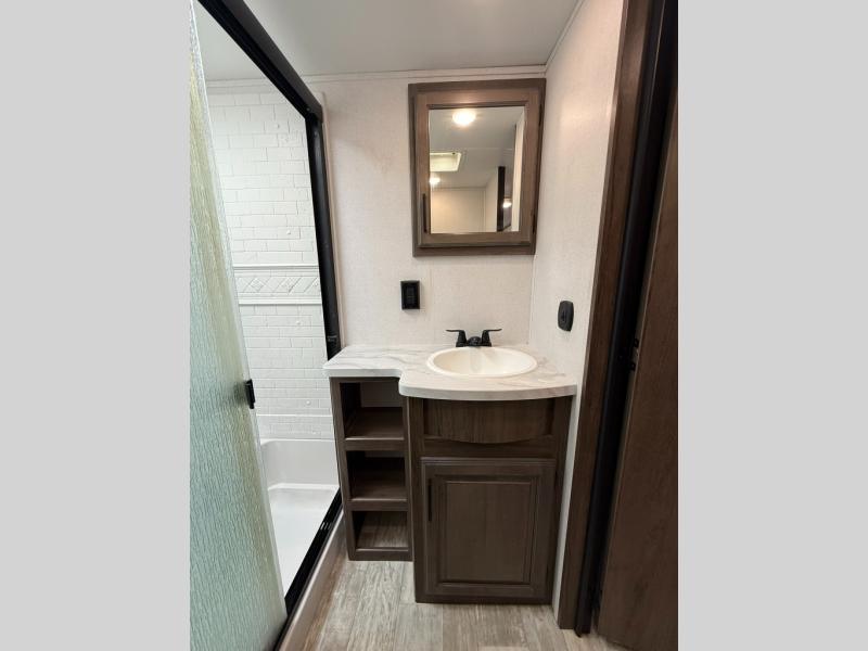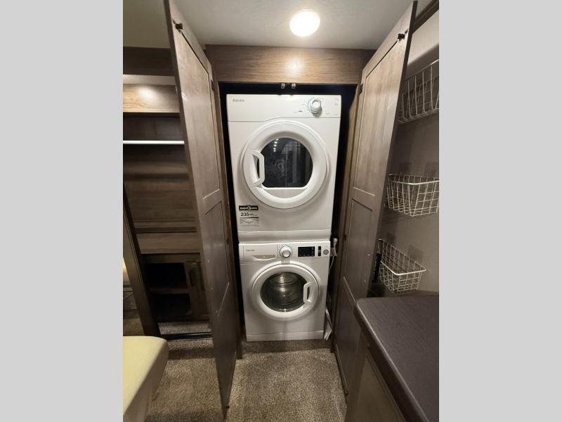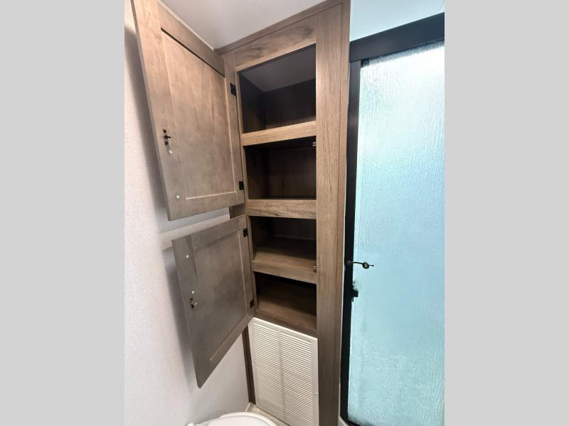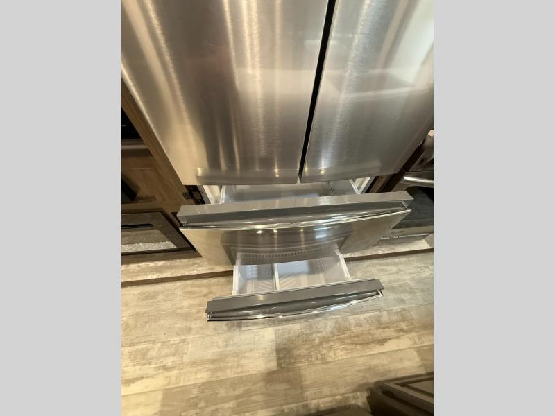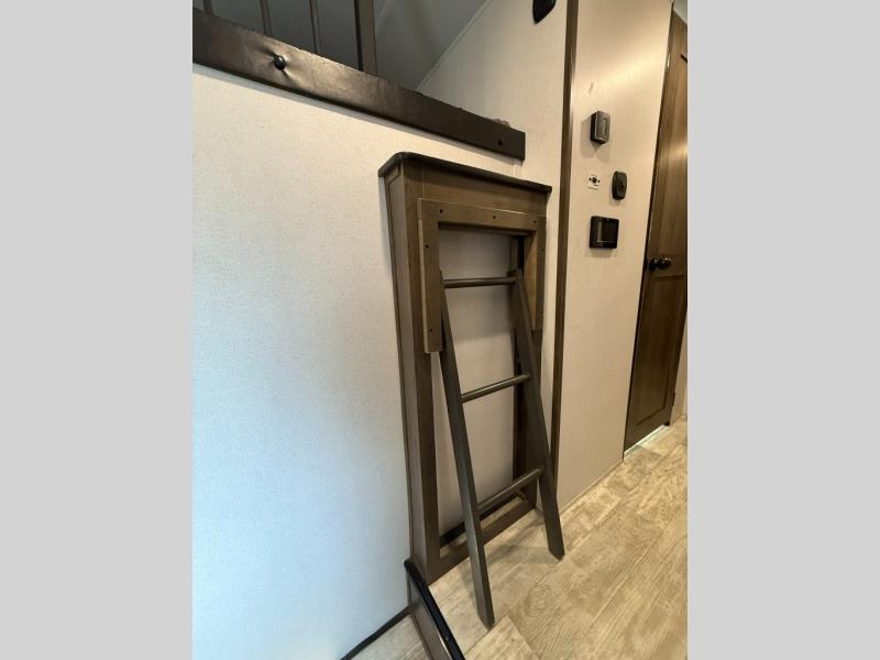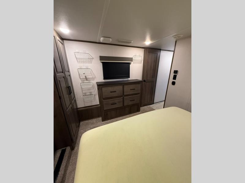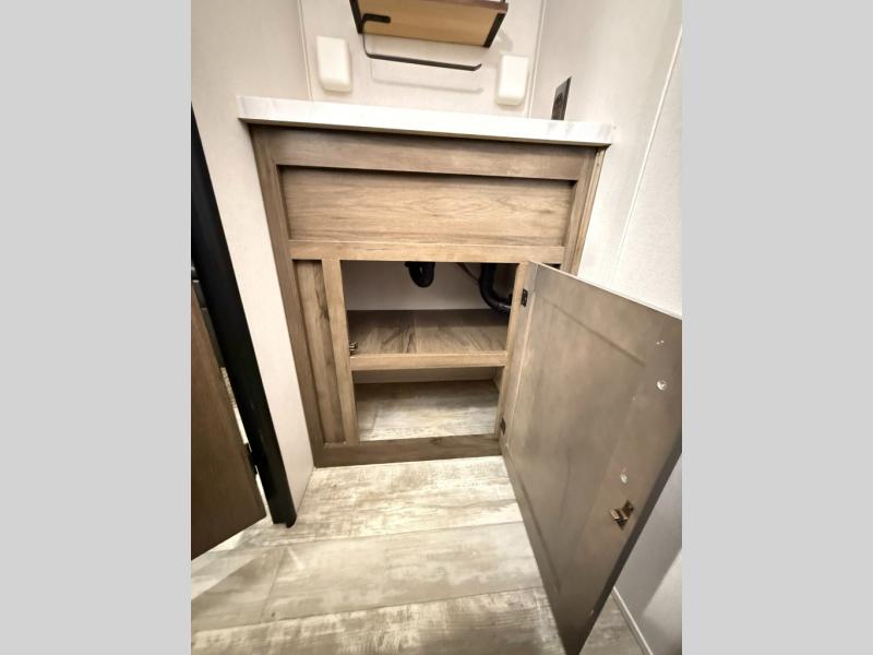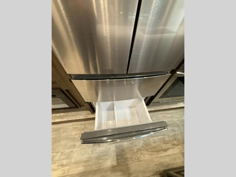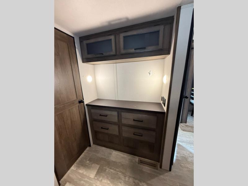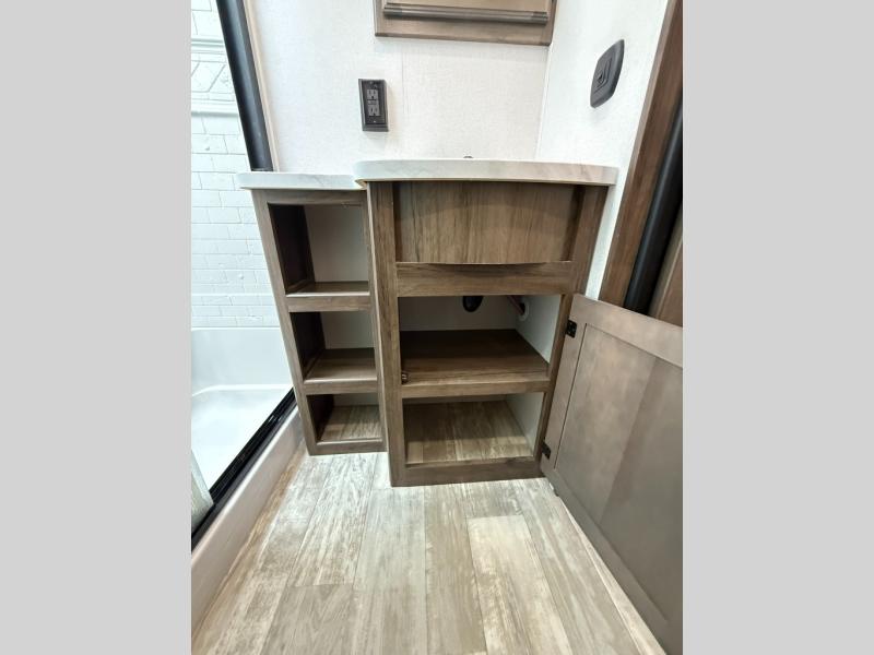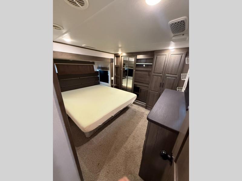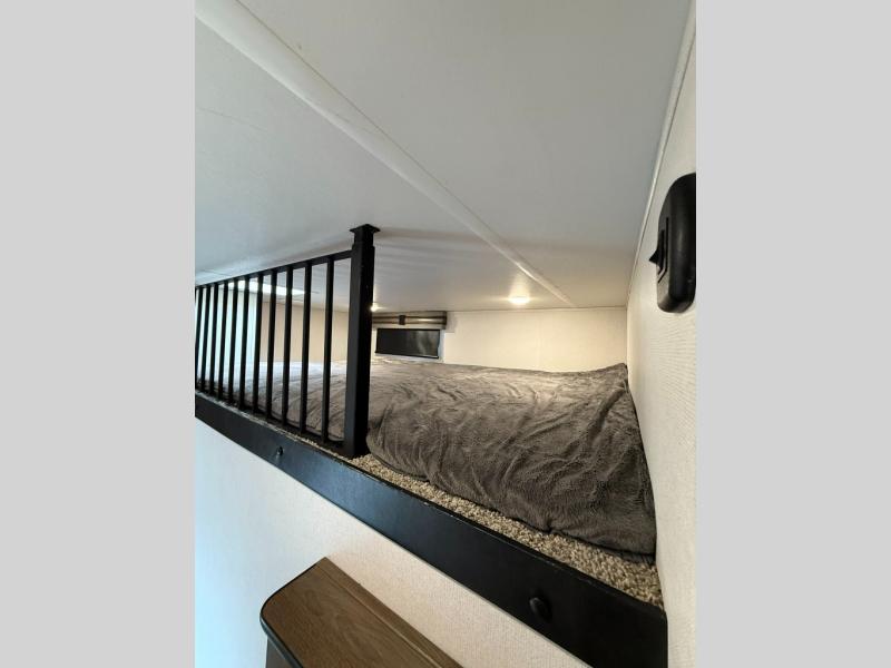 If you've been looking for the perfect fifth wheel for your family, choose this unit that can sleep eight people each night. Your guests will have the mid-bunk room all to themselves with a jackknife sofa and a flip-up bunk above, a dresser for their clothes, and a convenient half bath! The loft is sure to be a fun addition for the kids, and you and your spouse will enjoy the front private bedroom with a slide out king bed for your comfort. Everyone can meet in the rear living area that includes a hide-a-bed sofa, theater seats, and a free-standing dinette for game night. The chef of the family will have plenty of counter space for prepping meals on the island peninsula, and the Furrion oven and cooktop can heat up any casseroles they have prepared. If the weather is nice, you may just want to head outdoors to cook dinner on the outside kitchen, and the smart arm electric awning with LED lights will provide protection from the sun rays!