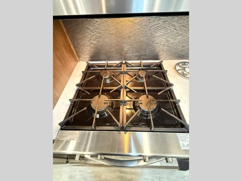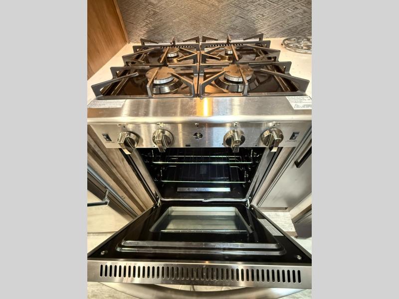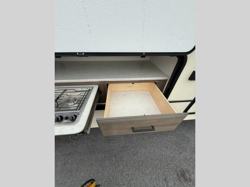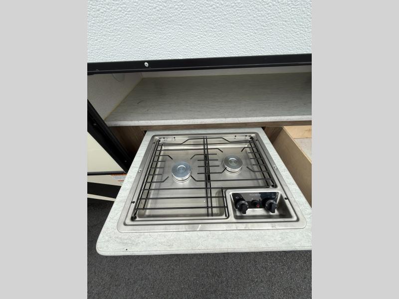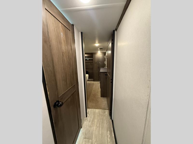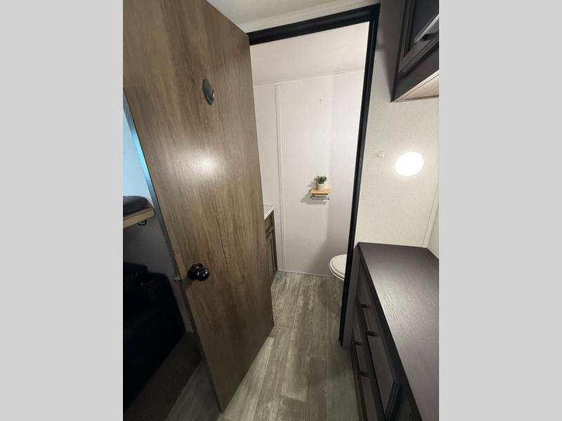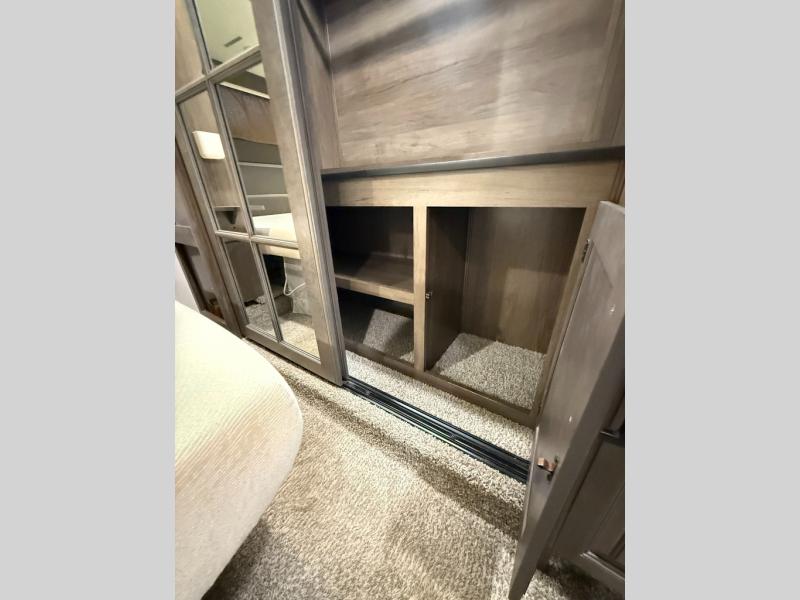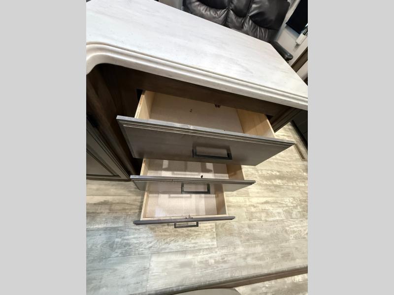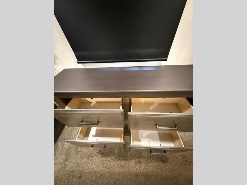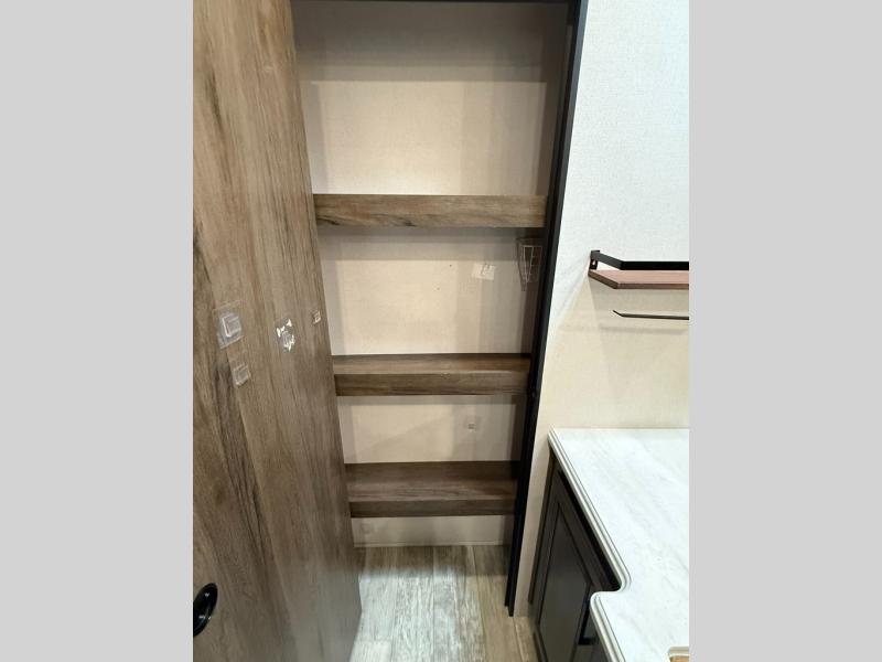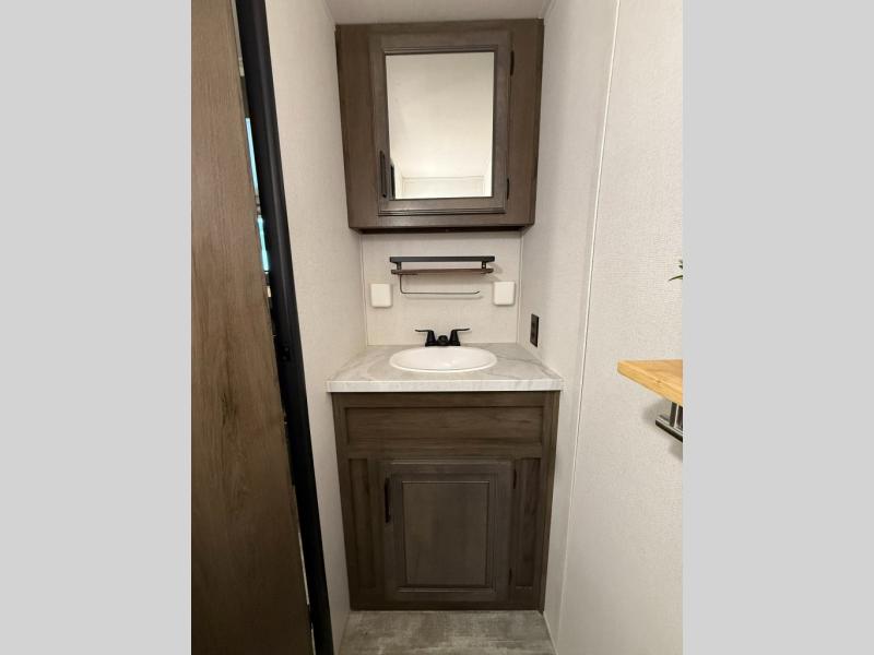 If you've been looking for the perfect fifth wheel for your family, choose this unit that can sleep eight people each night. Your guests will have the mid-bunk room all to themselves with a jackknife sofa and a flip-up bunk above, a dresser for their clothes, and a convenient half bath! The loft is sure to be a fun addition for the kids, and you and your spouse will enjoy the front private bedroom with a slide out king bed for your comfort. Everyone can meet in the rear living area that includes a hide-a-bed sofa, theater seats, and a free-standing dinette for game night. The chef of the family will have plenty of counter space for prepping meals on the island peninsula, and the Furrion oven and cooktop can heat up any casseroles they have prepared. If the weather is nice, you may just want to head outdoors to cook dinner on the outside kitchen, and the smart arm electric awning with LED lights will provide protection from the sun rays!