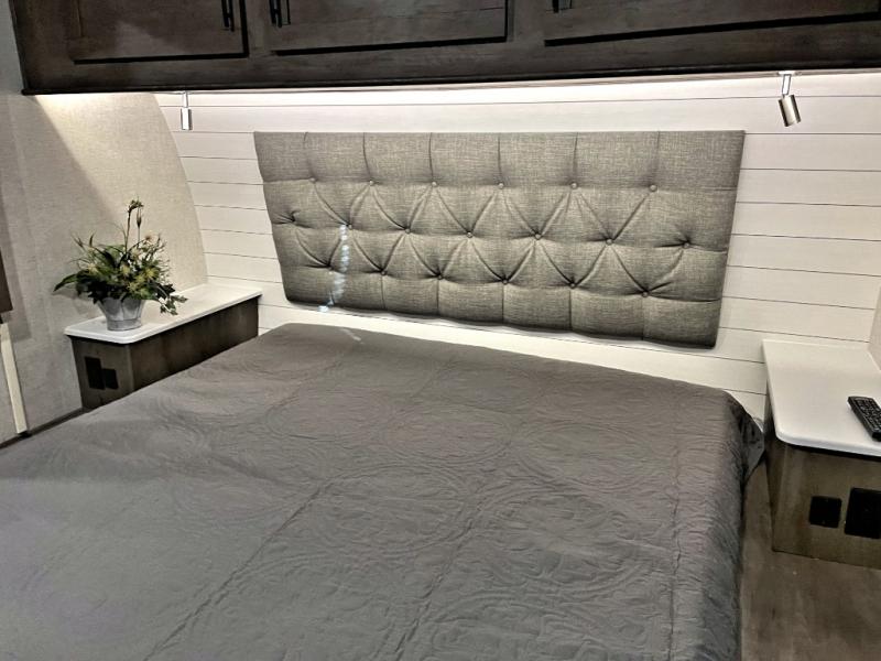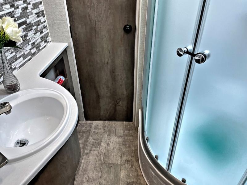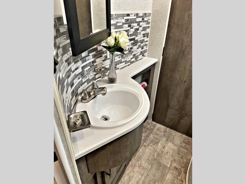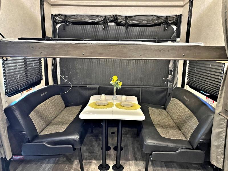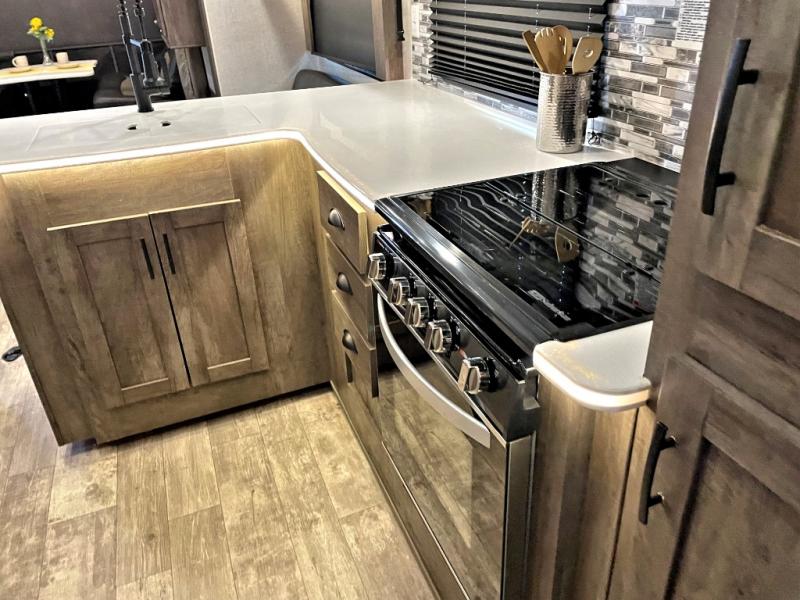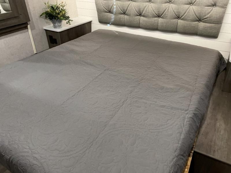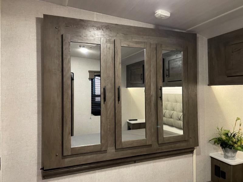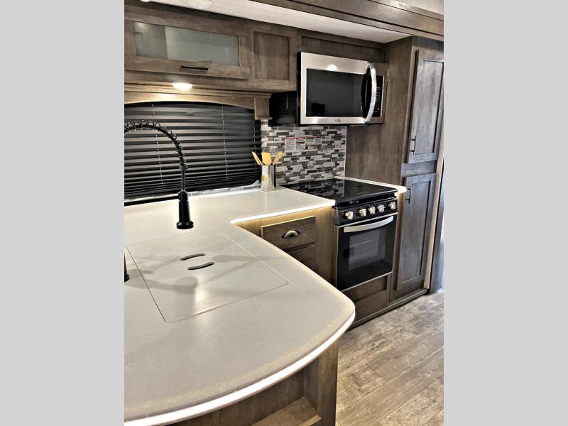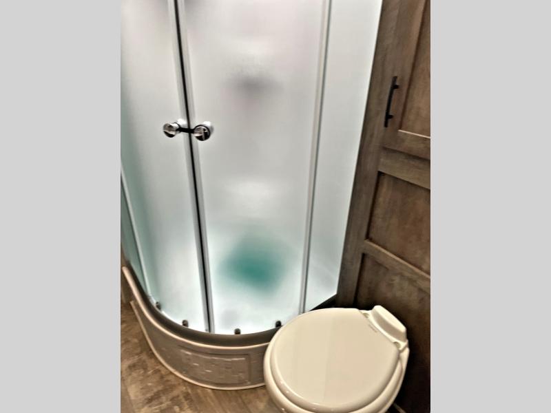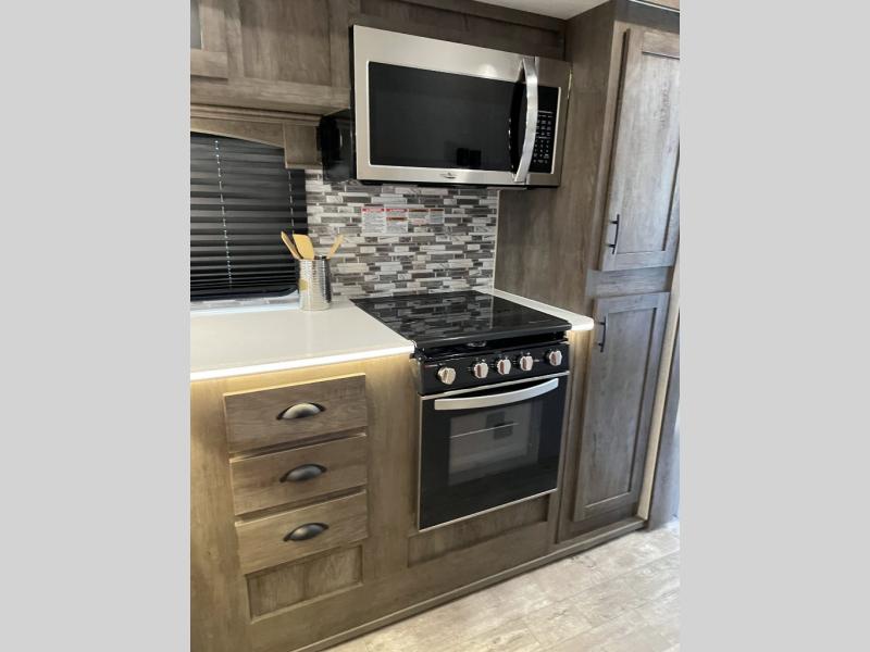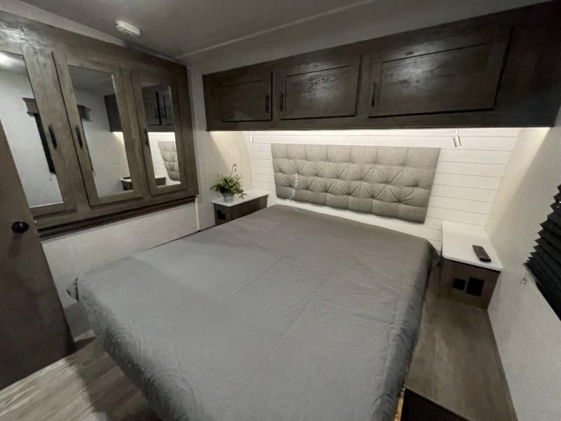 Step inside this travel trailer for a riding weekend you won't soon forget! It will feel just like home with its master bedroom that includes a king bed for maximum comfort. You will have plenty of storage for all your clothes in the five wardrobes, plus there are overhead compartments throughout for your belongings. Your guests can choose to sleep on the electric bed, the electric pass-through dinette, or on the flip sofa! Everyone will get a chance to clean up in the dual entry bath after a day of riding, and the chef of the group can prepare dinner on the three burner cooktop. This model also includes an 18' power awning so you can take your plate outside and enjoy dining in the fresh mountain air!
