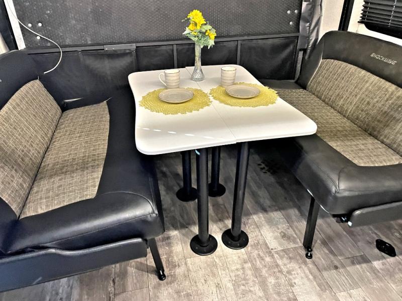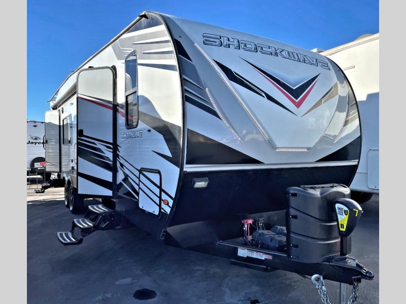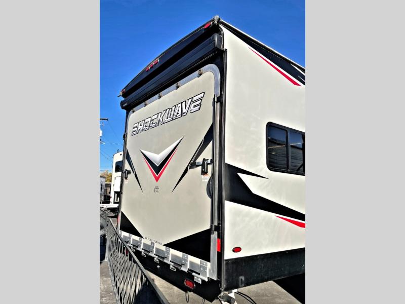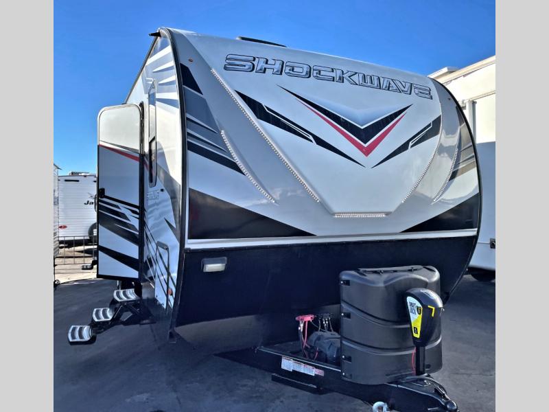Each Forest River Shockwave DX Series and MX Series travel trailer toy hauler includes a wide body construction, super lube axles, plus an outside shower so you can wash off your riding boots. Inside, you'll enjoy the black chef's high-rise spring faucet make clean-up a breeze, and the 13,500 BTU A/C will keep you cool on those hot summer months. Each model also includes a drive on wheel well on the doorside, a 35 gallon fuel station, plus LED marker and clearance lights to make parking your trailer easier than ever.