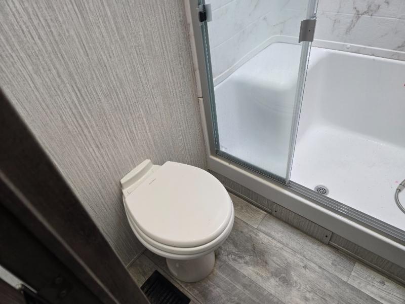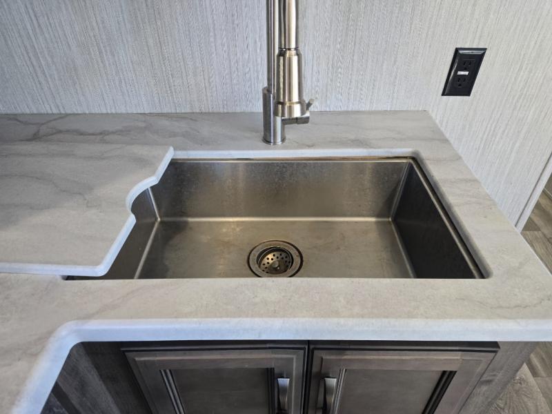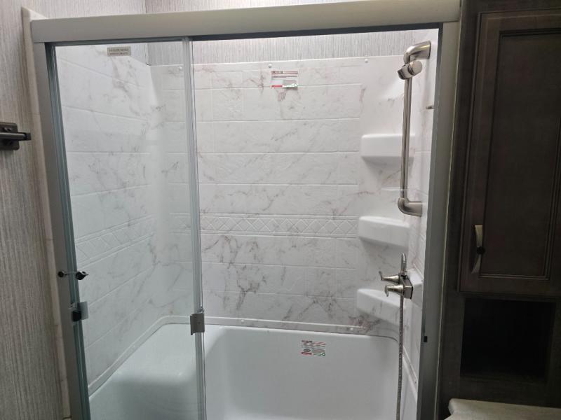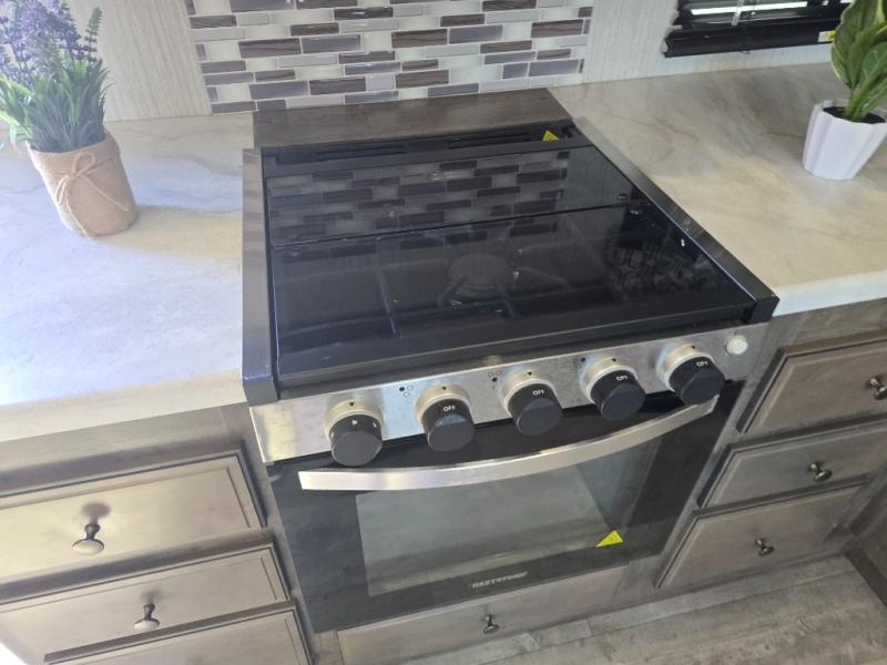 It's time to upgrade from a travel trailer to a fifth wheel and this unit is the one! The separate front living area includes a large entertainment center with a 50" pop-up TV, plus theater seating for all-around comfort. There is even a tri-fold hide-a-bed sofa where the grandkids can sleep if they come along. The chef of the family can prepare meals in the middle kitchen with stainless steel appliances, and there is a free-standing dinette table where you can dine each day. When it's time to turn in for the night, the rear private bedroom with a queen bed will provide a great night's rest, and all your clothes can be stored in the dual wardrobes or dresser with drawers.