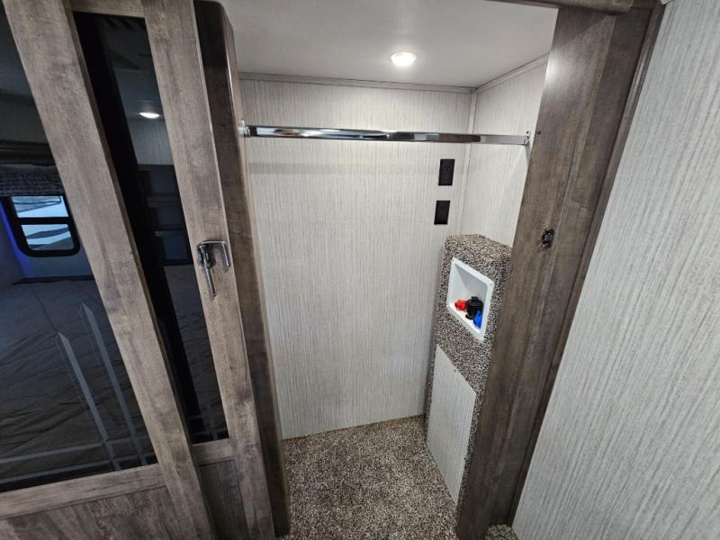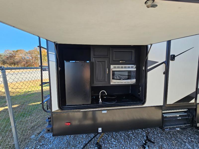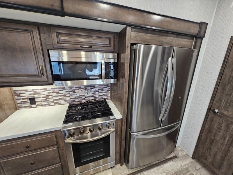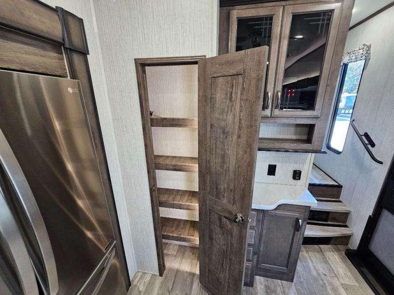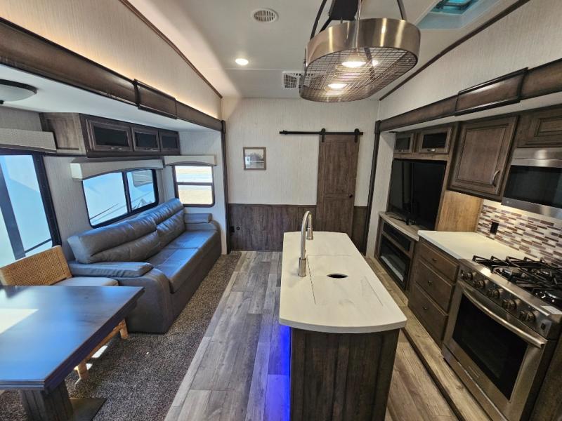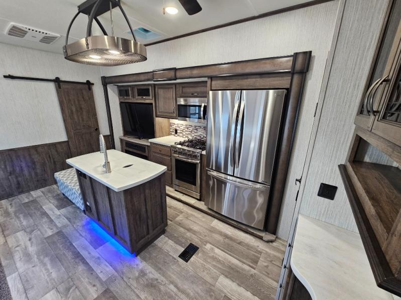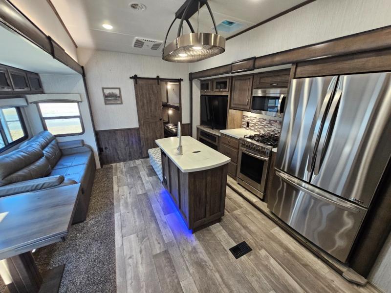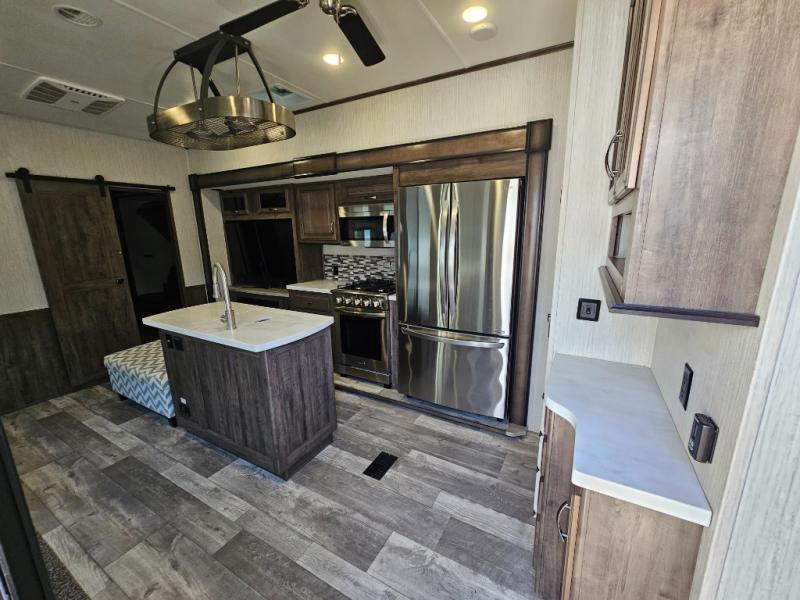 It won't be long before this Sierra fifth wheel has you absolutely hooked! This modern unit has just about everything you could think of: a private bedroom with a king-size bed, a bunkhouse suite with its own half bathroom, a comfortable living area with opposing slides for extra space, and an outdoor kitchen for summertime grilling. Plus, the kitchen is simply wonderful because it comes with many amenities to take the stress out of camp cooking, like a coffee bar, a pantry, an island with pendant lights above, a residential range with four burners, and a residential refrigerator.