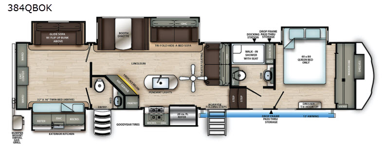 A spacious living and kitchen area allows the whole family to gather for meals at the booth dinette, the tri-fold hide-a-bed sofa and theater seating as well as at the kitchen island to enjoy dining together. Everyone can also find their camping chairs from the drop frame pass-through compartment and place them under the 15' electric awning to dine outdoors. The cook may make several meals using the exterior kitchen and the full amenities inside from the four-burner cooktop to the 20 cu. ft. refrigerator. The half bathroom offers an interior and exterior entry for maximum convenience, and is within the private bunkhouse which includes two bunks, a glide sofa and two floor to ceiling wardrobes. And the master bedroom gives you your own queen bed, a large front wall wardrobe and the full bathroom is only a few steps down the hallway.