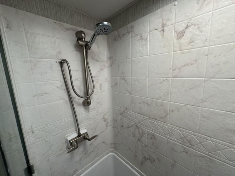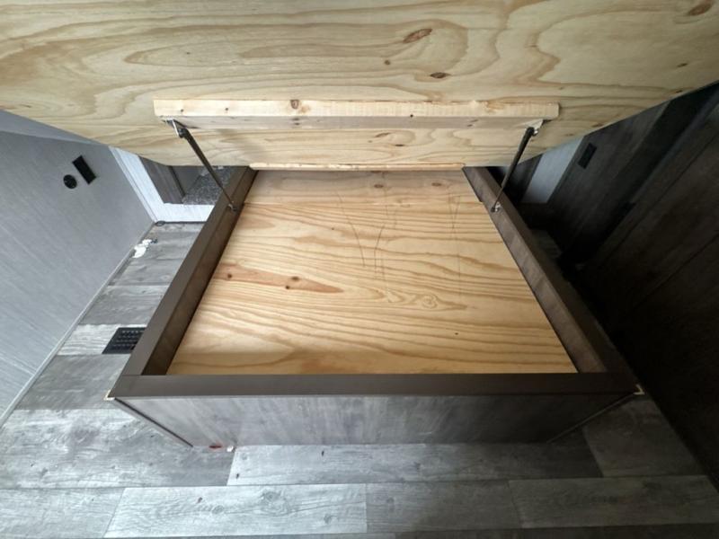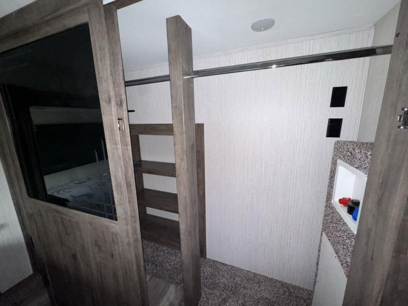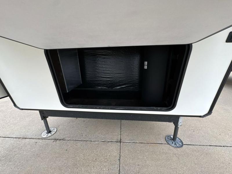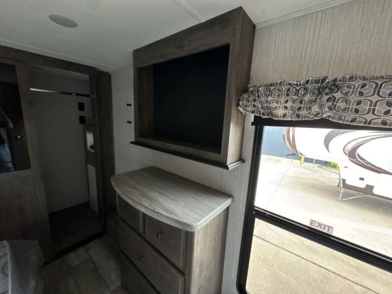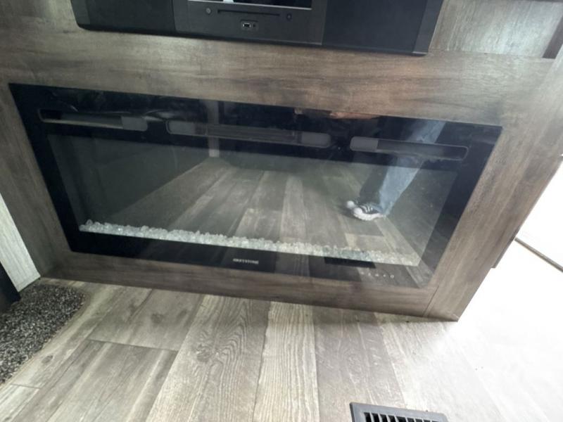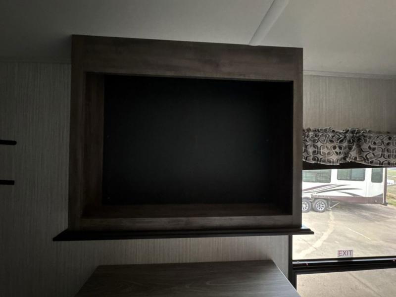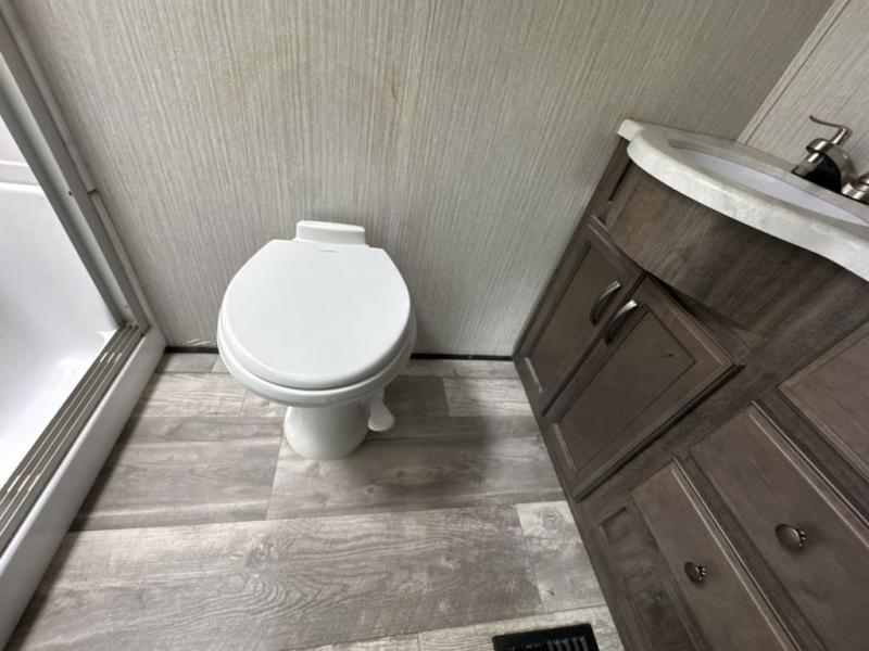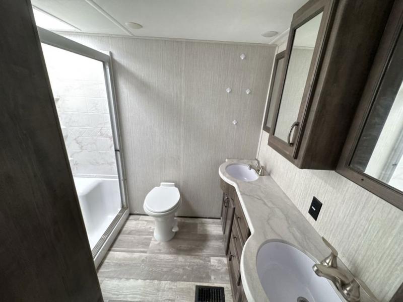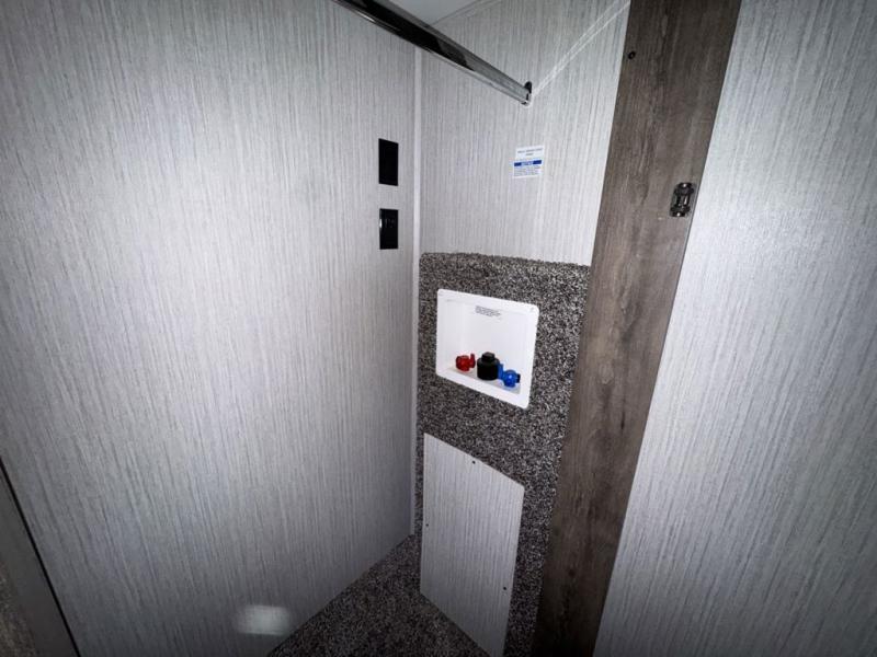 This open concept kitchen gives the cook plenty of space to prepare and serve meals for gatherings for friends and family, plus six people can visit while relaxing on the separate living room furniture which includes dual tri-fold hide-a-bed sofas that double as sleeping space, and a 50" LED HDTV with fireplace below. Some friends might be playing games at the free-standing dinette while they wait for the meal. The large pantry and 20 cu. ft. refrigerator give you even more space for snacks, dry goods and leftovers. You will enjoy having a walk-around king bed slide that gives you plenty of space in the bedroom to get to the full wall wardrobe with shelves, plus there is a space prepped for a washer/dryer option if you would like to add those appliances. And the full bathroom includes a walk-in shower with a seat, plus dual bath sinks so you and your spouse can freshen up at once!