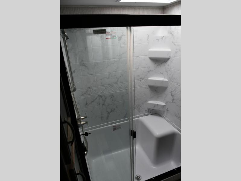 The Platinum Package comes standard with solid surface countertops, dual air conditioners, and a 6-point hydraulic leveling system for quick and stable setup. The Ultimate Kitchen Package enhances daily living with a stainless steel refrigerator paired with a 1,000-watt inverter, a 30" over-the-range stainless microwave, and soft-close cabinet doors and drawers throughout.