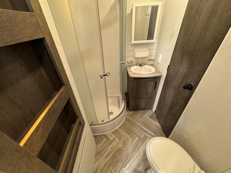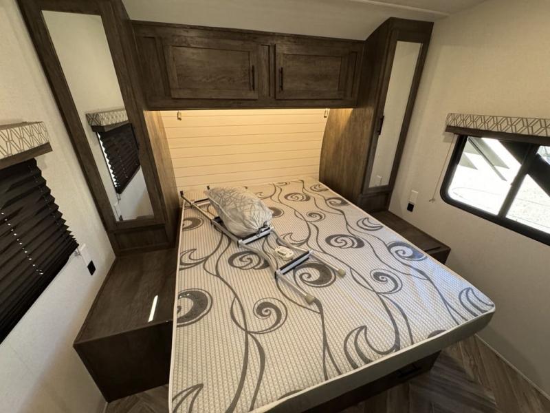 There is 15' 11" of cargo space and 1,200 lb. tie down rings mounted to steel for your off-road toys in this toy hauler! You can prepare your best home cooked meals with the three burner cooktop and enjoy them at the rear electric pass-through dinette. The leftovers can be stored in the 8 cu. ft. refrigerator, and you can relax in either the lounger chairs with a table in between or the sofa slide that comes standard in glass but can be switched to the optional metal. You could even relax on the electric bed above the dinette, the queen bed in the front private bedroom, or even take a hot shower in the dual entry bathroom with the radius glass shower. It also has a fiberglass exterior and front exterior storage for your gear!