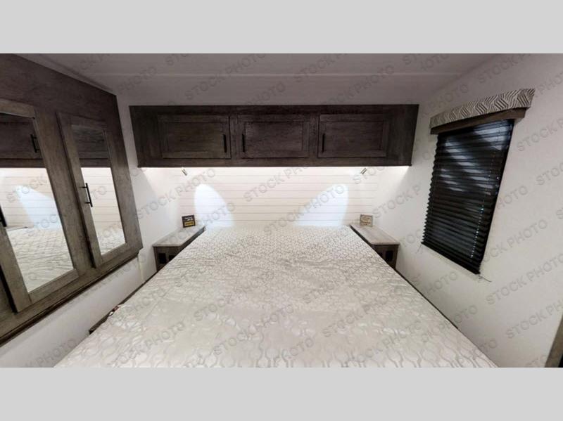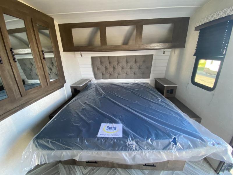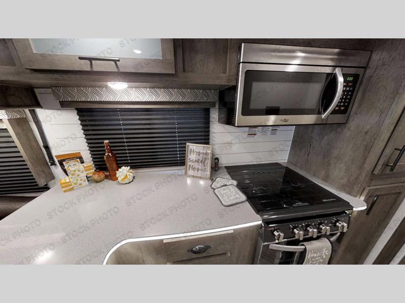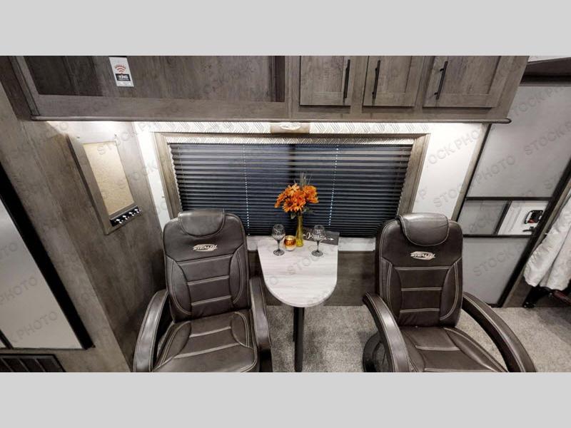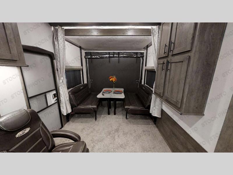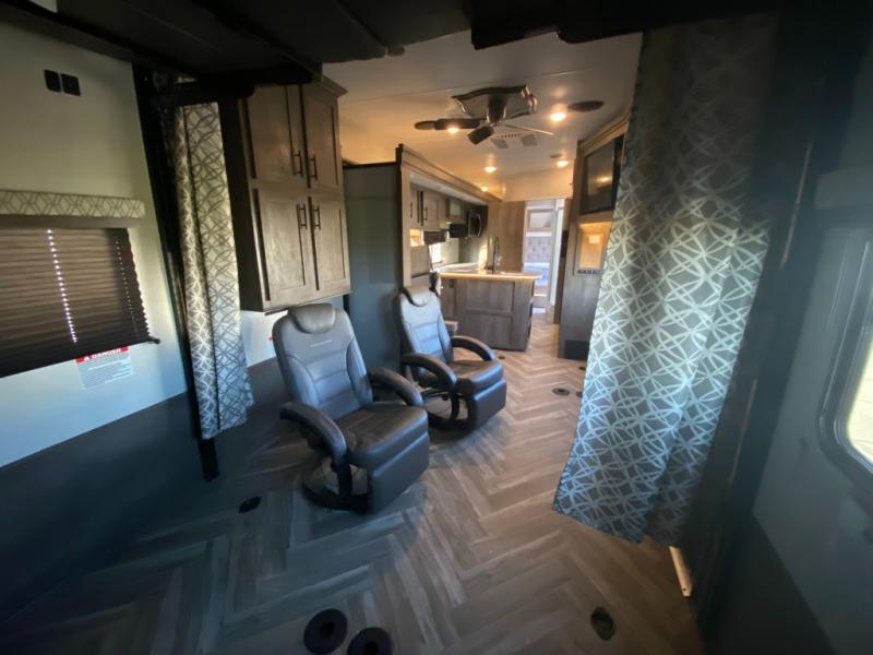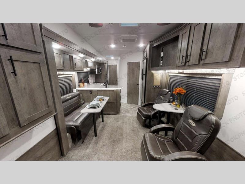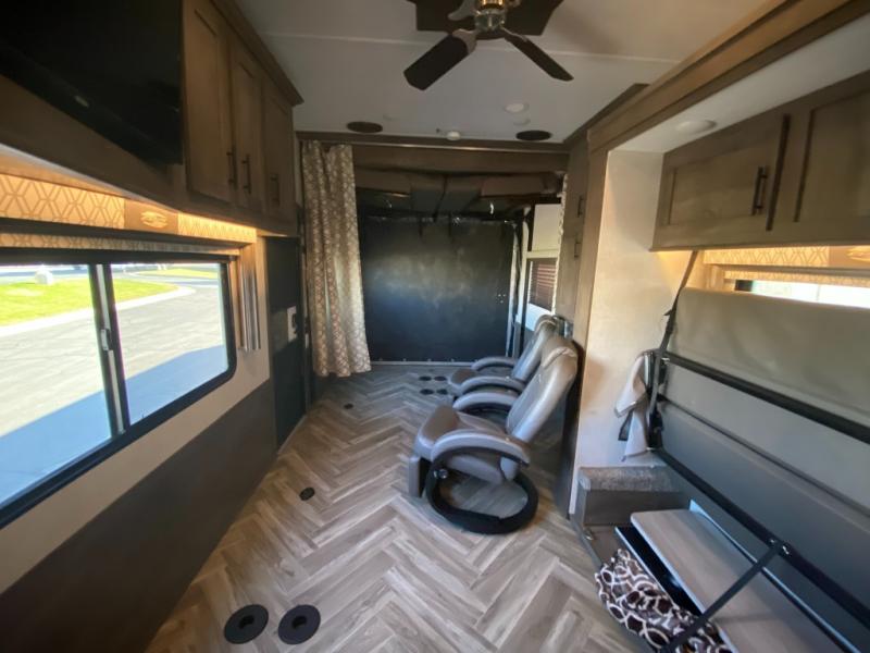 With dual entry doors, you will experience a smooth flow of traffic in and out of this toy hauler! One of the entrances leads directly into the front private bedroom which has a king bed to rest your head on at night, wardrobes on either side of it, and a wardrobe slide to keep your clothes looking there best. You even have an even have an entrance into the dual entry bathroom from the bedroom and hallway by the 12.3 cu. ft. refrigerator. Across from the refrigerator is the rest of the kitchen with plenty of countertop space, a pantry for everyone's favorite snacks, a three burner cooktop, and an undermount single bowl chef's sink with lids to make clean up a breeze. A few other features you will enjoy about this unit is its fiberglass exterior, lounge chairs with table, flip sofa with table, and electric pass-through dinette with electric bed above it!