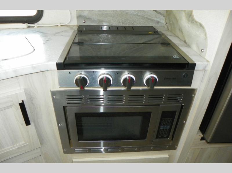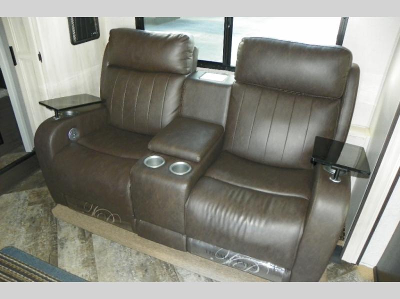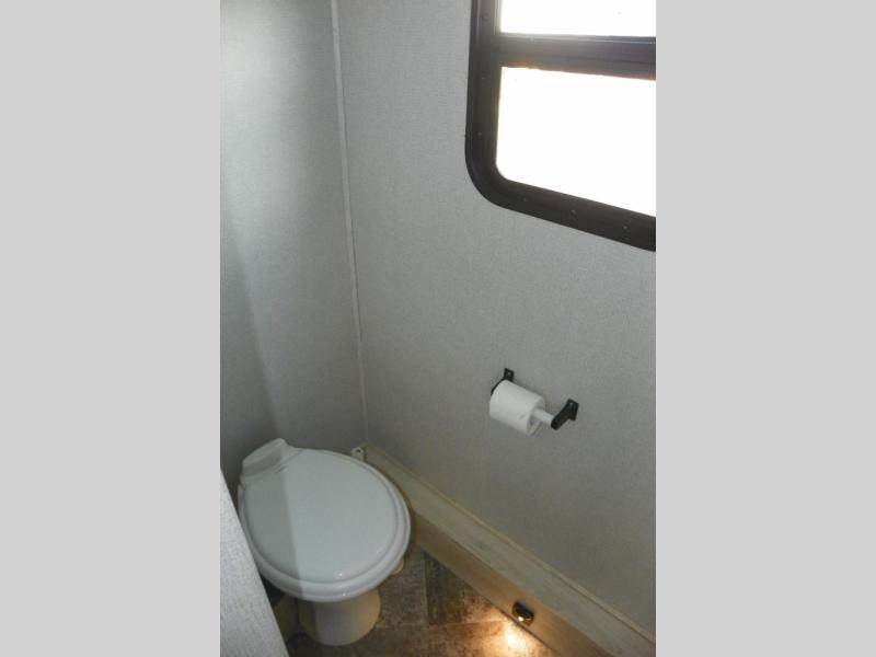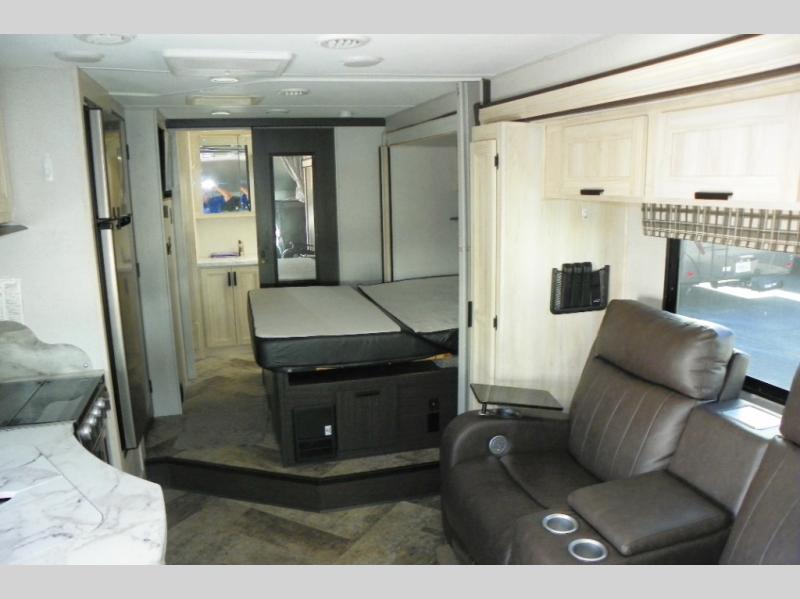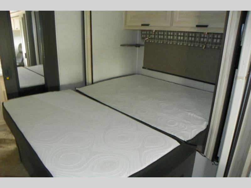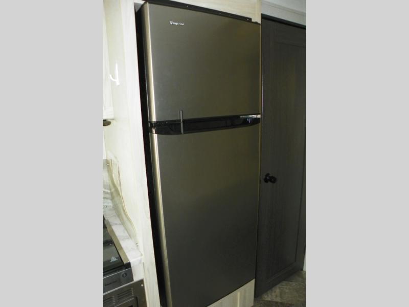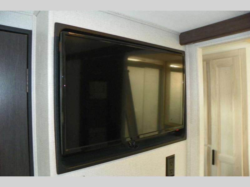 A lot of convenience has been packed into this coach with the full rear bathroom, the master suite, a complete kitchen, two TVs, and a bunk above the cab. An added bonus is the U-shaped dinette which can serve as a dining space or sleeping space depending on how you have it set up. If you don't need the bunk above cab for sleeping space, you could change it out for the optional Trekker cap with built-in entertainment center and storage. The kitchen is equipped with all of your favorites: a pantry, a convection microwave, a three-burner range, a flip-up countertop, and a 10.7-cubic foot refrigerator.
