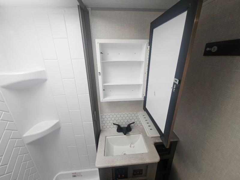 For a truly fun and relaxing camping trip, choose this Surveyor Legend Sub-4,000LB travel trailer that includes bunk beds for the kids. The queen bed at the front of the trailer is just the right size for a good night's rest. Everyone can gather at the booth dinette within the slide out for a meal together, and the dinette can also transform into an extra sleeping space at night. This trailer includes multiple overhead compartments and an exterior pass-through storage for your larger camping gear. After a long day of exploring, clean up in the full bath before heading outside to sit under the 15' electric awning with family or use the outdoor kitchen to create something delicious.