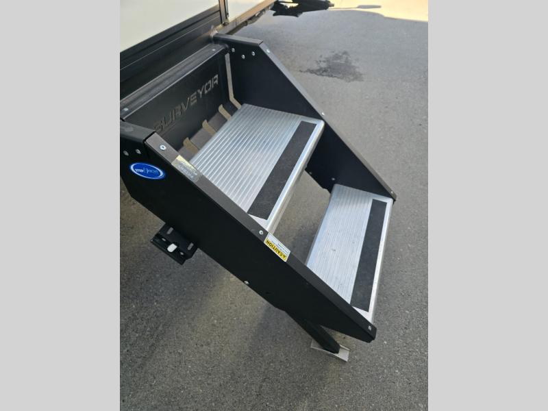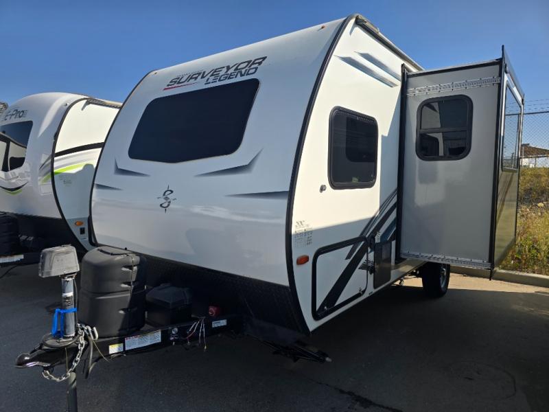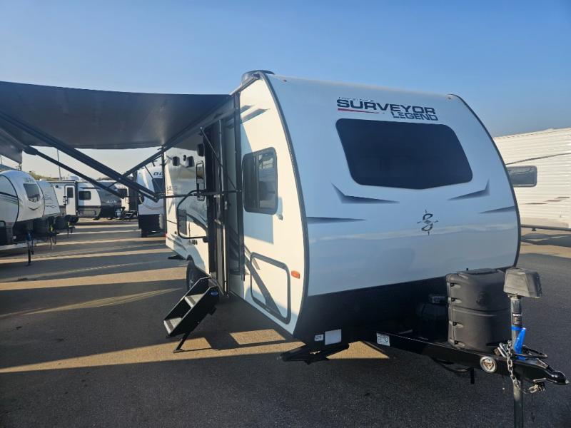 Only the Forest River Surveyor Legend travel trailer can inspire legendary adventures! The gel-coated fiberglass exterior is outfitted with front diamond plate protection, an integrated front windshield, preparations for rooftop solar power and a rear camera, and an adjustable platform step on the main entry. You'll be able to use the exterior LED speakers whenever you want to play music or a podcast, and the designer Shaw linoleum flooring is a quality base that will clean up easily if you track mud indoors. There are vented side windows in the slide outs so that you can bring in some fresh air, and each model is ready for cable/satellite.
