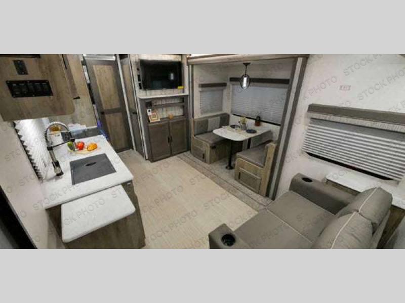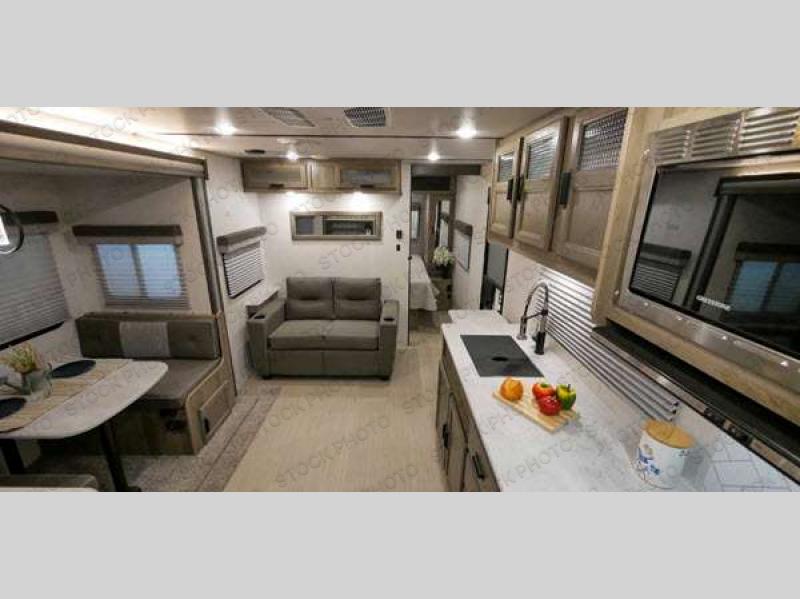 You'll want to take this Surveyor Legend travel trailer to the lake every other weekend, and since it includes a slide out, space will be no worry at all. Set up camp and then have a look around the campground to stretch your legs. When you return, you can prepare lunch at the outside kitchen while the kids set the picnic table. This model also includes a three-burner cooktop and a microwave oven inside to prepare meals, and the chef of the family will appreciate the walk-in pantry for paper goods and snacks. In the evening, the kids can play a game of cards at the booth dinette while you and your spouse relax on the 56" sofa. When it's finally time to call it a night, the front private bedroom with a queen bed will provide a great night's rest, and the kids can convert the furniture for sleeping space.