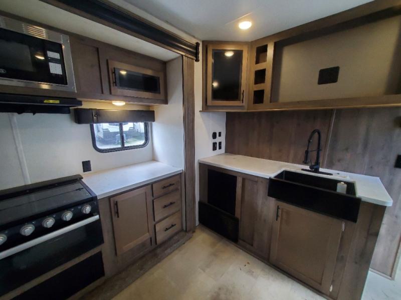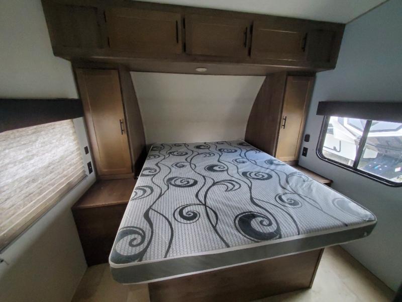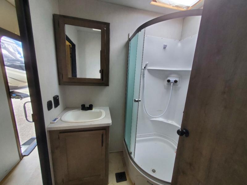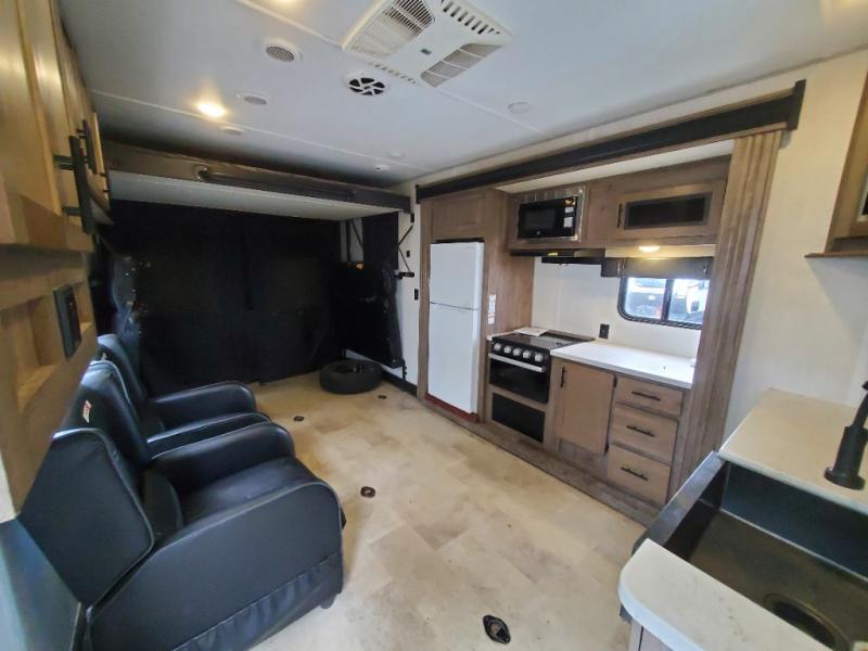 Camping with your favorite ride-on toys is easier than ever in this toy hauler. The 15' total garage space provides tons of space for your gear, plus there is a slide out that will give the chef more room to cook meals. Relax on the roll-overs sofas or add the optional lounge chairs for a more at-home feel. There is plenty of counter space in the kitchen, plus a pantry for snacks or dry goods. You will appreciate the dual entry bath that will give you a private entrance into the front bedroom. Here, you can sleep soundly on the king bed and store your clothes in the dual wardrobes.
