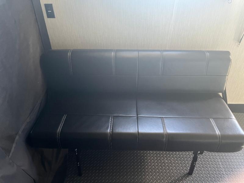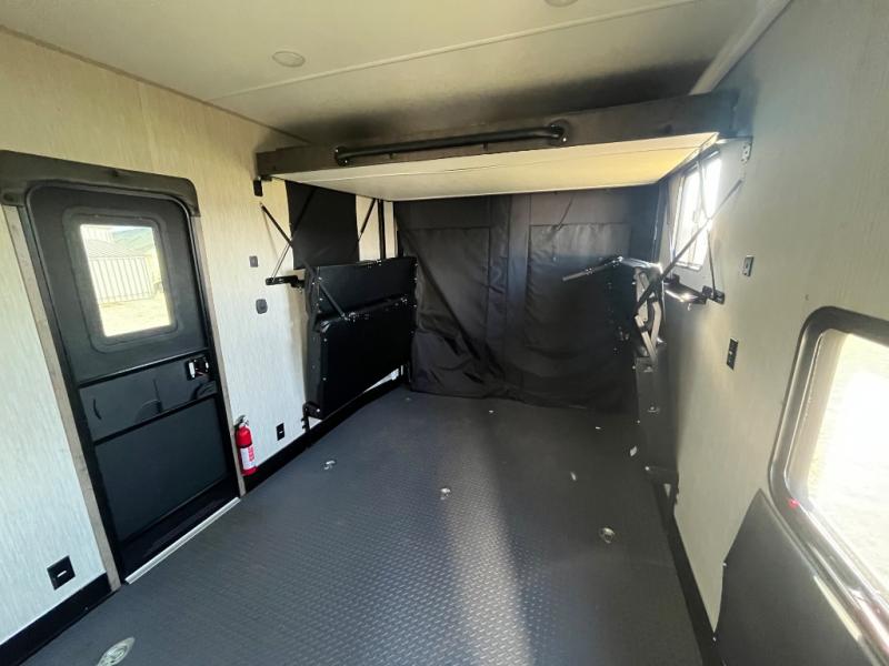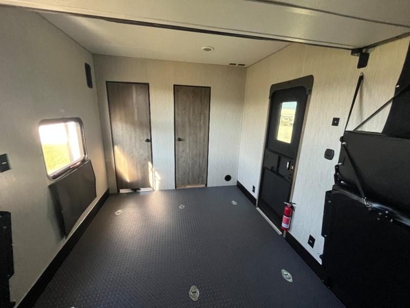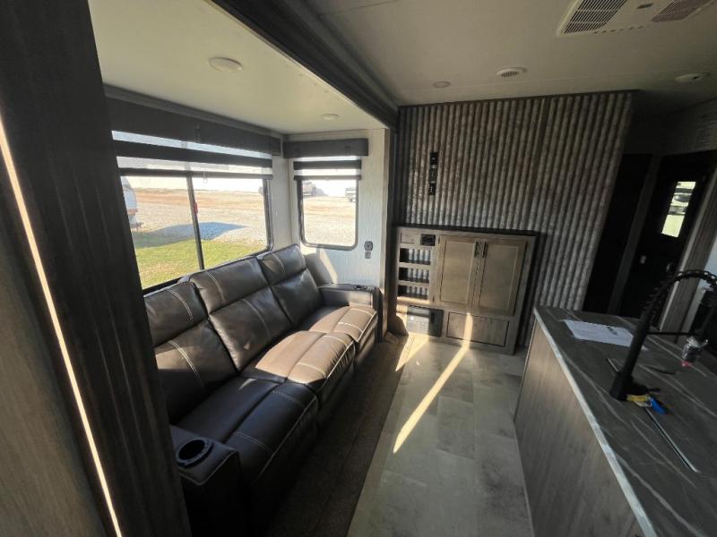 The 12' 6" separate garage in this toy hauler means you don't have to worry about gas and oil in your main living quarters. You can sleep four in the garage with the two roll-over sofas and the quick set queen bed system, plus there is a half bath here for convenience. Head to the main living area where you'll find dual opposing slides for added space, a large pantry to store snacks galore, and a sofa with a table where you can enjoy your coffee at each morning. The full bath has its own private entrance into the front bedroom where you'll enjoy the Rogue king bed and dual wardrobes to keep your clothes wrinkle-free!
