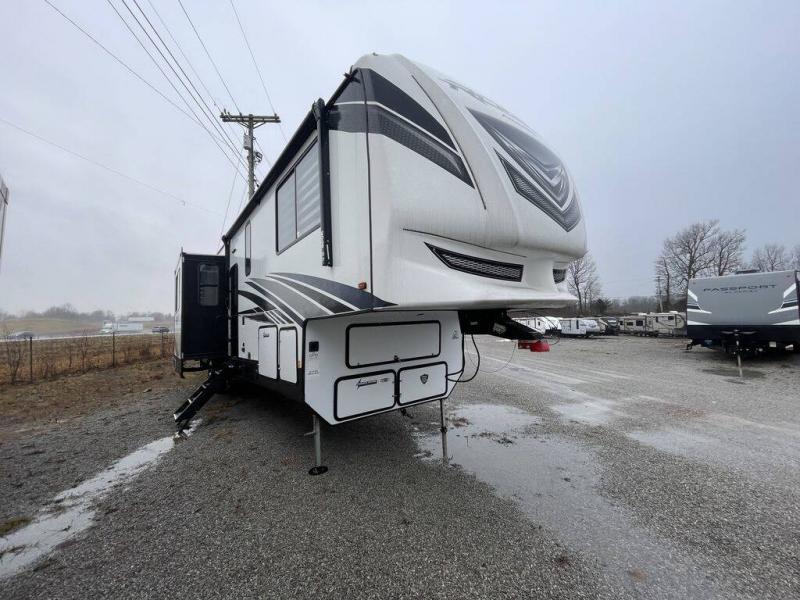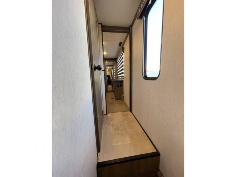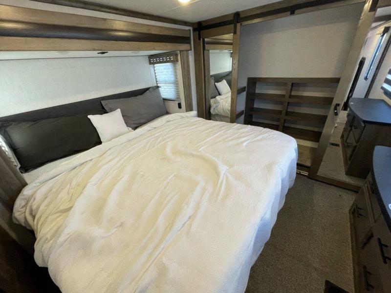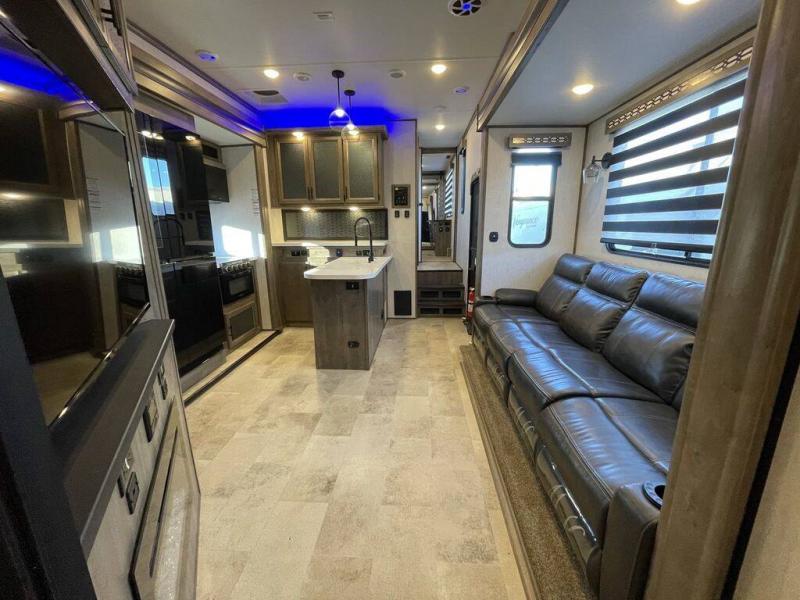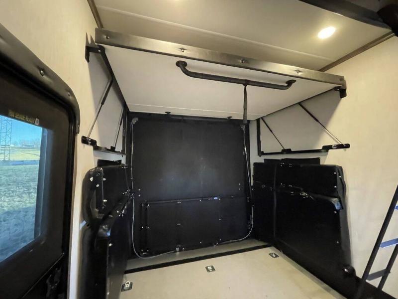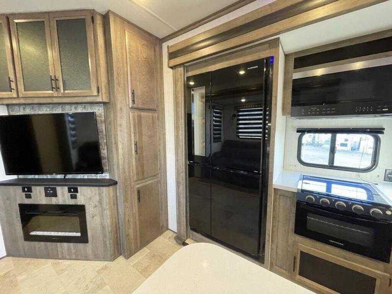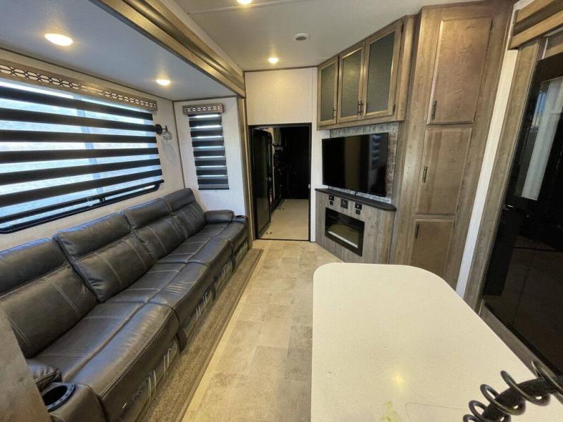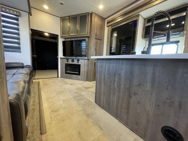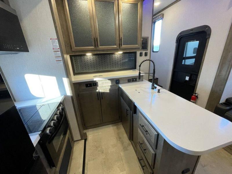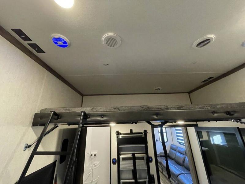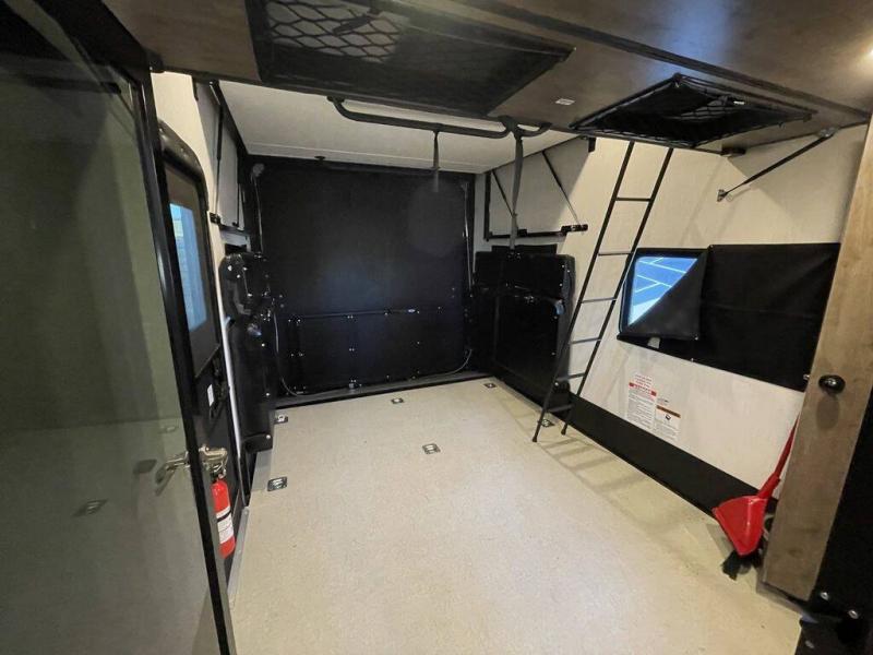 Everyone will stay clean with a bath and a half in this fifth wheel toy hauler! It was rated "fifth wheel of the year" by RV News for 2021 too. The front private bedroom has a 72" x 80" king bed slide to lay your head on at night, a front wall wardrobe, and a dresser to keep your clothes looking nice, plus an entrance into the dual entry bathroom. The kitchen has plenty of countertop space to prepare your meals and a refrigerator to store any leftovers. The garage area has a loft, opposing flip-up sofas with a table in between and a raised queen bed above them, as well as an entrance and an area prepped to add an optional washer and dryer!
