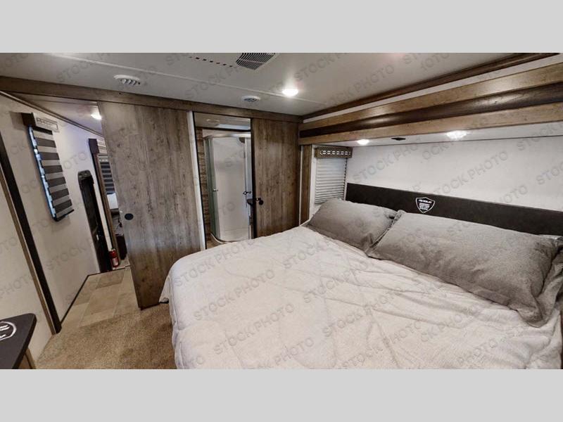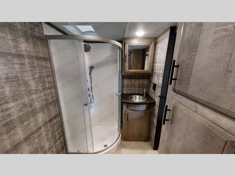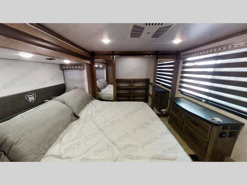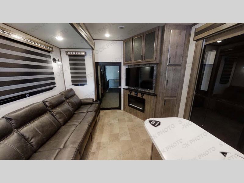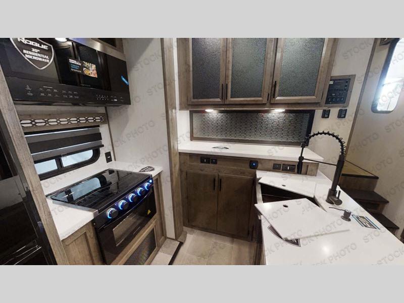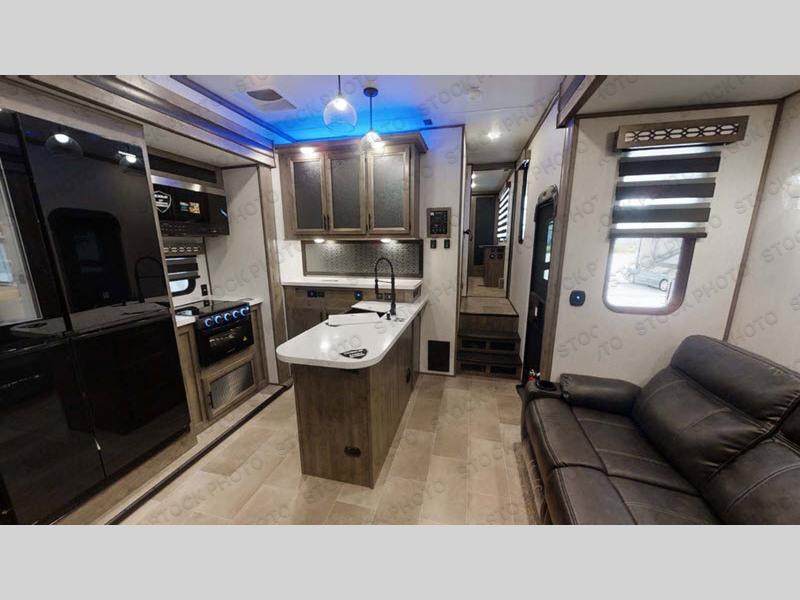 Everyone will stay clean with a bath and a half in this fifth wheel toy hauler! It was rated "fifth wheel of the year" by RV News for 2021 too. The front private bedroom has a 72" x 80" king bed slide to lay your head on at night, a front wall wardrobe, and a dresser to keep your clothes looking nice, plus an entrance into the dual entry bathroom. The kitchen has plenty of countertop space to prepare your meals and a refrigerator to store any leftovers. The garage area has a loft, opposing flip-up sofas with a table in between and a raised queen bed above them, as well as an entrance and an area prepped to add an optional washer and dryer!