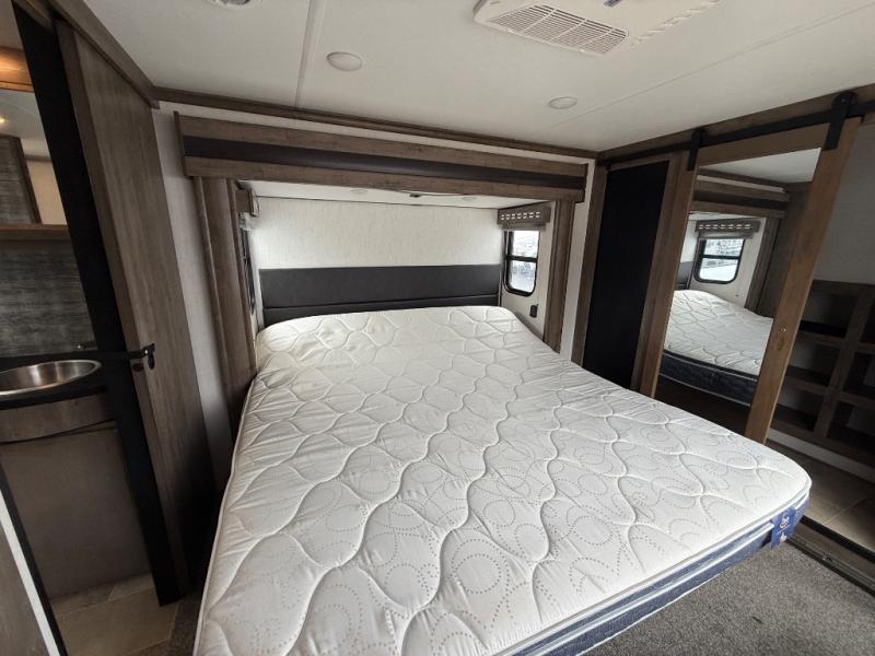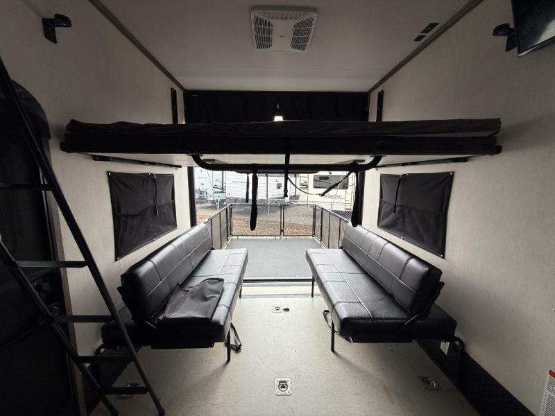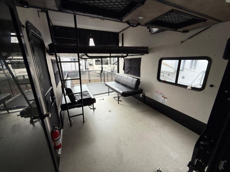 Everyone will stay clean with a bath and a half in this fifth wheel toy hauler! It was rated "fifth wheel of the year" by RV News for 2021 too. The front private bedroom has a 72" x 80" king bed slide to lay your head on at night, a front wall wardrobe, and a dresser to keep your clothes looking nice, plus an entrance into the dual entry bathroom. The kitchen has plenty of countertop space to prepare your meals and a refrigerator to store any leftovers. The garage area has a loft, opposing flip-up sofas with a table in between and a raised queen bed above them, as well as an entrance and an area prepped to add an optional washer and dryer!