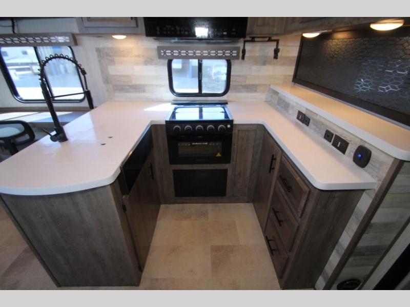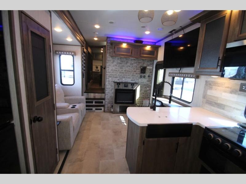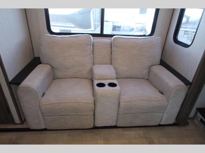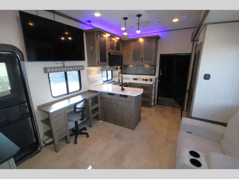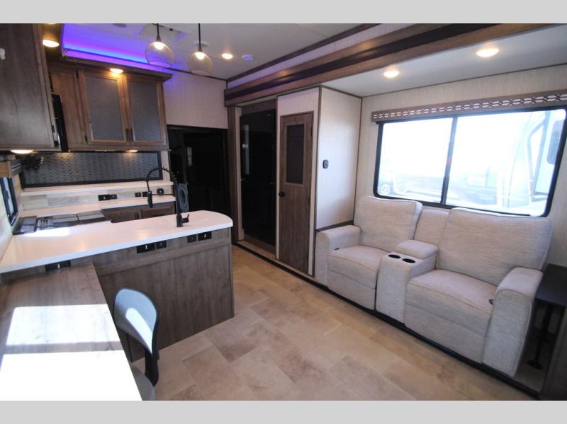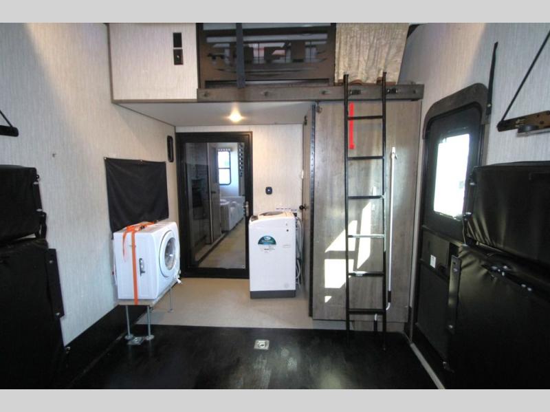 With dual entry doors, you will experience a smooth flow of traffic in and out of this fifth wheel toy hauler! The middle kitchen/living area is set up perfectly for the chef to prepare a delicious meal while others socialize with them at the dinette with a bench or the sofa. You could even prepare breakfast at the outdoor kitchen to enjoy the beautiful sunrise. The 13' garage area has opposing flip-up sofas with a table in between and a raised queen bed above, as well as a loft and a half bathroom. The front private bedroom has king bed for a good night's rest, a wardrobe/dresser slide, and an entrance into the dual entry bathroom!