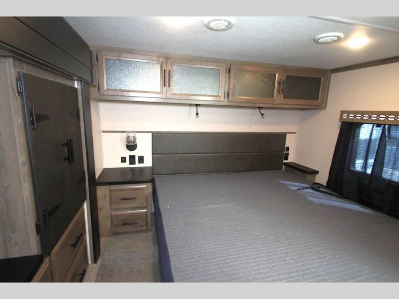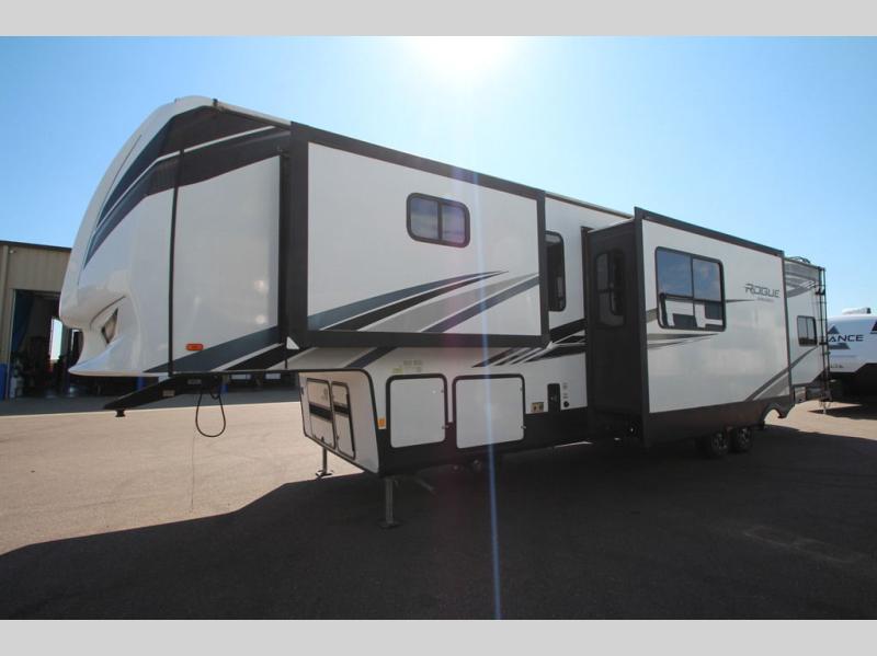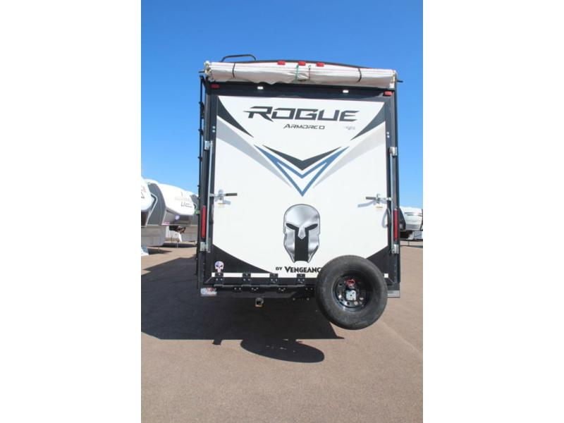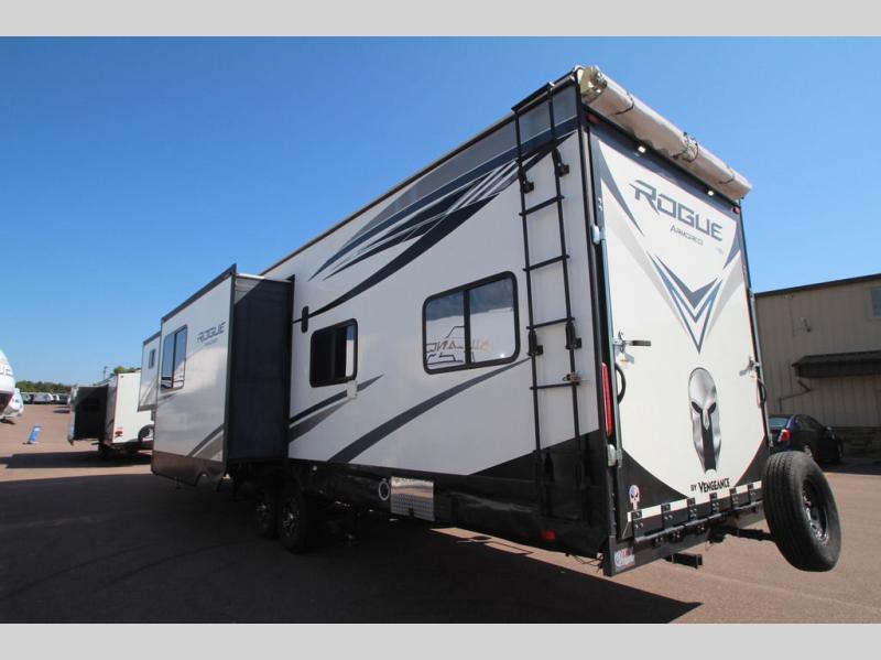Every one of these Forest River Vengeance Rogue Armored fifth wheel toy haulers come with the features you want most at an affordable price tag! The DUR-A-POXY cargo floor has 5,000 lb. tie downs to ensure your toys will arrive safely without damaging the flooring, plus the 8' ramp door makes it easy to load them. A 15,000 BTU air conditioner will keep you cool even on the hottest summer days. An enclosed and heated underbelly keeps your unit's vitals protected and a central docking station makes life a little easier. The Rogue Armored package comes with a six point leveling system, a comfort plus adjustable powered king bed system, and a ramp door patio system. You can be sure to find one that fits your needs!